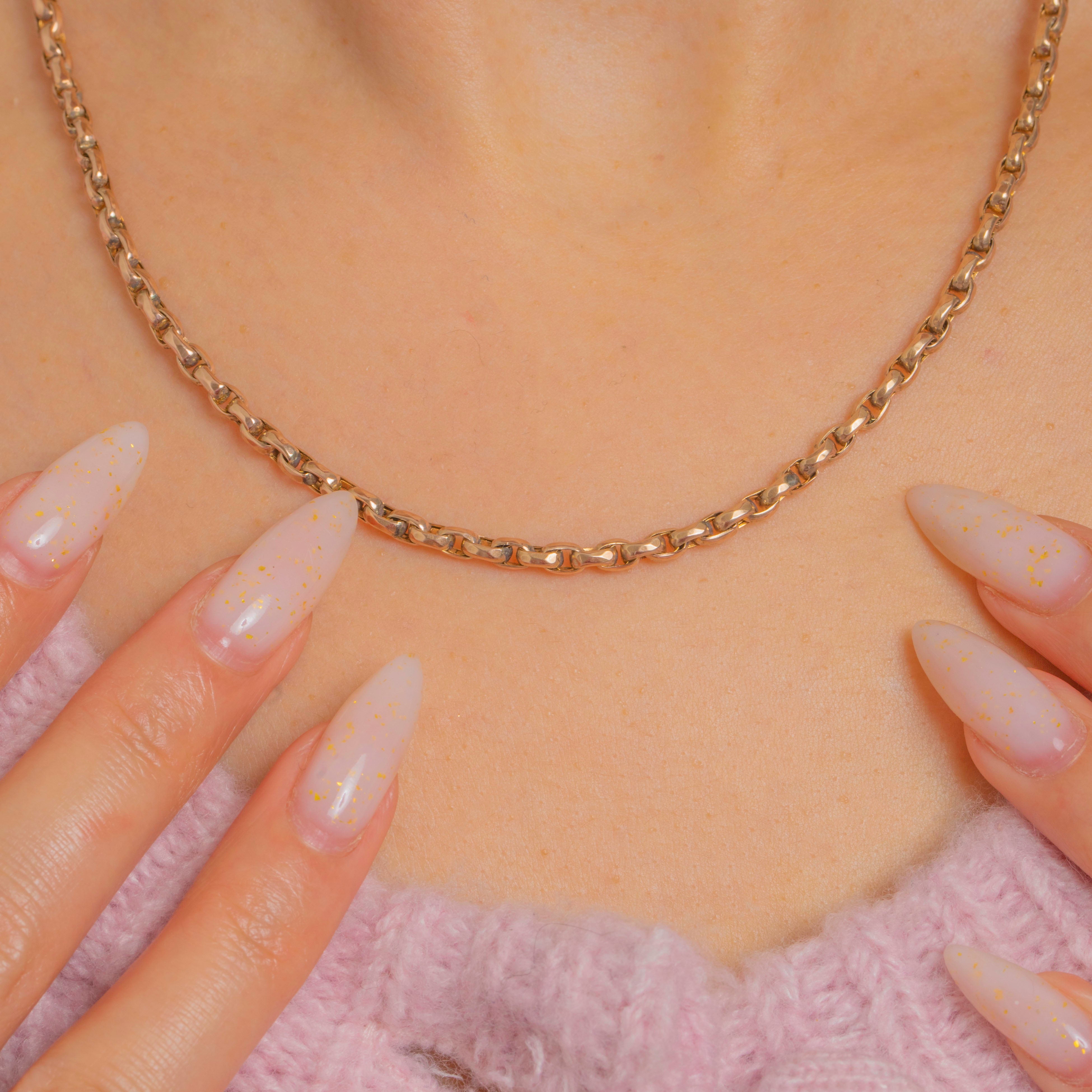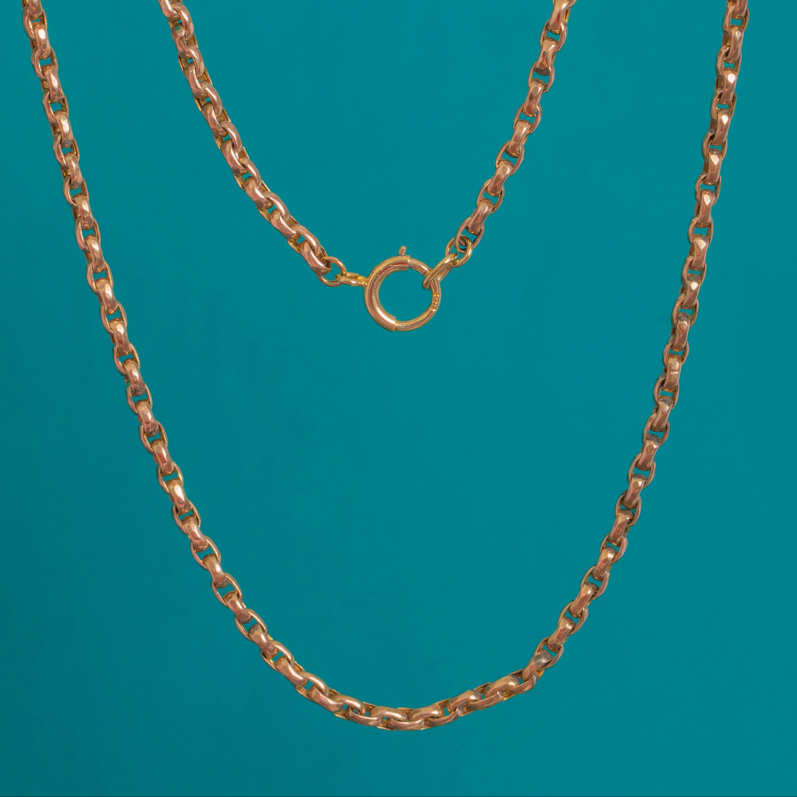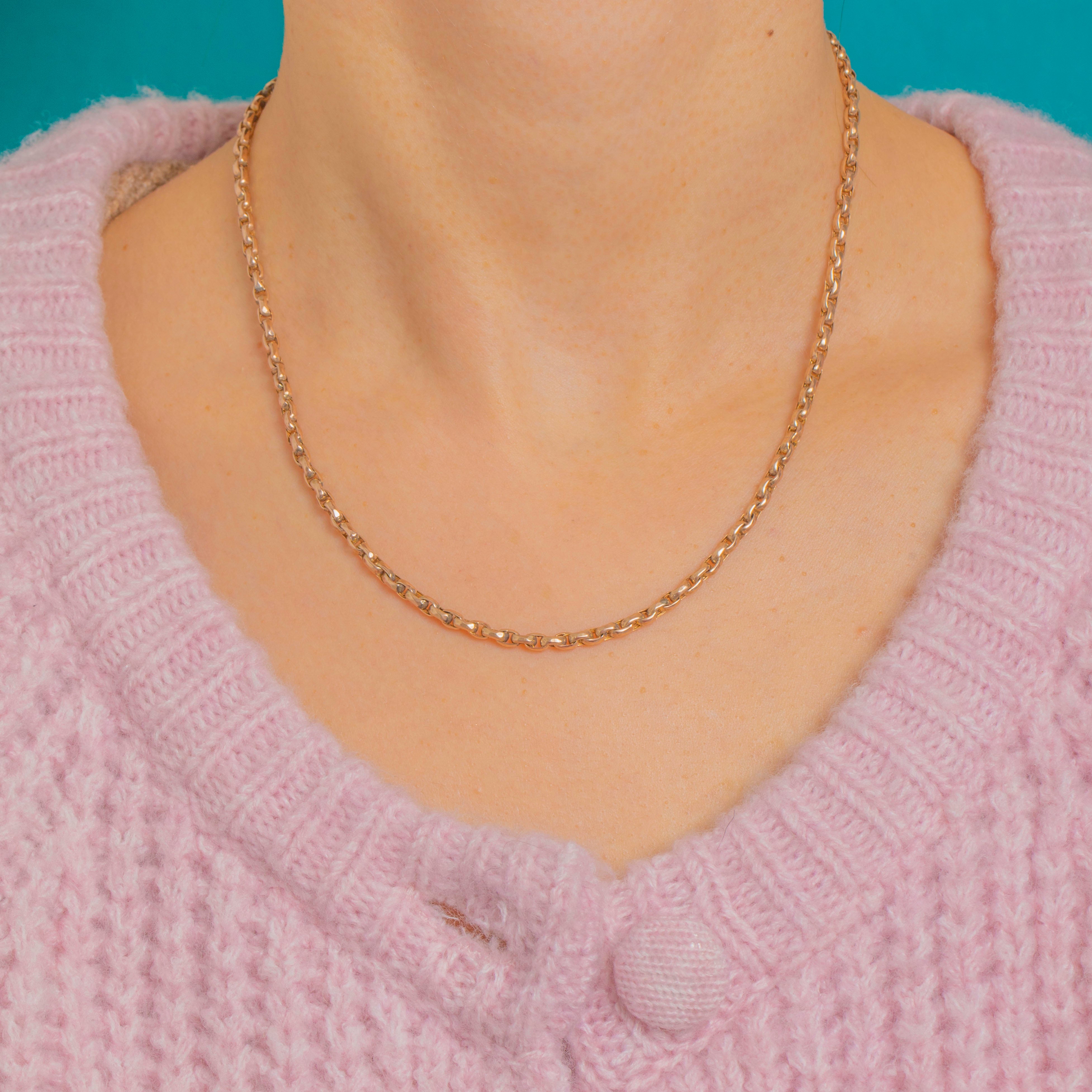 A timeless Victorian 9ct Gold chain to cherish every day. Its subtly faceted, oval‑rectangular links glimmer with a high polish, creating that perfect balance of refinement and presence. At 16 inches, it sits gracefully at the collarbone and layers beautifully with other favourites.