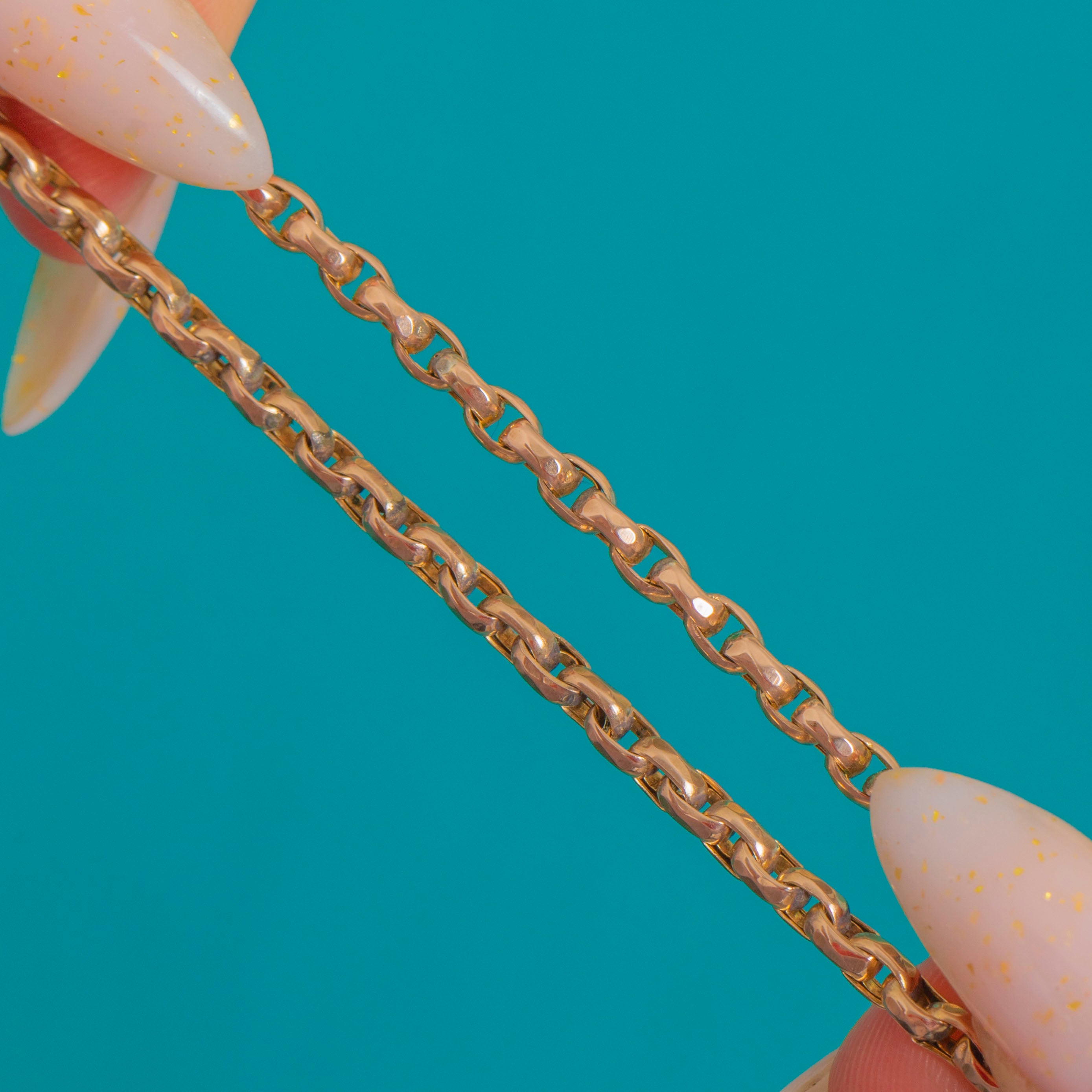 EXCELLENT: The Gold has a bright, even polish with only light surface wear commensurate with age. Links are secure and well-formed, and the fittings function smoothly. No visible repairs; this piece has been well cared for.