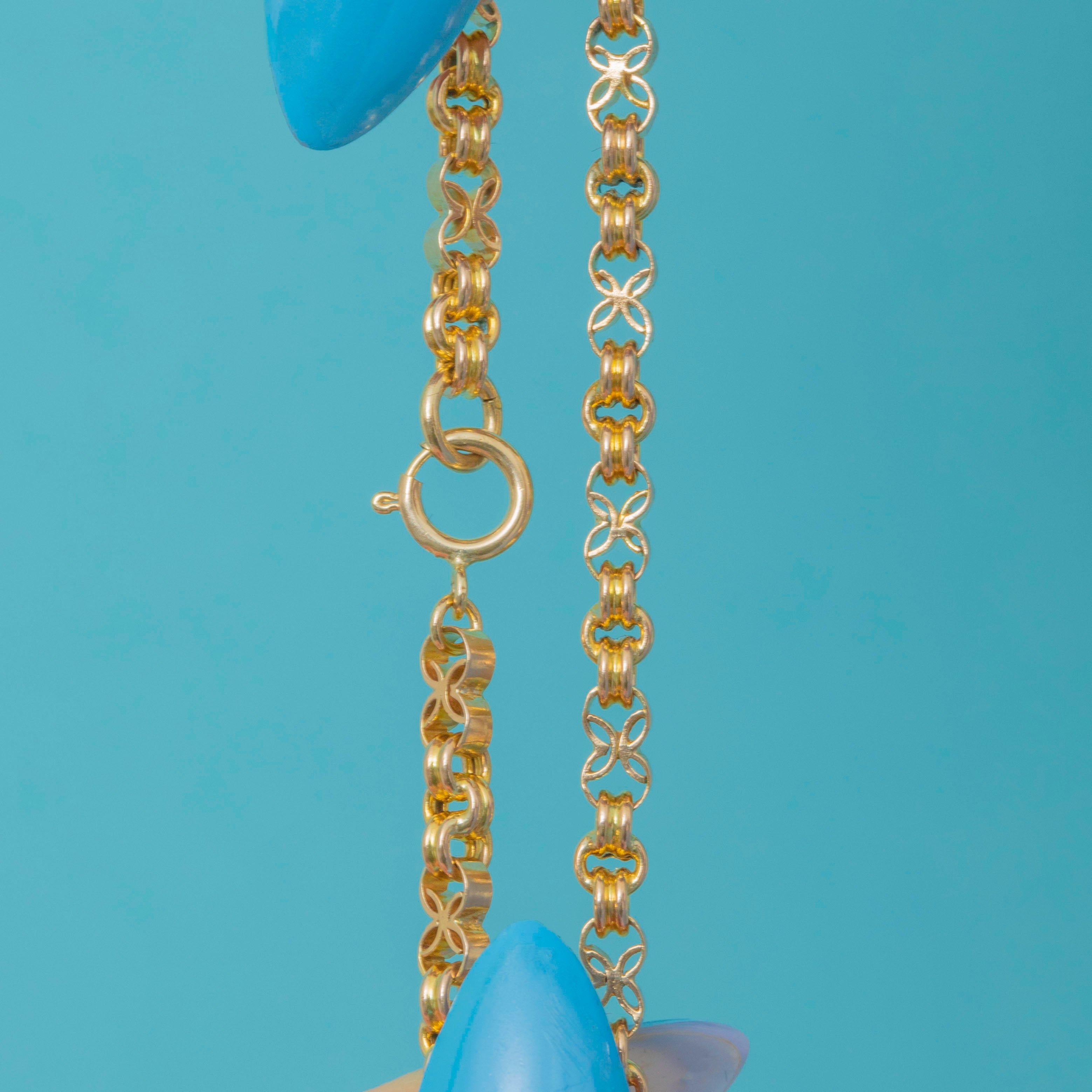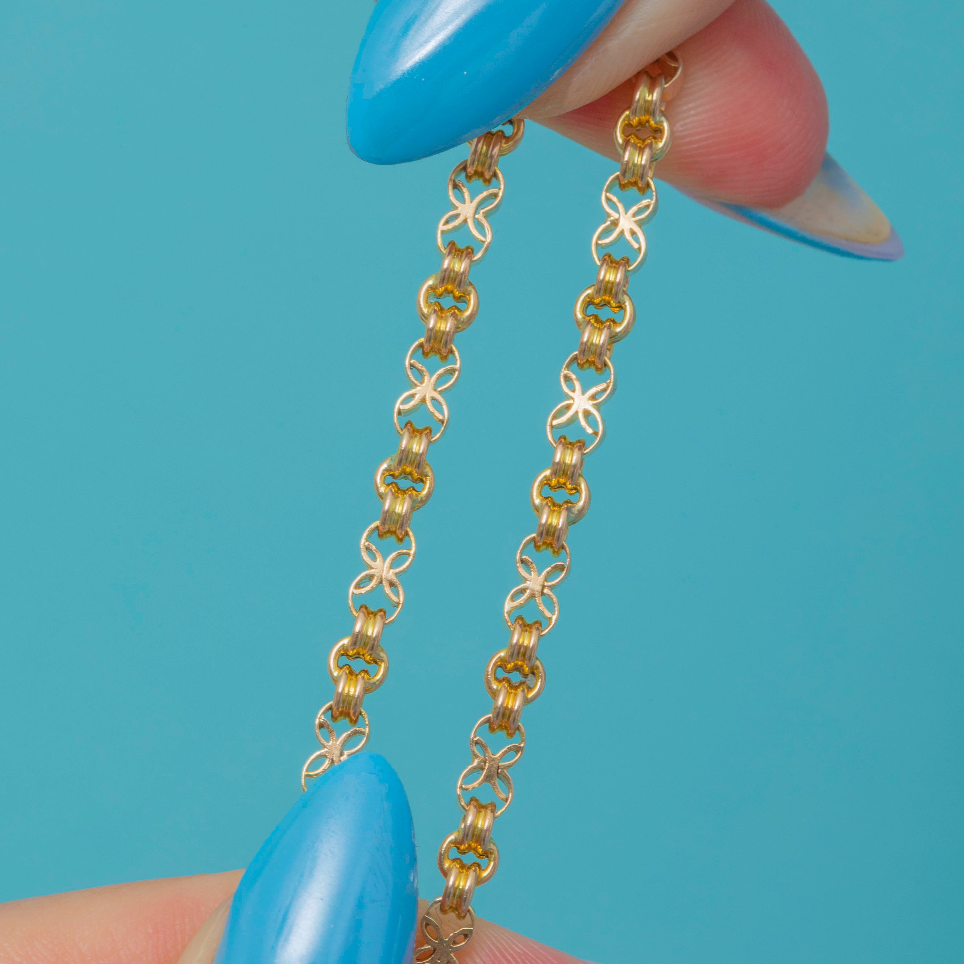 EXCELLENT: Each link is uniform and secure, radiating a lovely bright sheen. With the later-added bolt ring in perfect working order and little else to note, this antique Gold chain can be worn with utmost confidence.