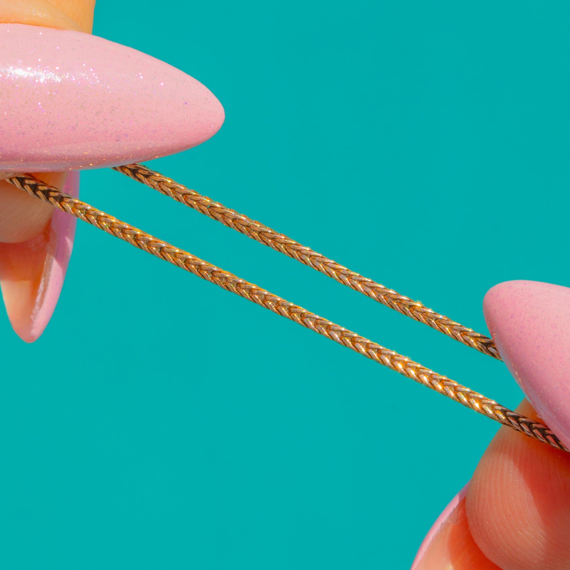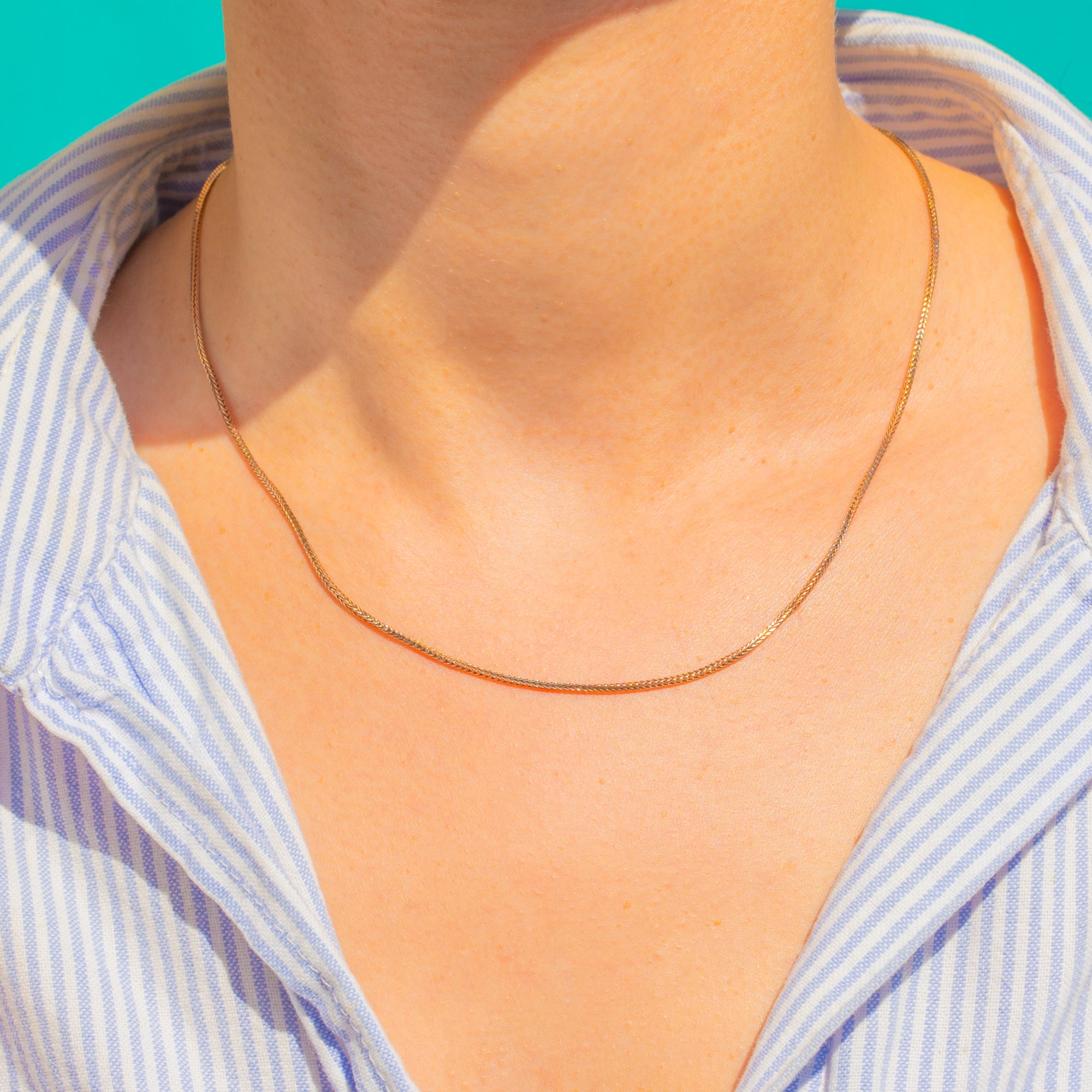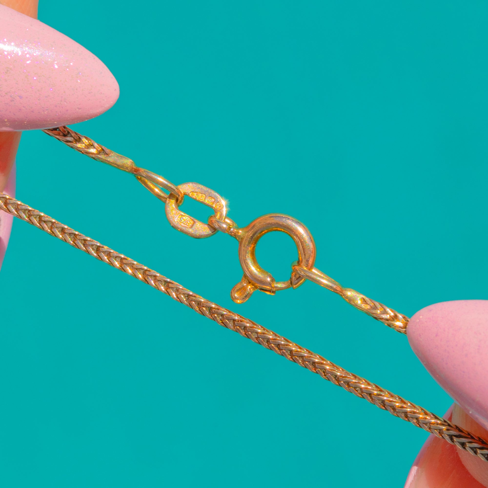 Ein zeitloser Klassiker der Mid-Century-Ära: Diese Foxtail-Kette aus 9ct Gold schmiegt sich elegant an das Schlüsselbein und besticht durch ihr feines, dicht geflochtenes Profil, das bei jeder Bewegung das Licht einfängt. Die seidige, geflochtene Silhouette verleiht einen dezenten Schimmer und ein raffiniertes Finish – perfekt, um sie allein für subtile Eleganz zu tragen oder mit einem zarten Anhänger für luxuriösen Alltag zu kombinieren.
