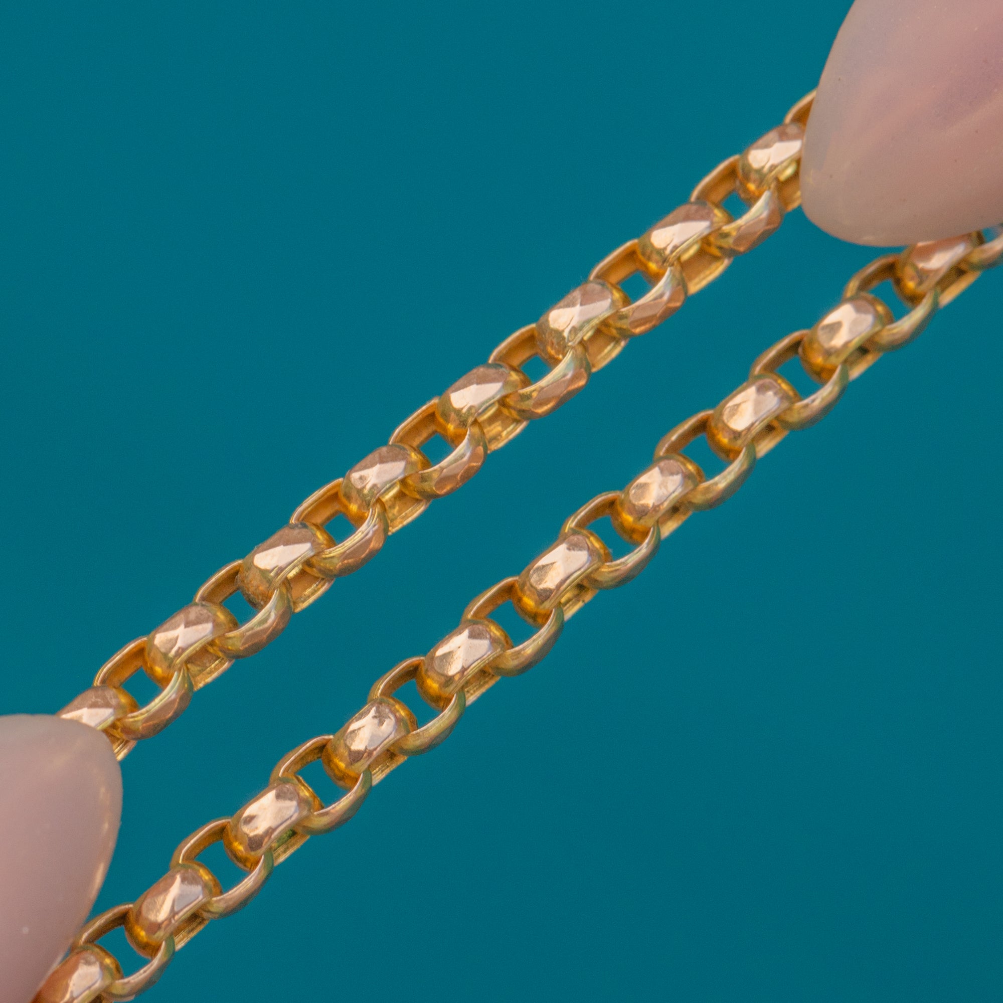 A beautiful antique 9ct Gold belcher chain from the Victorian era, fitted with its original dog-clip clasp. The rounded links are crafted in rich Gold, giving this chain a warm and luxurious tone.