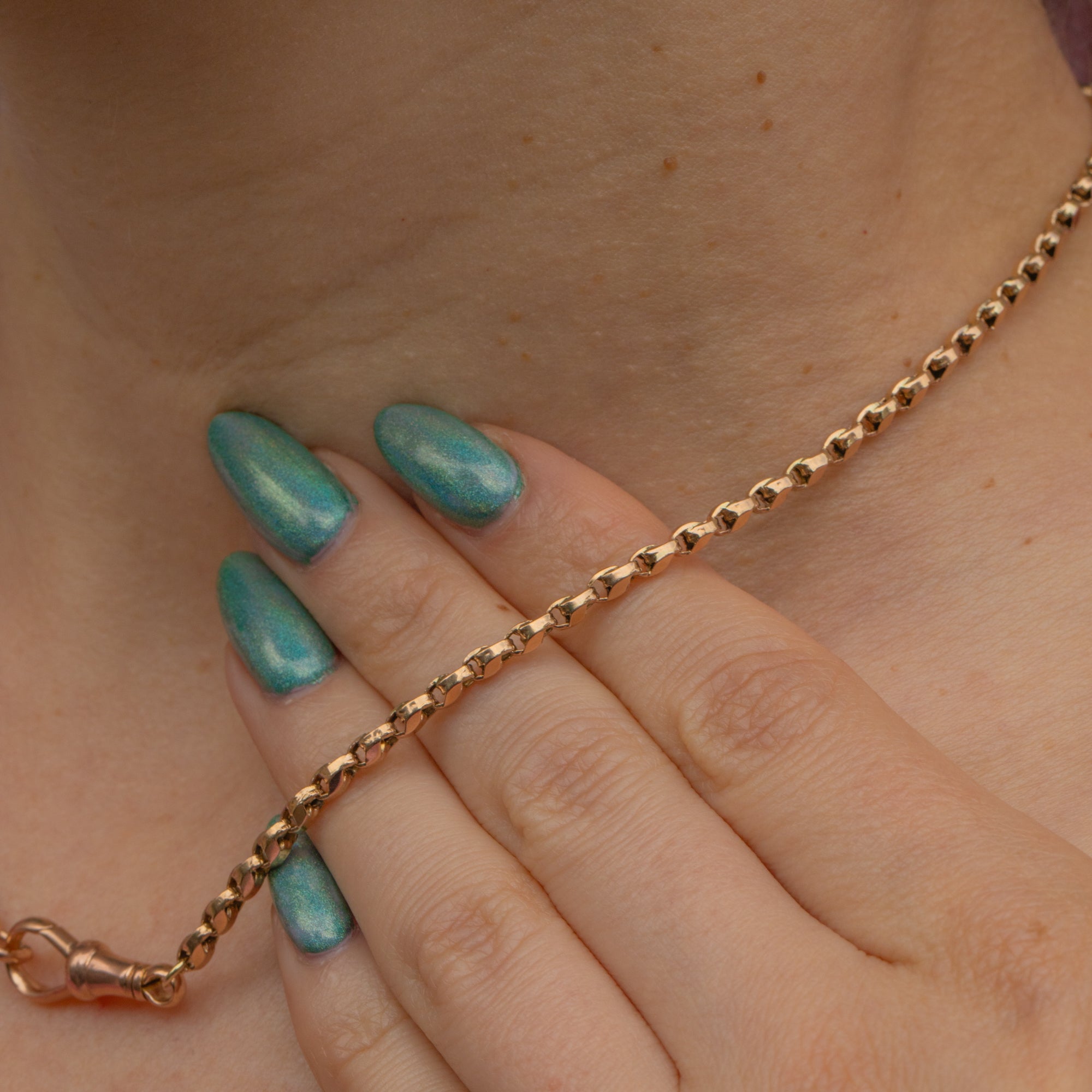 EXCELLENT: This 16" Victorian Gold Tulip chain is in sublime condition throughout. All of the links are securely connected, and are completely free from nicks or discolouration. In fact, the colour of the 9ct Gold is just perfection, akin to pale Provençal rosé! The dog clip is also in perfect working order, so you can wear this beautiful chain all day long!