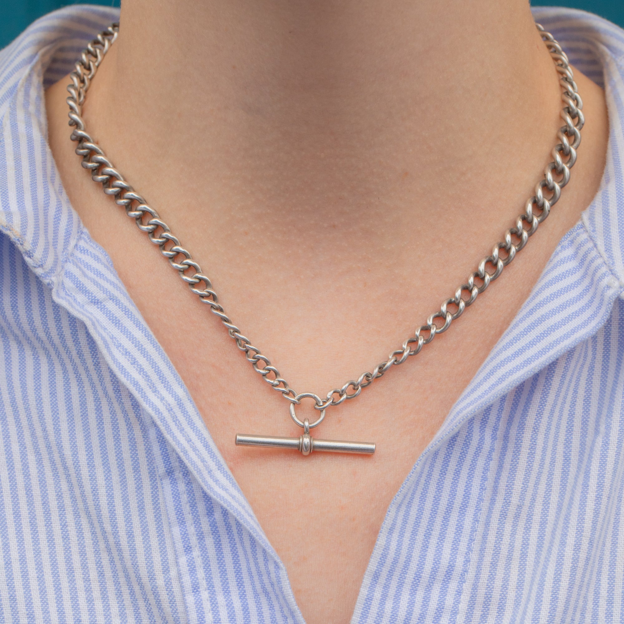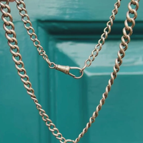 This 16" antique Silver Albert chain will instantly bring an edge to your outfit! At a lovely length of 16", this chain is crafted from Sterling Silver and made up of graduating chunky curb links, with an antique dog clip and T-bar completing this fine Victorian necklace.