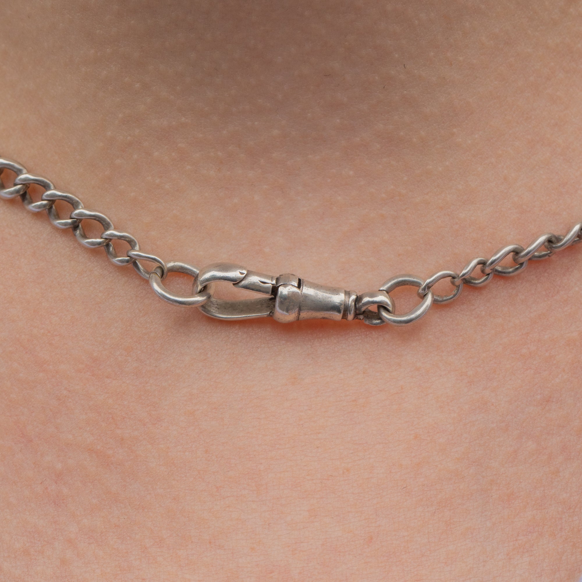 VERY GOOD. This 16" antique Sterling Silver chain is in very good condition. Her links are robust and securely connected with only minor age-related wear throughout.The Lion Passant hallmarks have faded over time, but you can still see outline imprint and it is a sign of high quality craftsmanship. The Silver is lustrous and has accrued an admirable patina in places, adding to her antique charm. The dog clip is in perfect working order, providing you with complete peace of mind while wearing this lovely Victorian chain!
