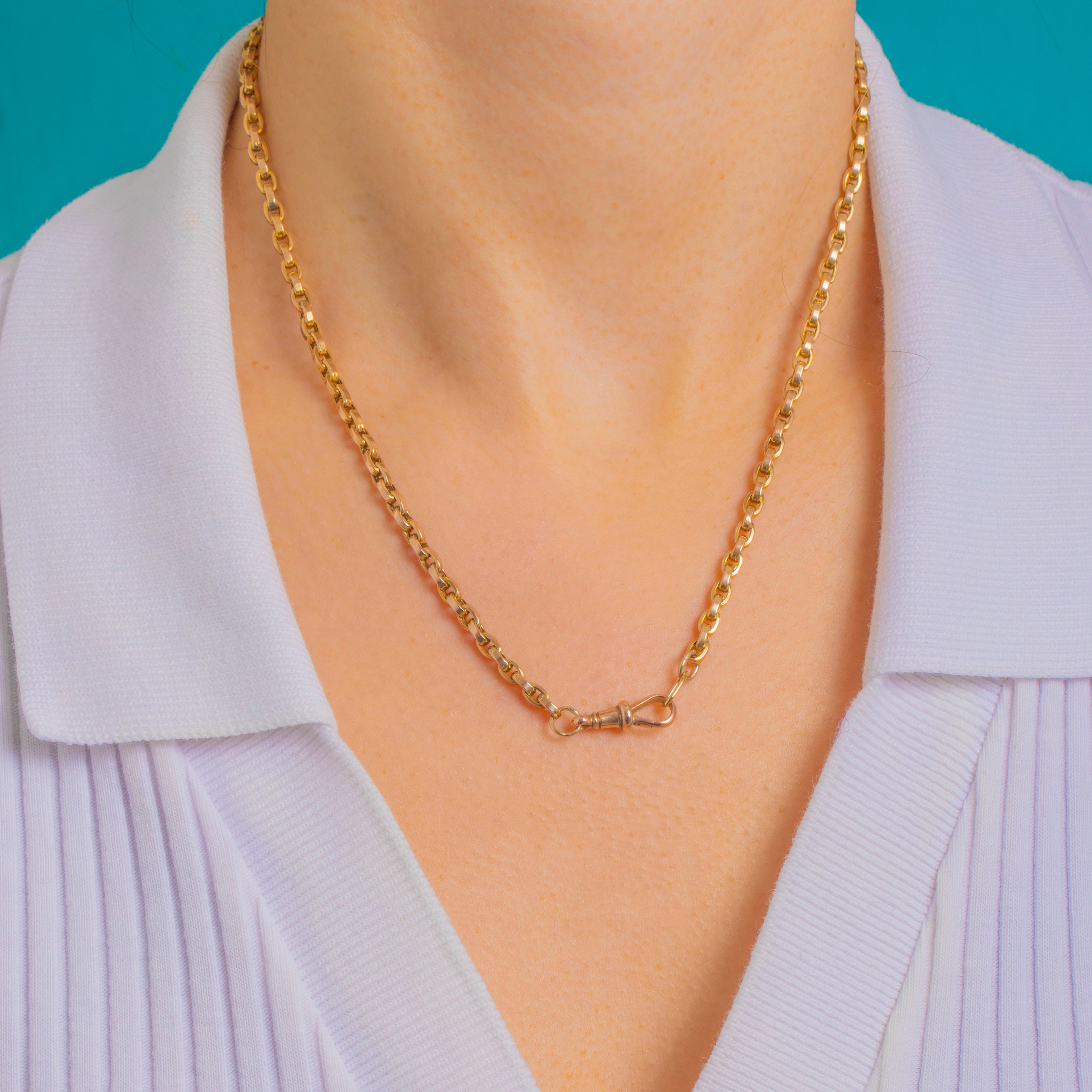 Designed in the tradition of Albert watch chains, the dog-clip can be worn to the front to attach a pendant or charm. Substantial at 10.6g, the chain feels satisfyingly solid, with neatly soldered links and a pleasing flow.