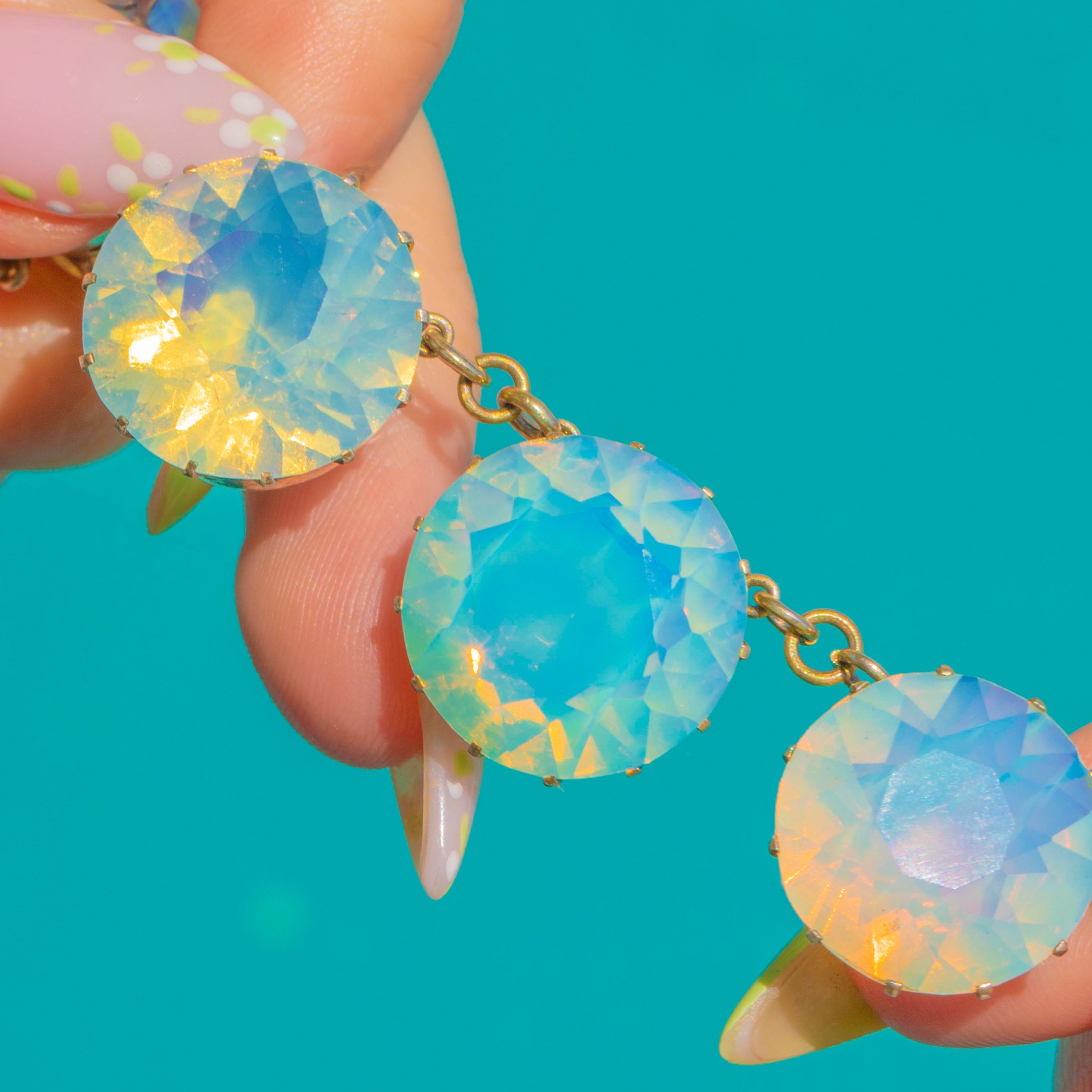 Ein leuchtendes Victorian Collier aus vergoldetem Sterlingsilber, besetzt mit prachtvollen, runden Opaline Glass Steinen, die in ätherischen, opalisierenden Farbtönen schimmern. Jeder facettierte Stein ruht in einer Krappenfassung im Kronenstil und ist durch feine Glieder beweglich verbunden, sodass sich das Collier anmutig und fließend am Schlüsselbein legt.