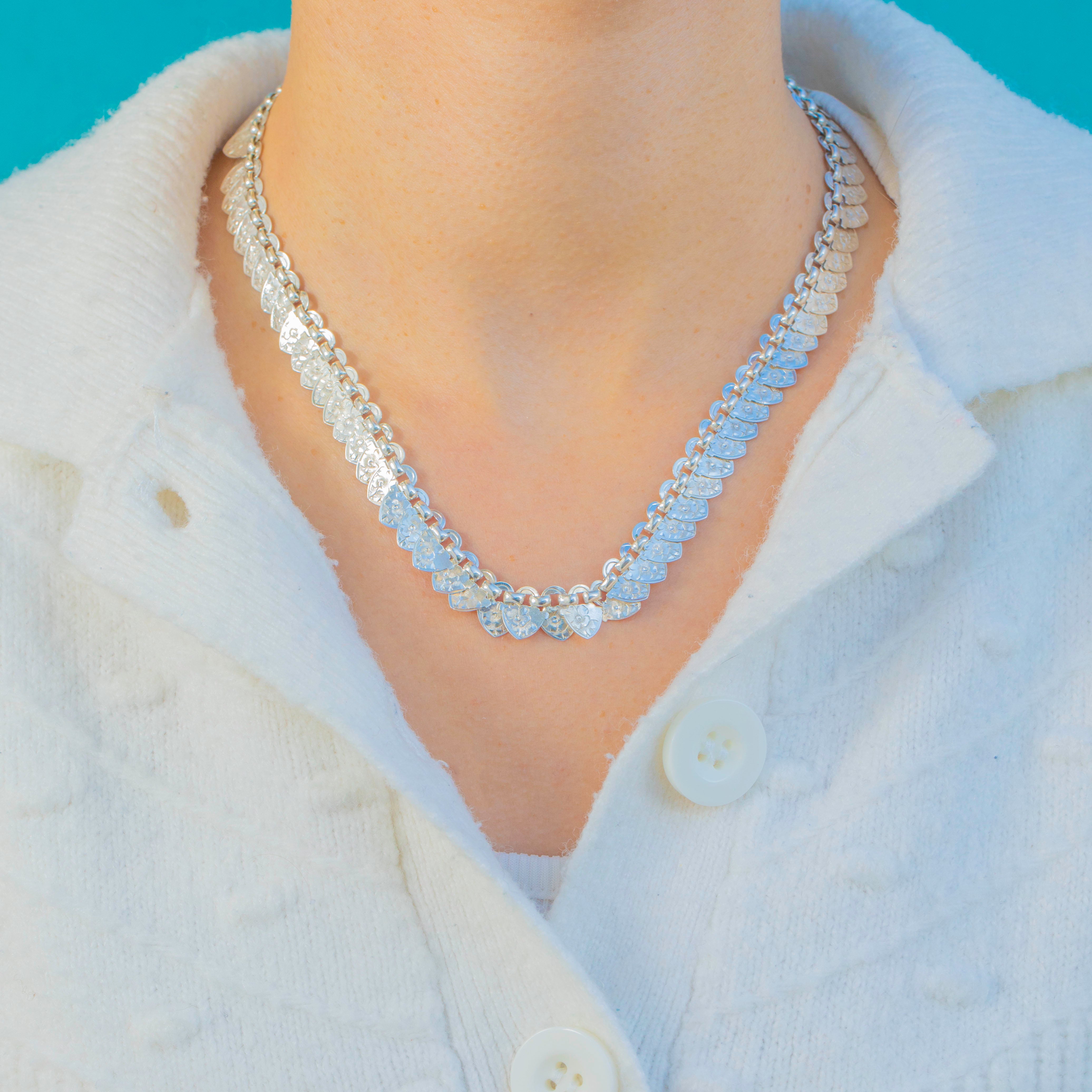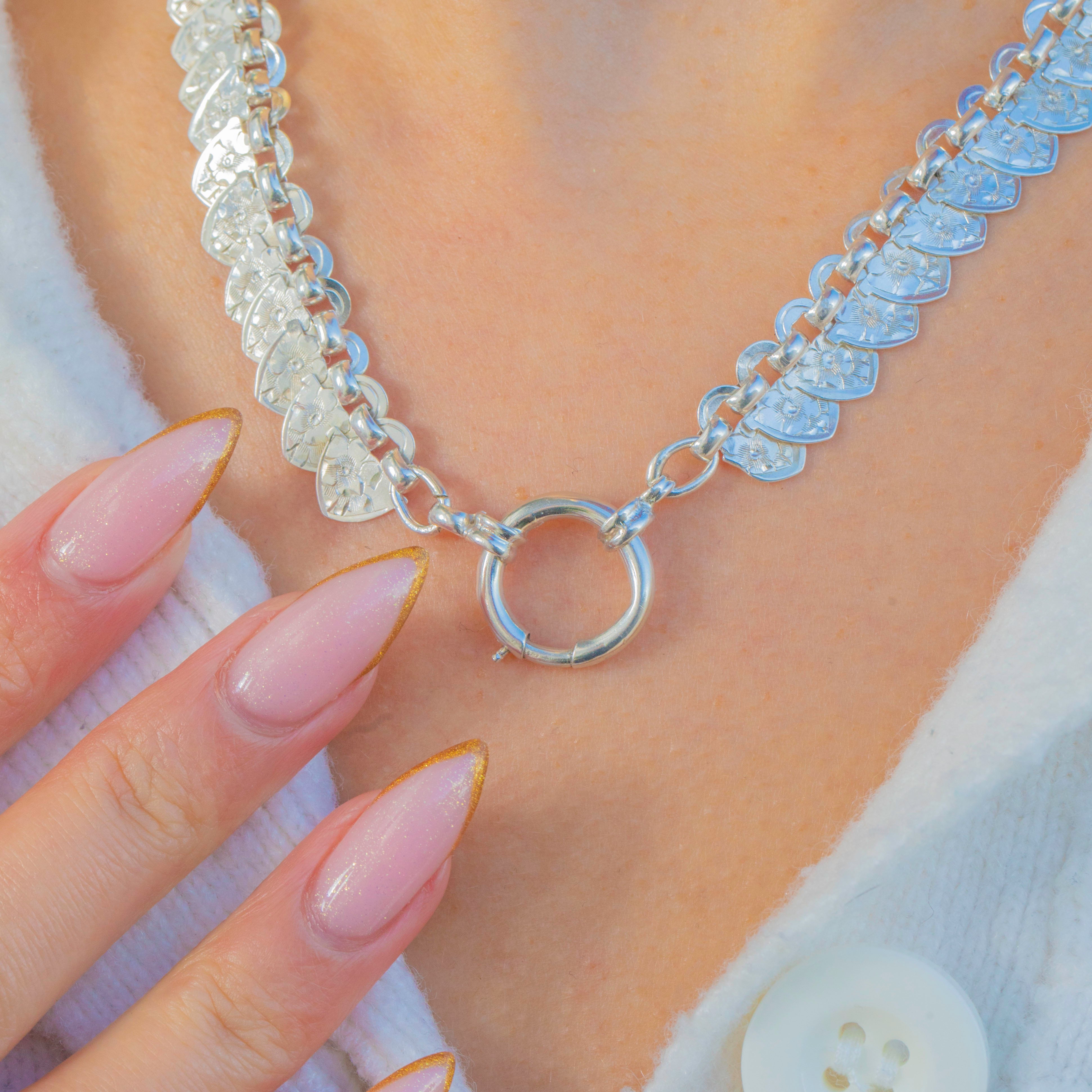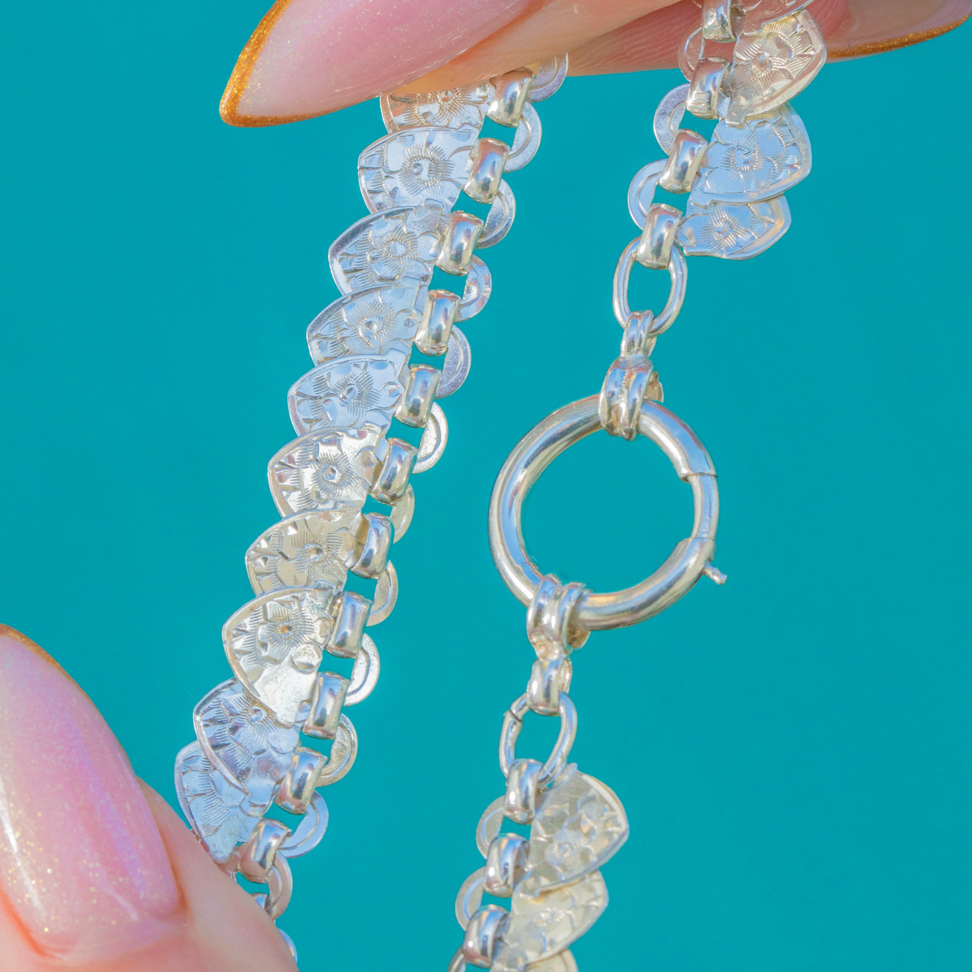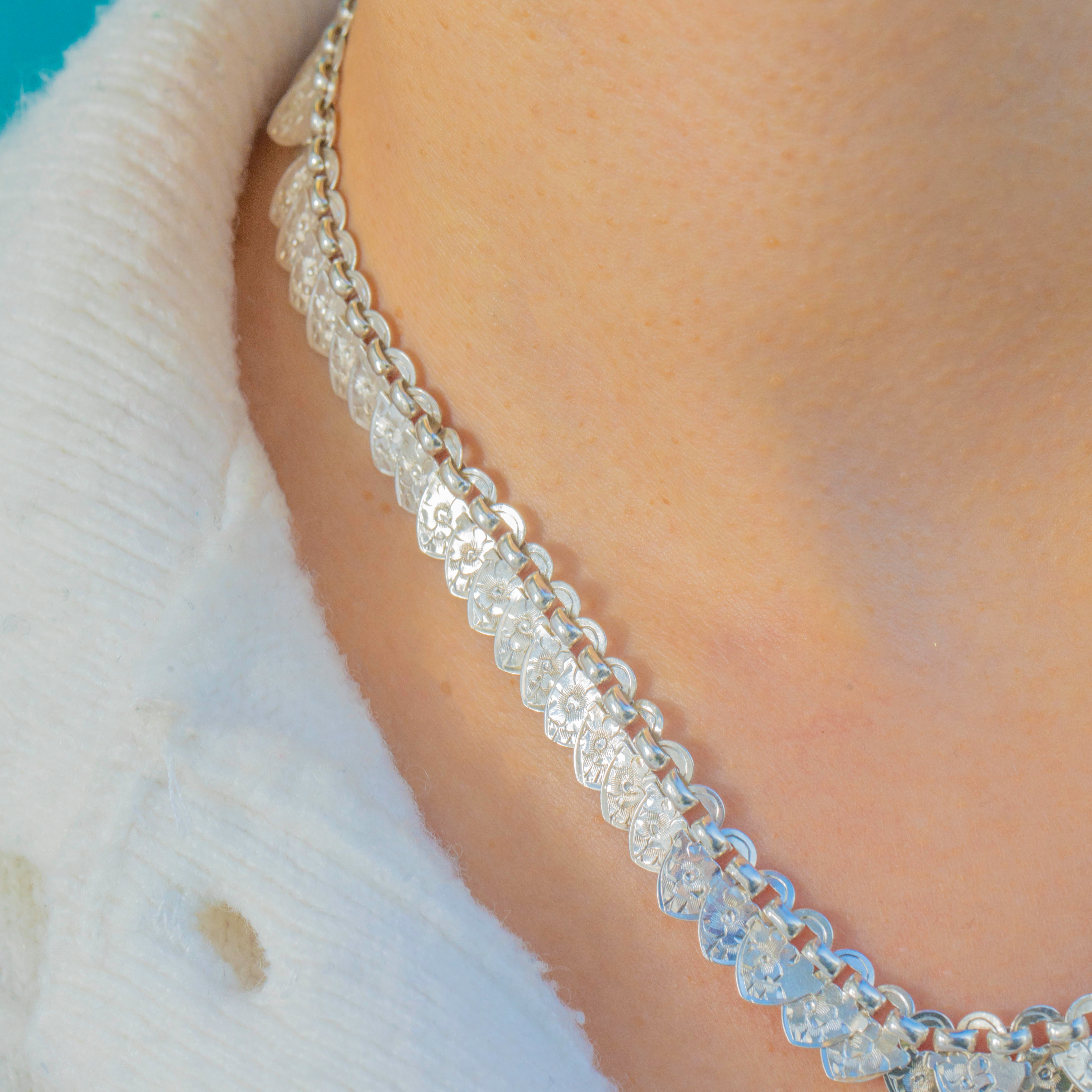 Richly detailed and wonderfully wearable, this late Victorian Sterling Silver “hearts” book-chain collar captures the era’s love of ornament. A rhythmic run of heart-shaped plaques is crisply bright-cut with starburst and foliate motifs, creating a scale-like shimmer that dances as the necklace moves.
