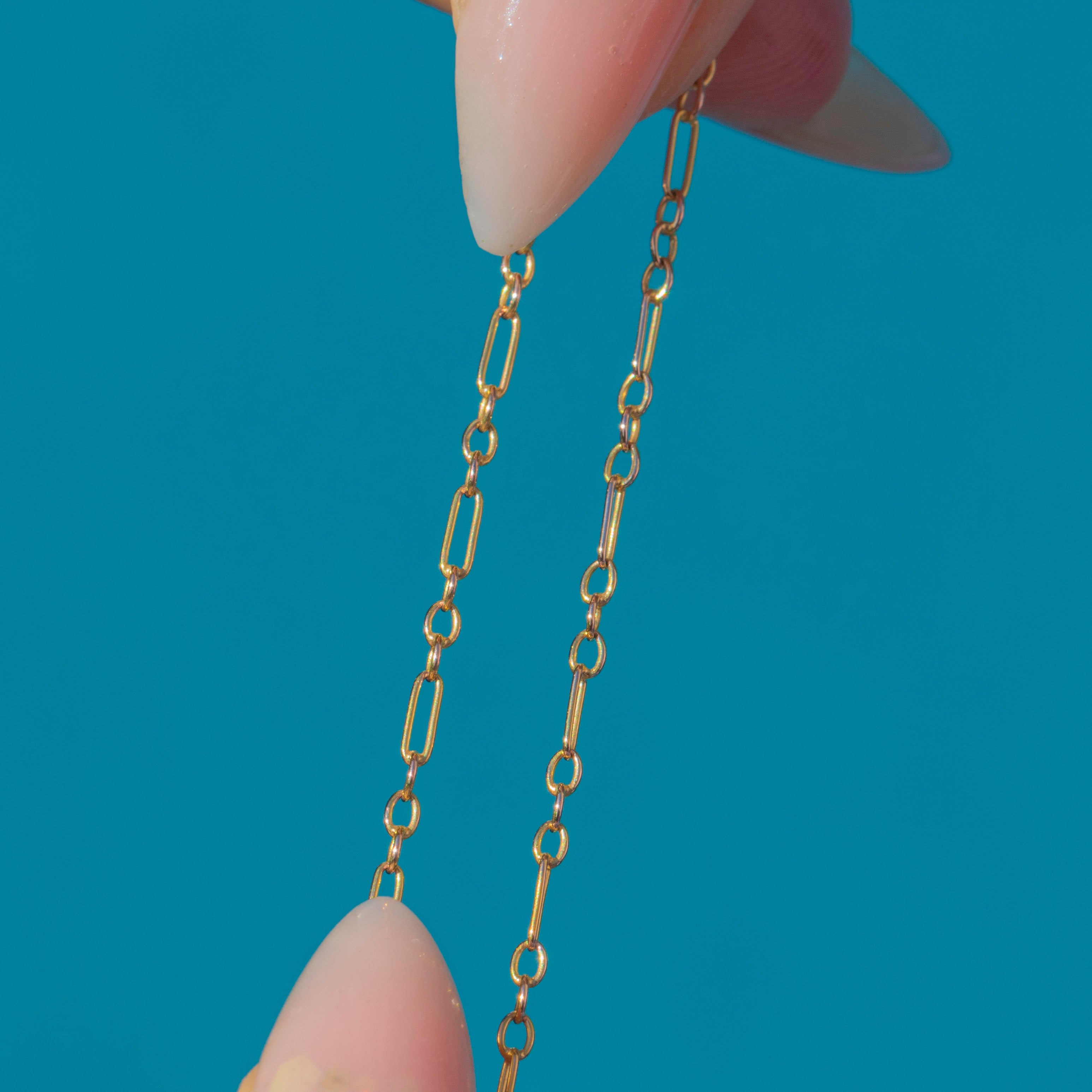 This dainty Victorian chain is crafted in 9ct Gold with slender paperclip links, each elongated and refined. Its delicate silhouette makes it a versatile chain, perfect for wearing alone for a subtle golden touch!