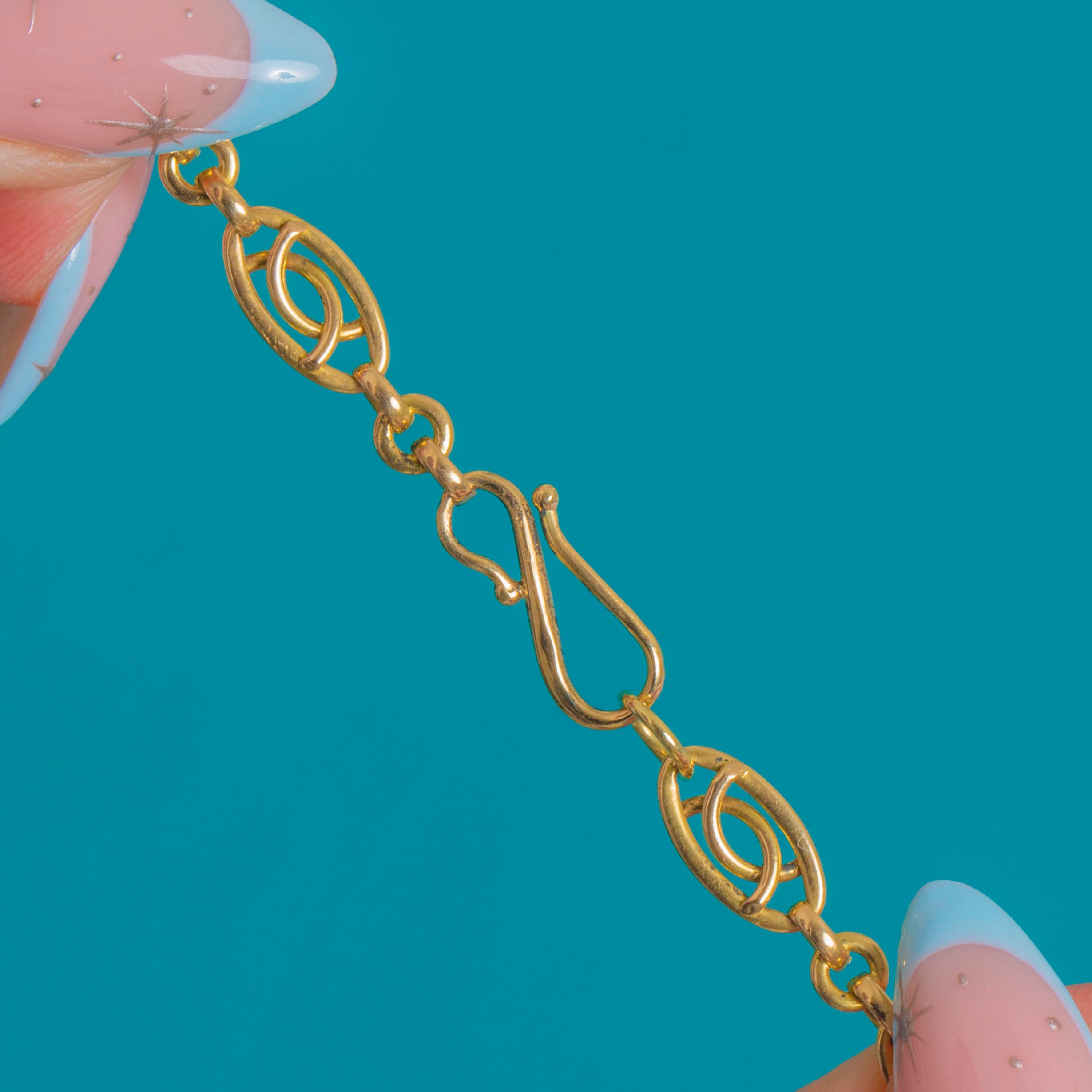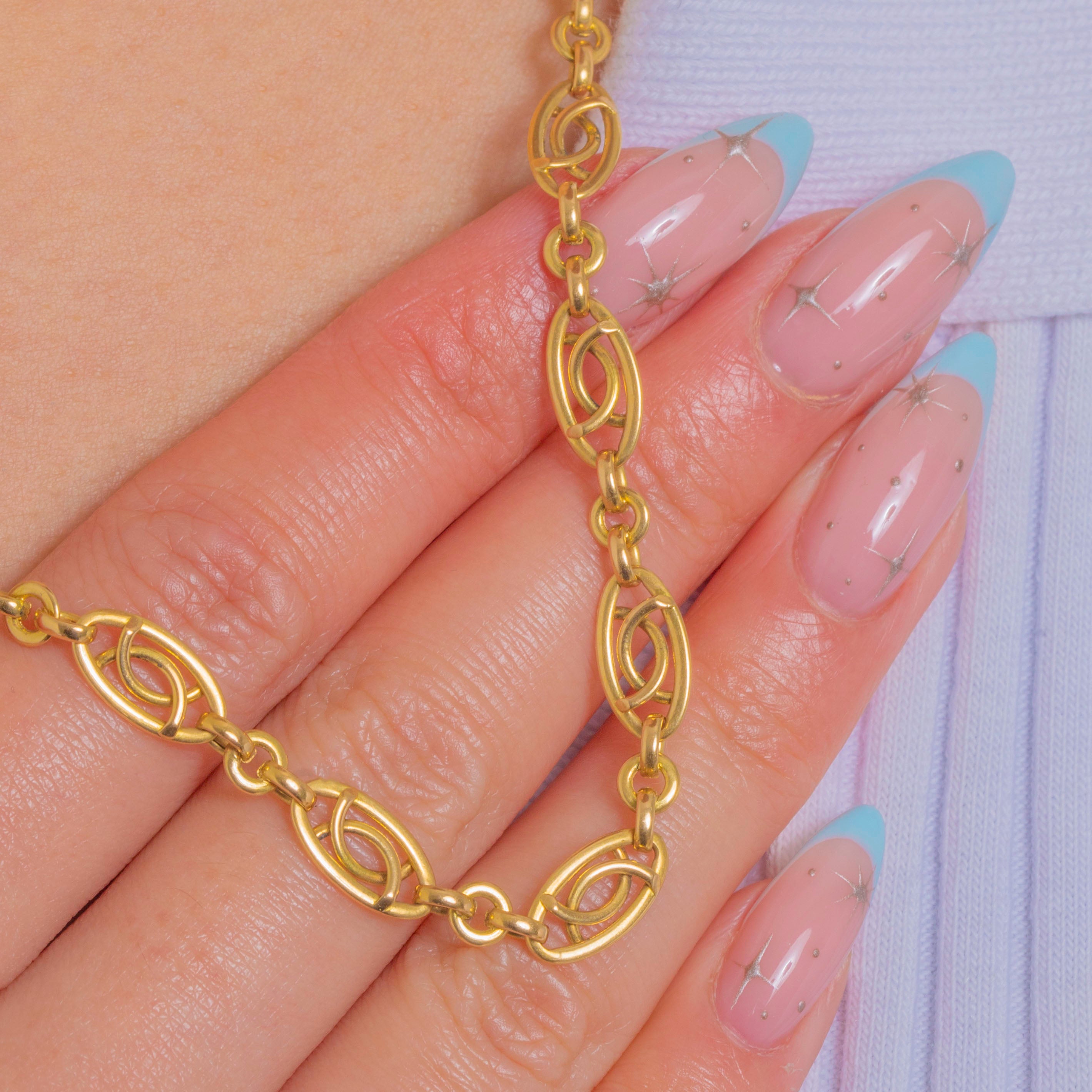 A beautiful Late Victorian fancy-link chain, crafted in rich 18ct Gold with an elegant French sensibility. Each openwork navette link is adorned with delicate soldered S-scrolls, joined by petite jump rings for a refined, articulate drape. The warm, bright glow of the Gold flatters the intricate wire-formed design, offering texture and movement in every link.