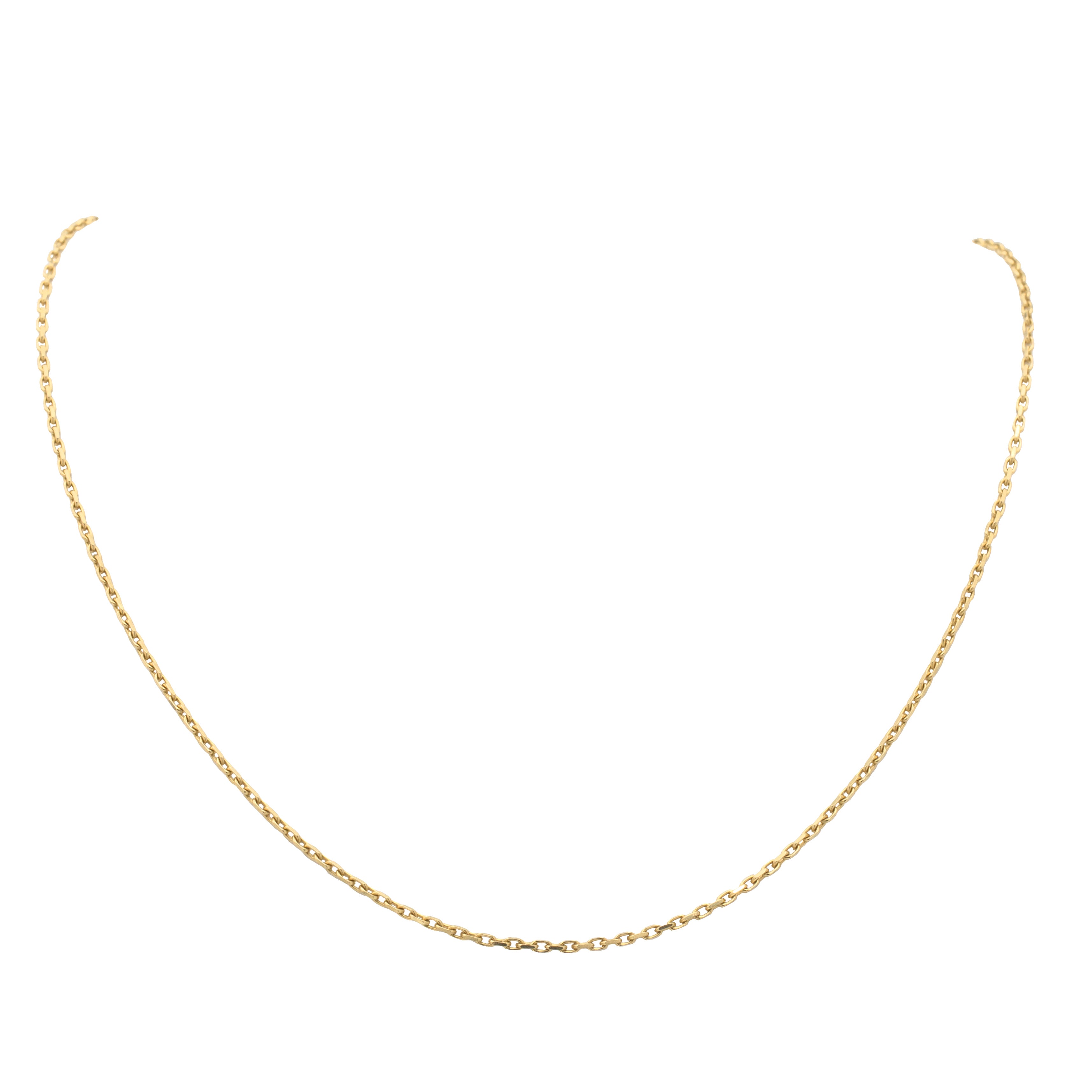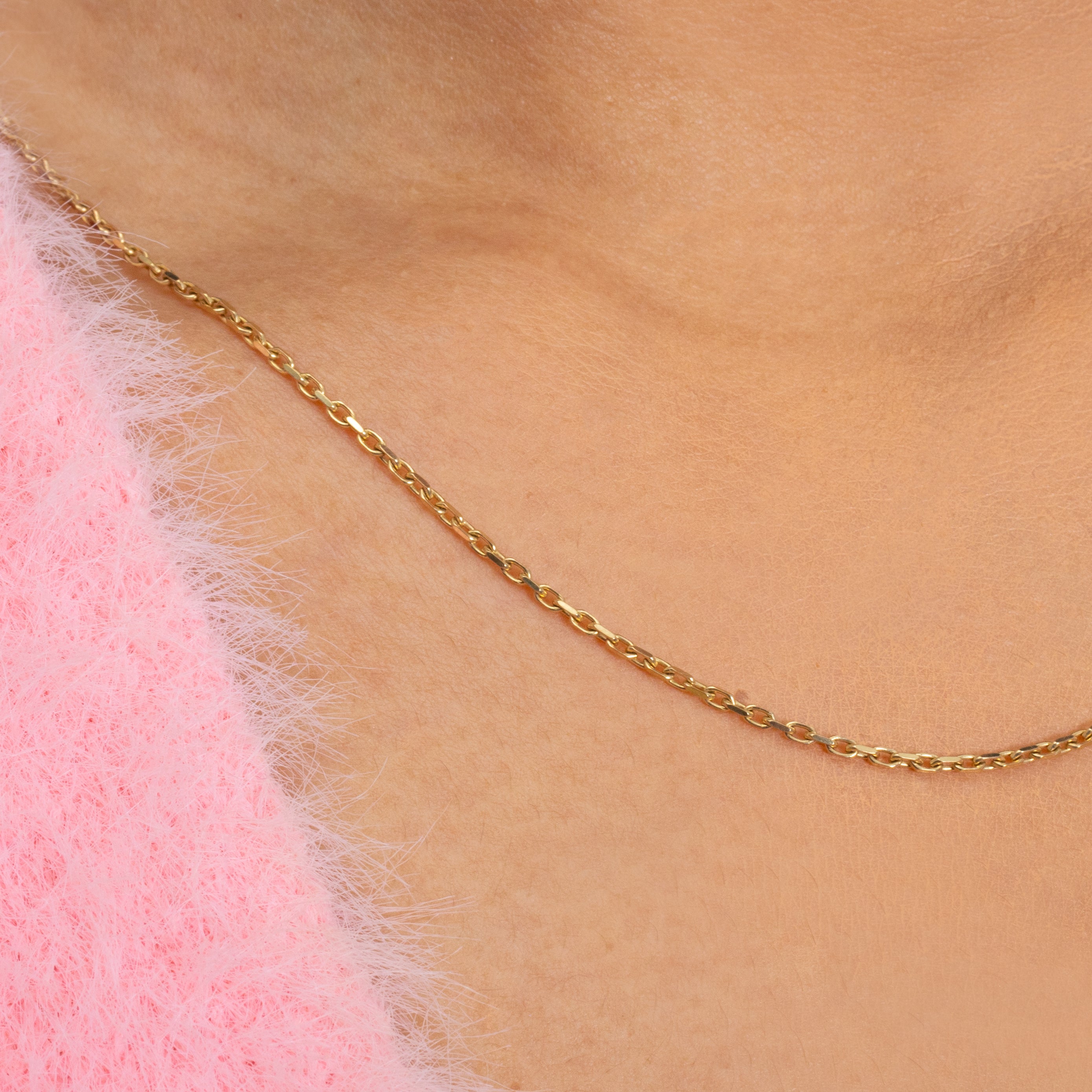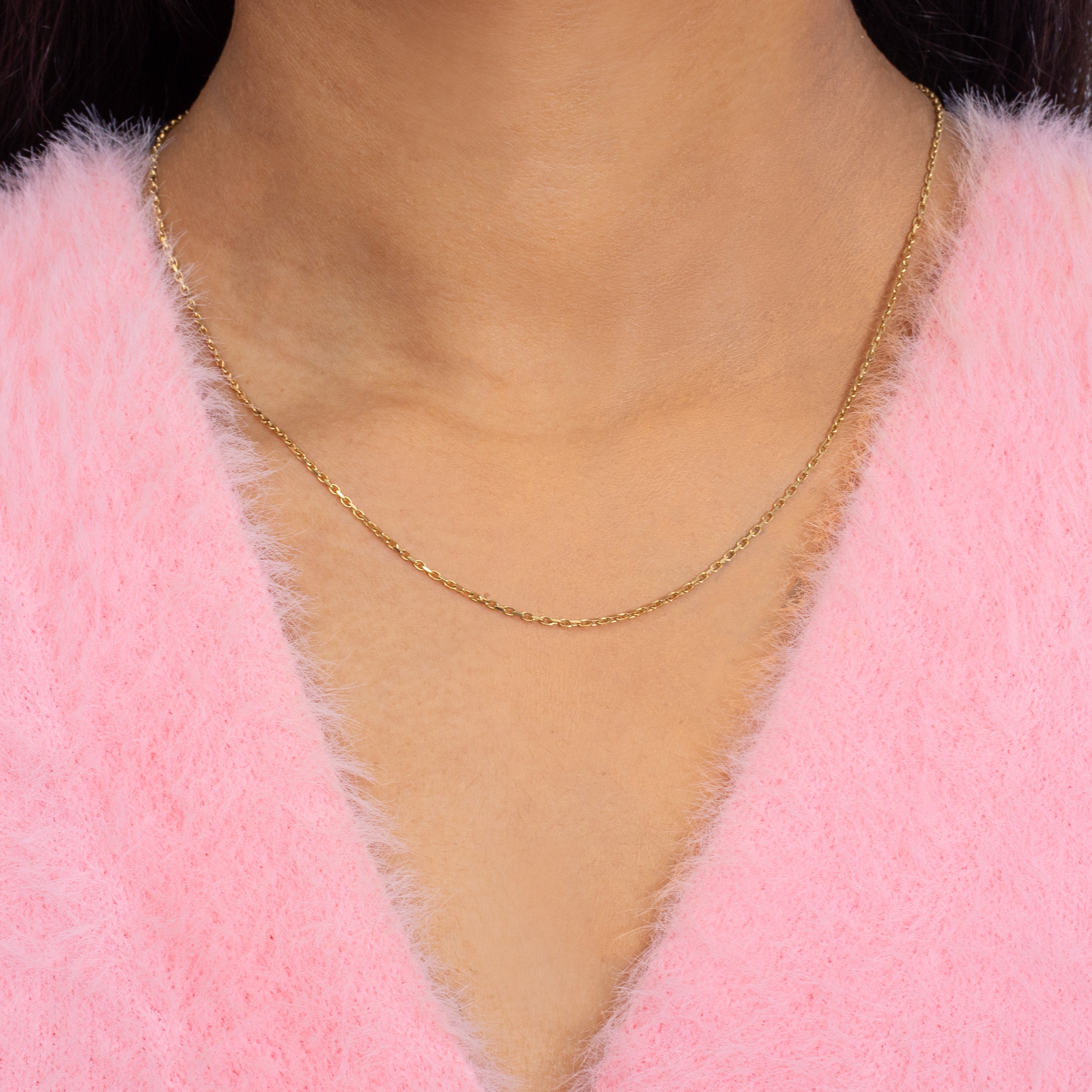 Diese 18" 9 Karat Gold dünne Kette ist perfekt für den täglichen Gebrauch und wäre eine fantastische Ergänzung Ihrer Sammlung! Zarte rechteckige Belcher-Glieder bilden die 18" Länge, deren kantige Formen Goldglanz über Ihre Schlüsselbeine werfen, wenn sie das Licht einfangen.