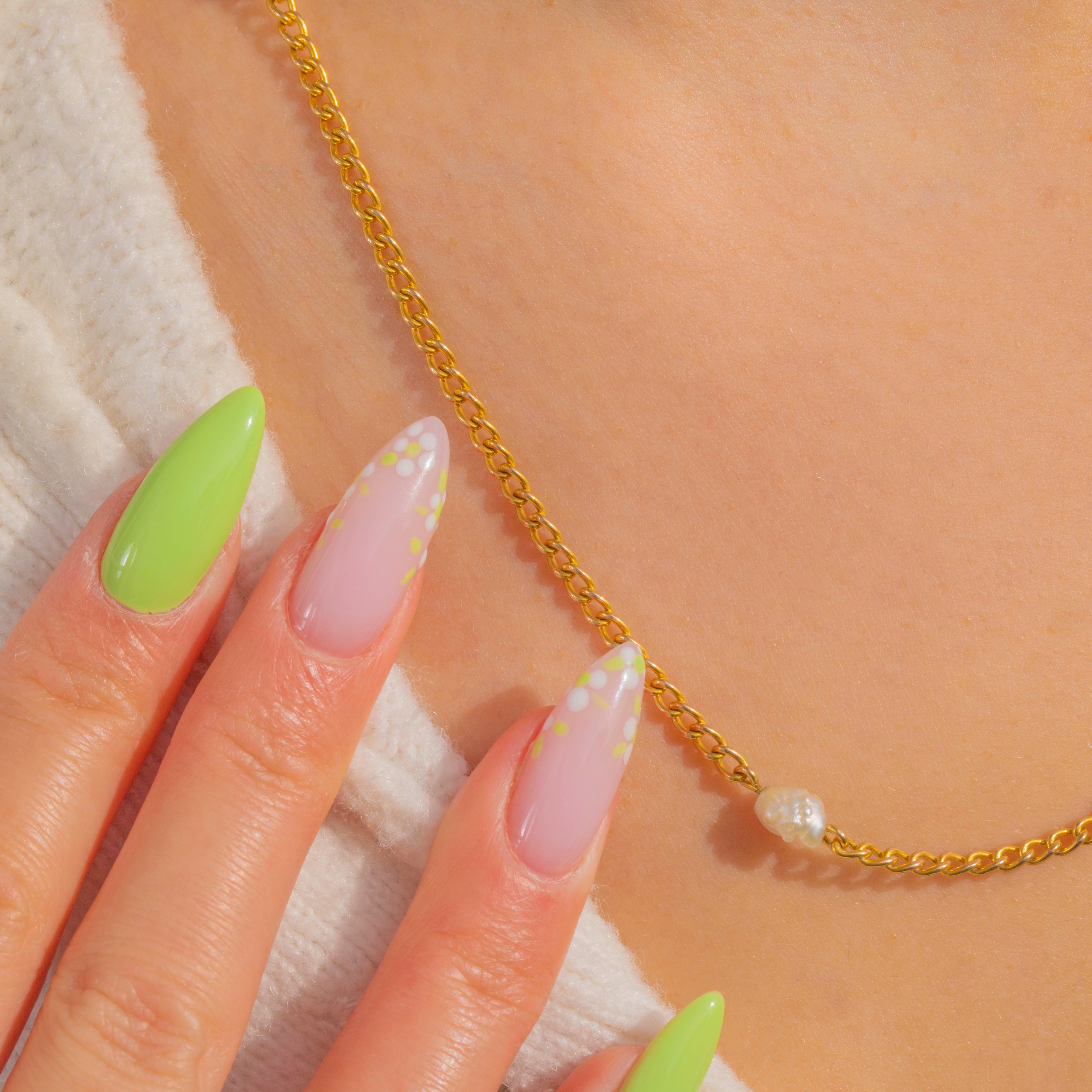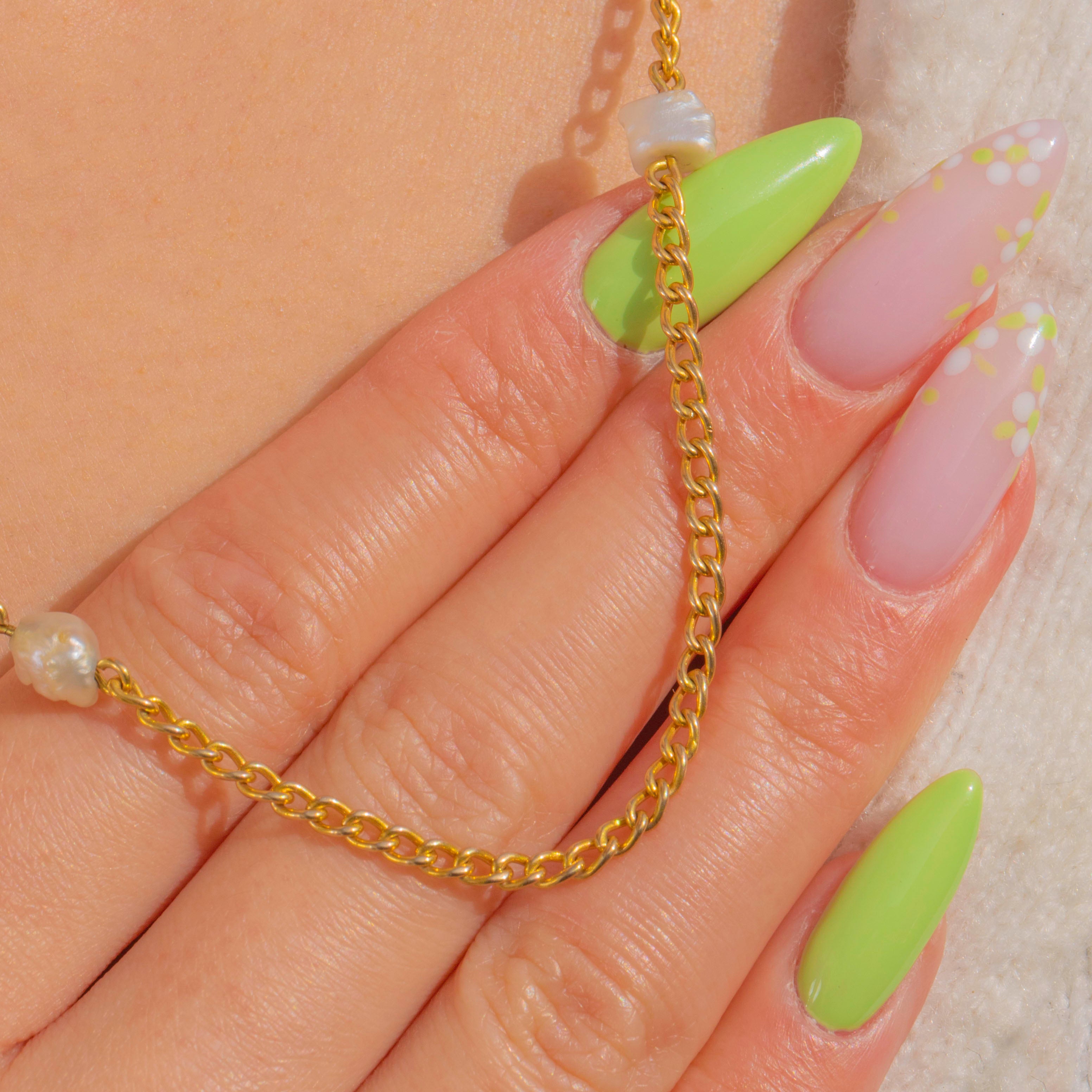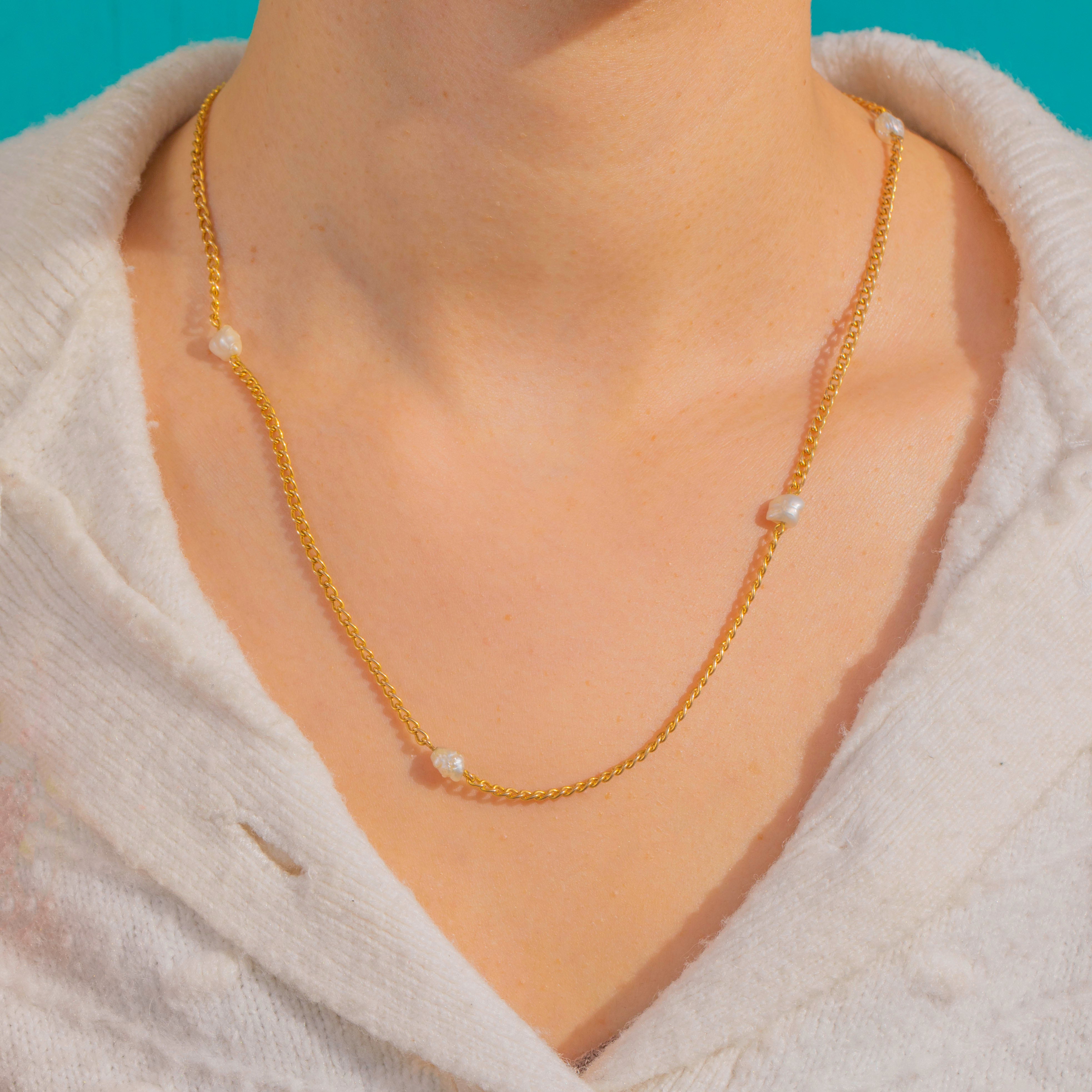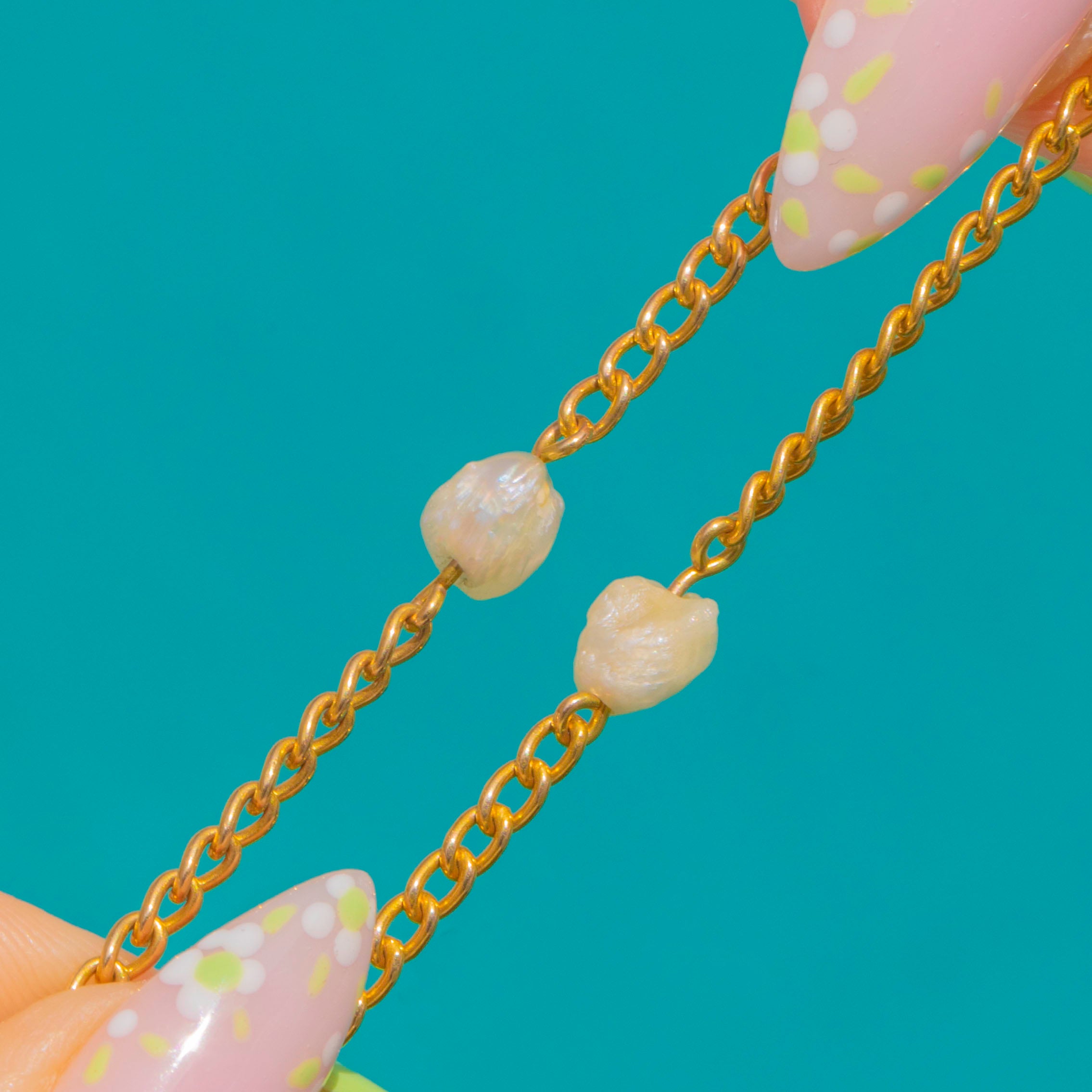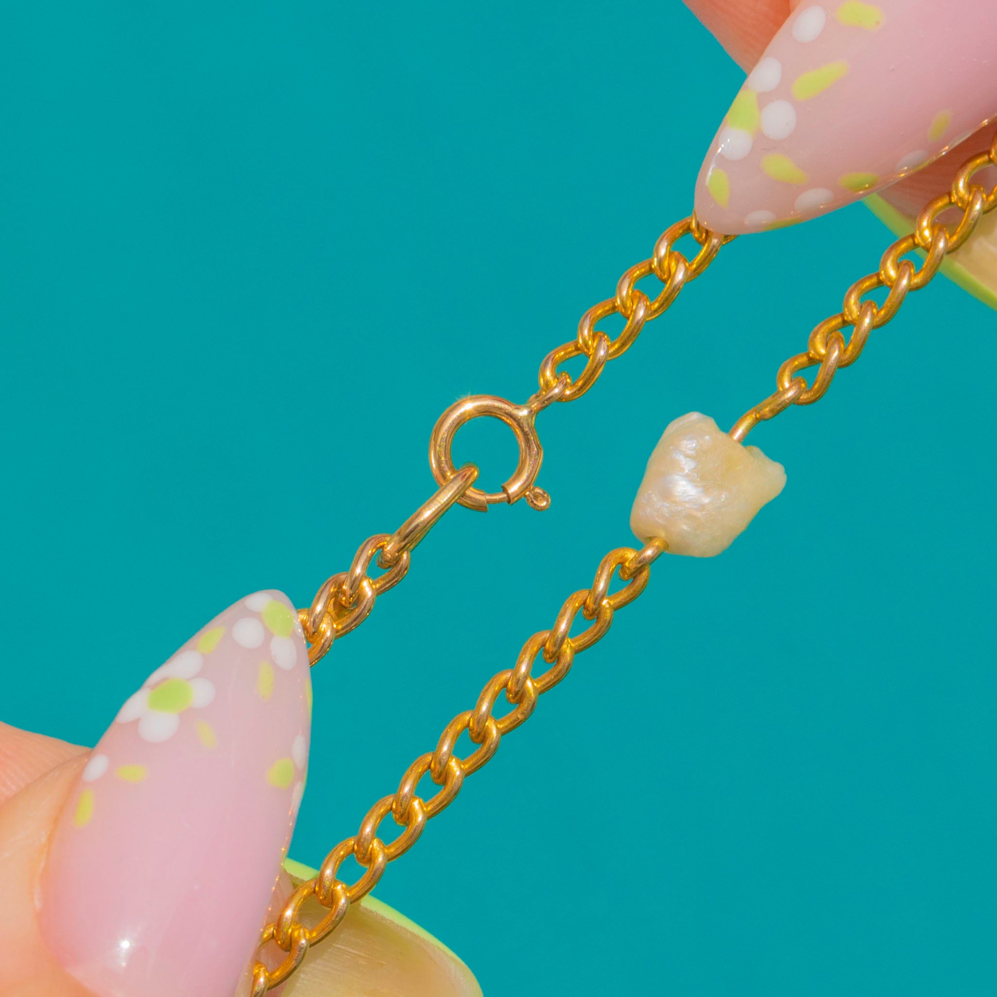 Raffiniert und mühelos elegant präsentiert sich diese Victorian Barockperlen-Kettengliederkette, gefertigt aus leuchtendem 14ct Gold. Unregelmäßige, organisch geformte Perlen akzentuieren die feine Kette mit sanftem Schimmer und subtiler Textur und schaffen ein harmonisches Spiel von Licht und Freiraum.