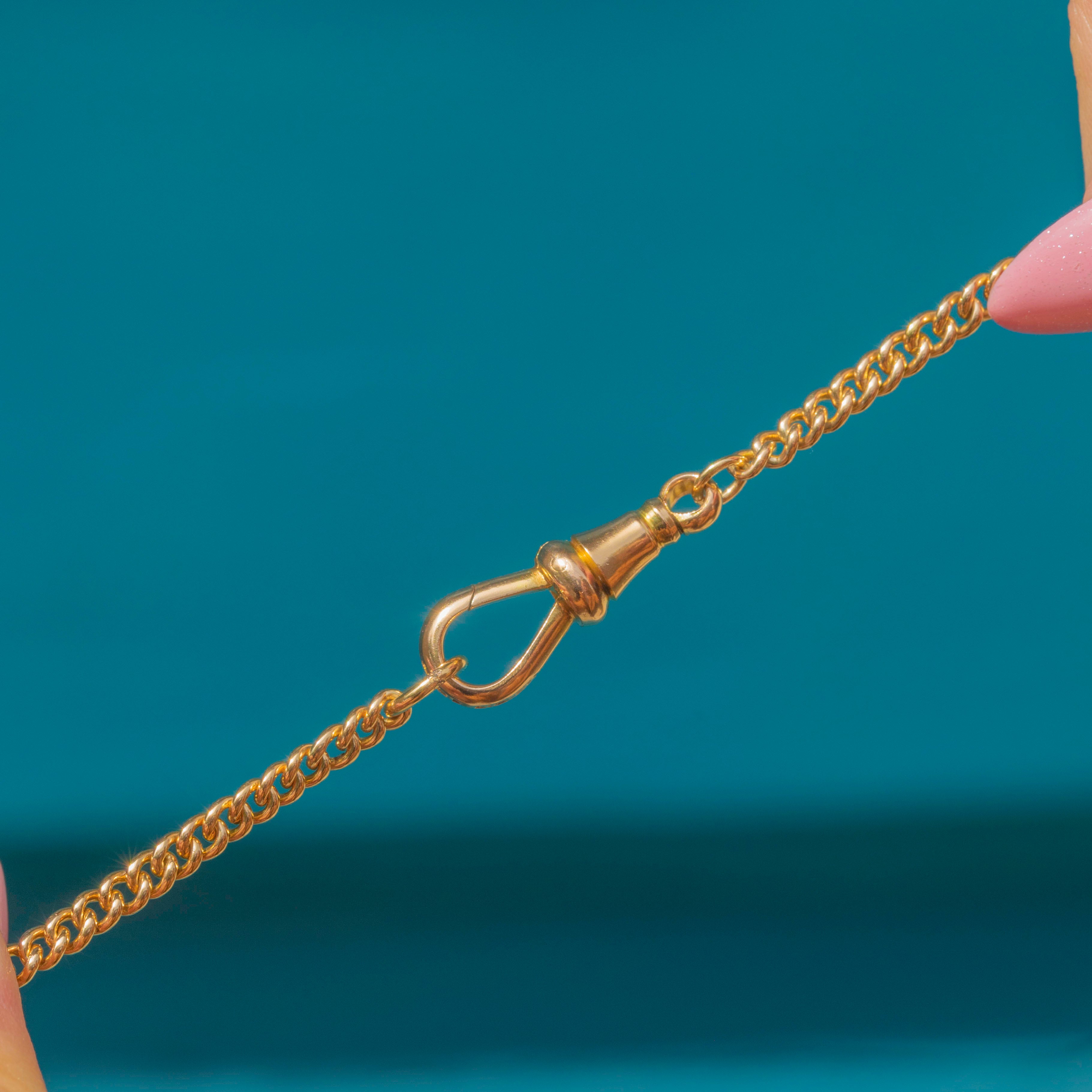 EXCELLENT: There’s little to fault with this stunning antique curb chain. Its rich, buttery 15ct Gold links are beautifully uniform and securely connected. The dog-clip fastens securely, ensuring the chain rests securely around your neck. We’re completely smitten with every inch of this antique treasure, and we’re sure you will be too!