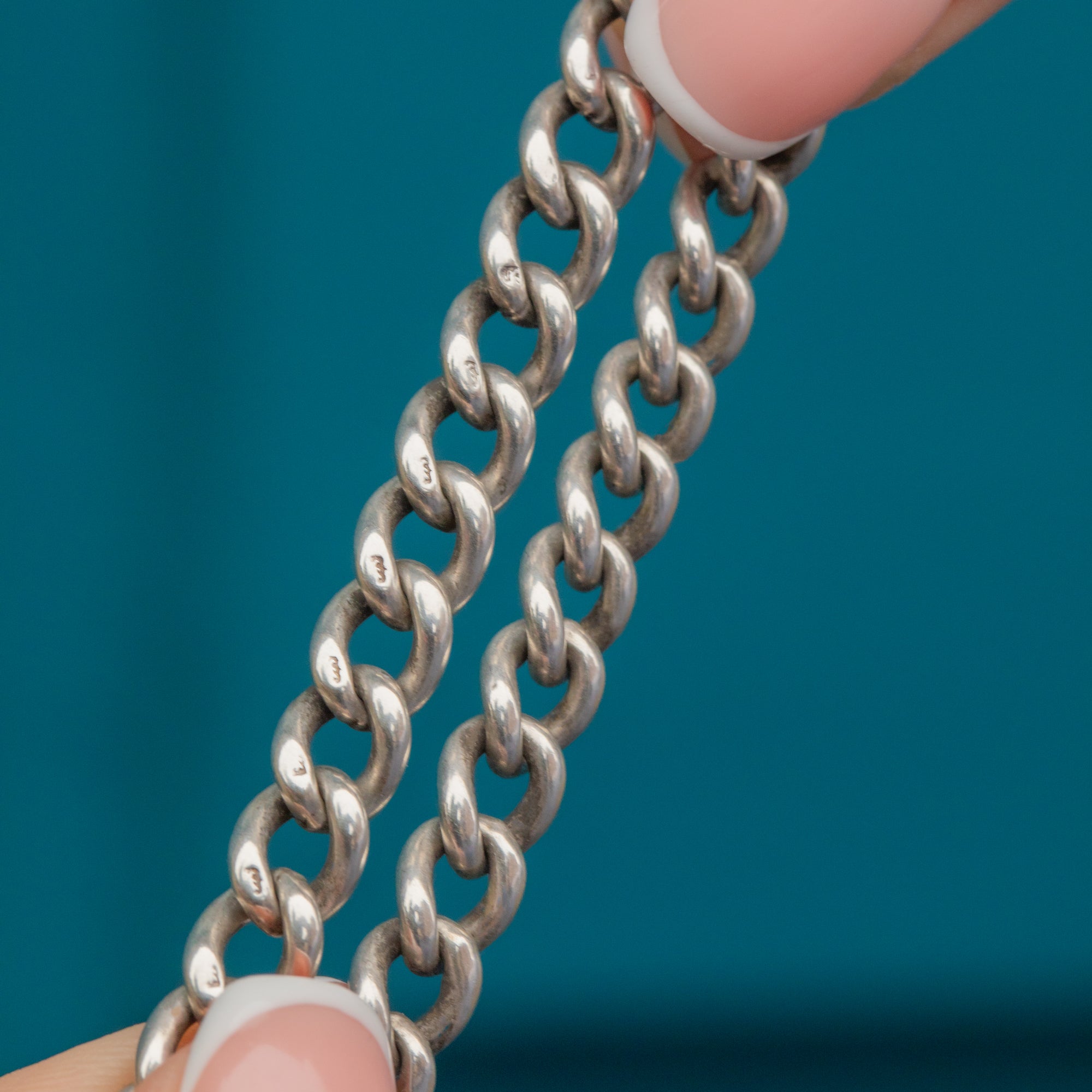 A timeless addition to any collection, this 18" antique Silver Albert chain is a must have! Her 18" length is formed of perfectly interwoven chunky curb links, each one stamped with a Lion Passant and sits snug accentuating your neckline.