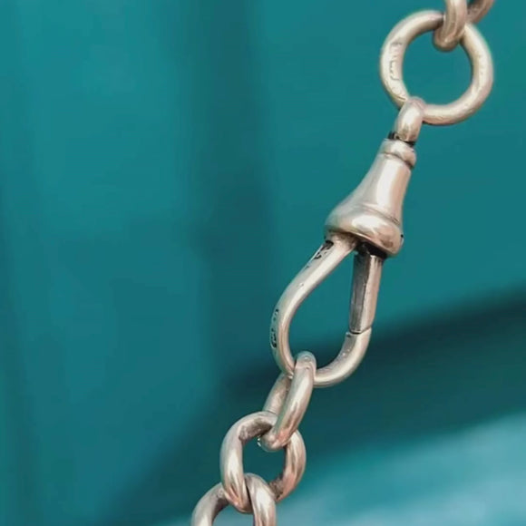 VERY GOOD. This 18" antique Silver Albert chain is in fantastic condition. As can be expected from a Victorian era piece, there is some signs of minor wear. The dog clip has a slight wobble but still opens and closes securely holding the chain together. The Silver has accrued an admirable patina, which we think emphasises her punky allure.