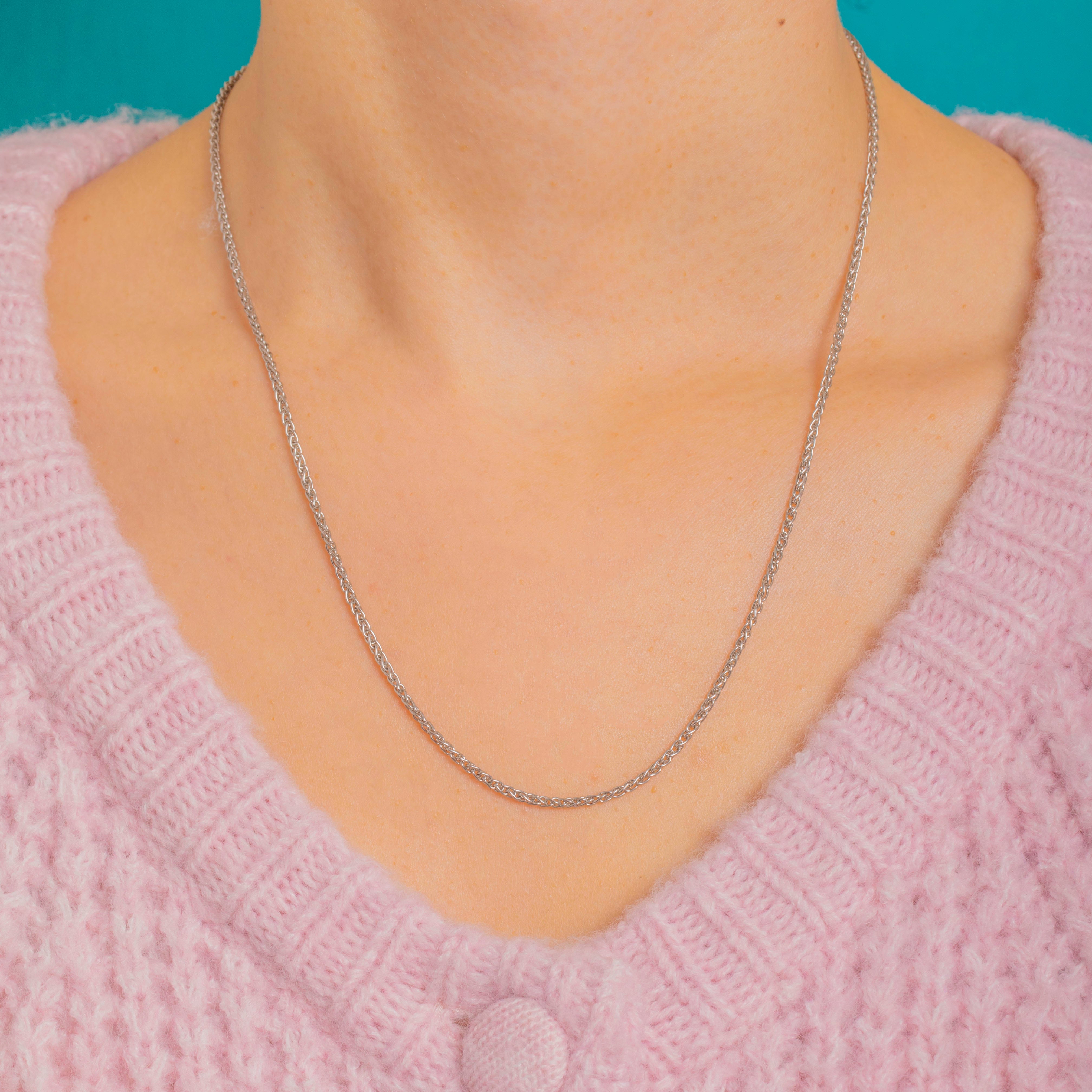 A sleek staple crafted in solid Platinum, this classic Spiga (wheat) chain is tightly woven for a smooth, rope-like silhouette that glows with a bright, mirror polish. Its fluid drape and refined profile make it effortlessly elegant worn alone, and perfect as a luxe foundation for your favourite pendant.