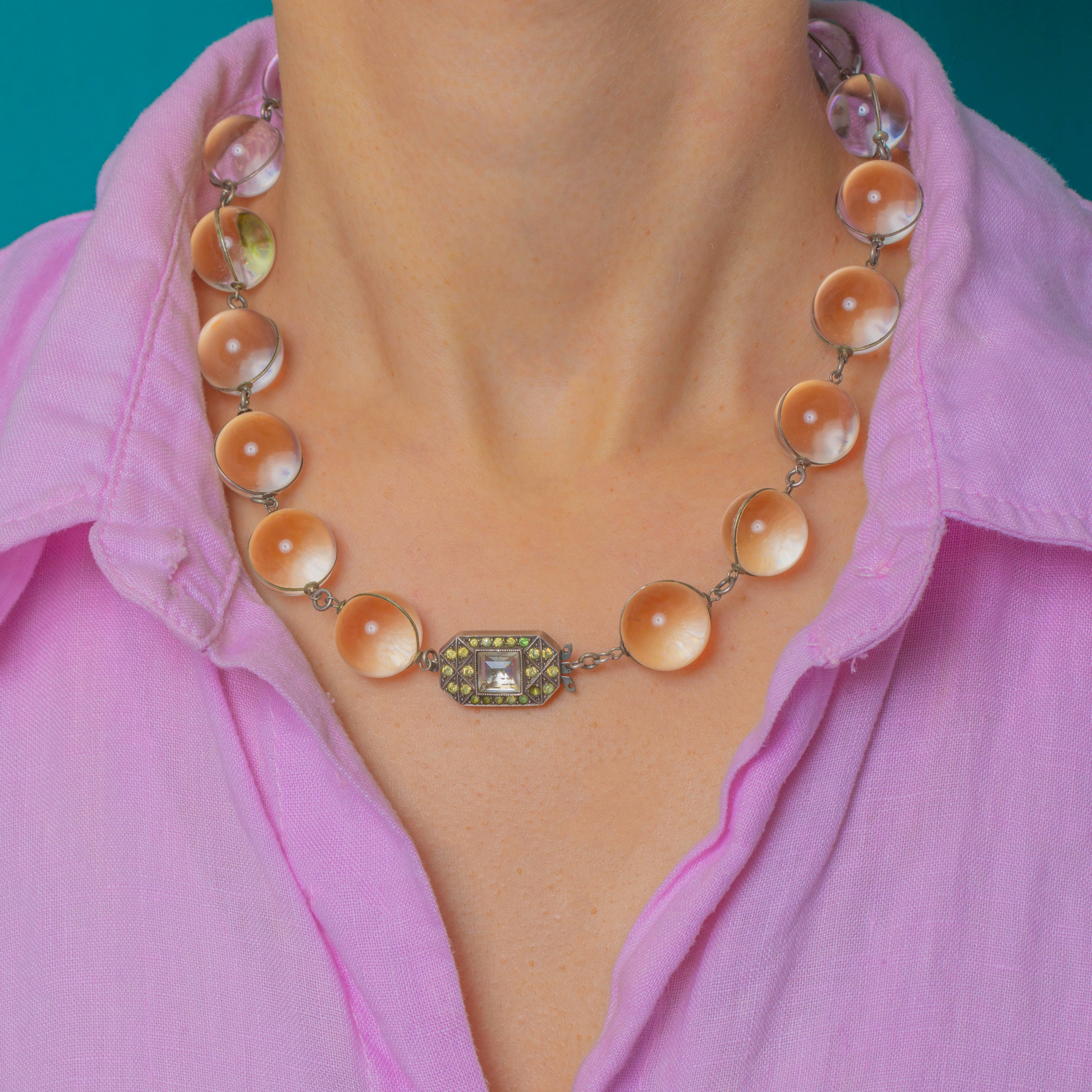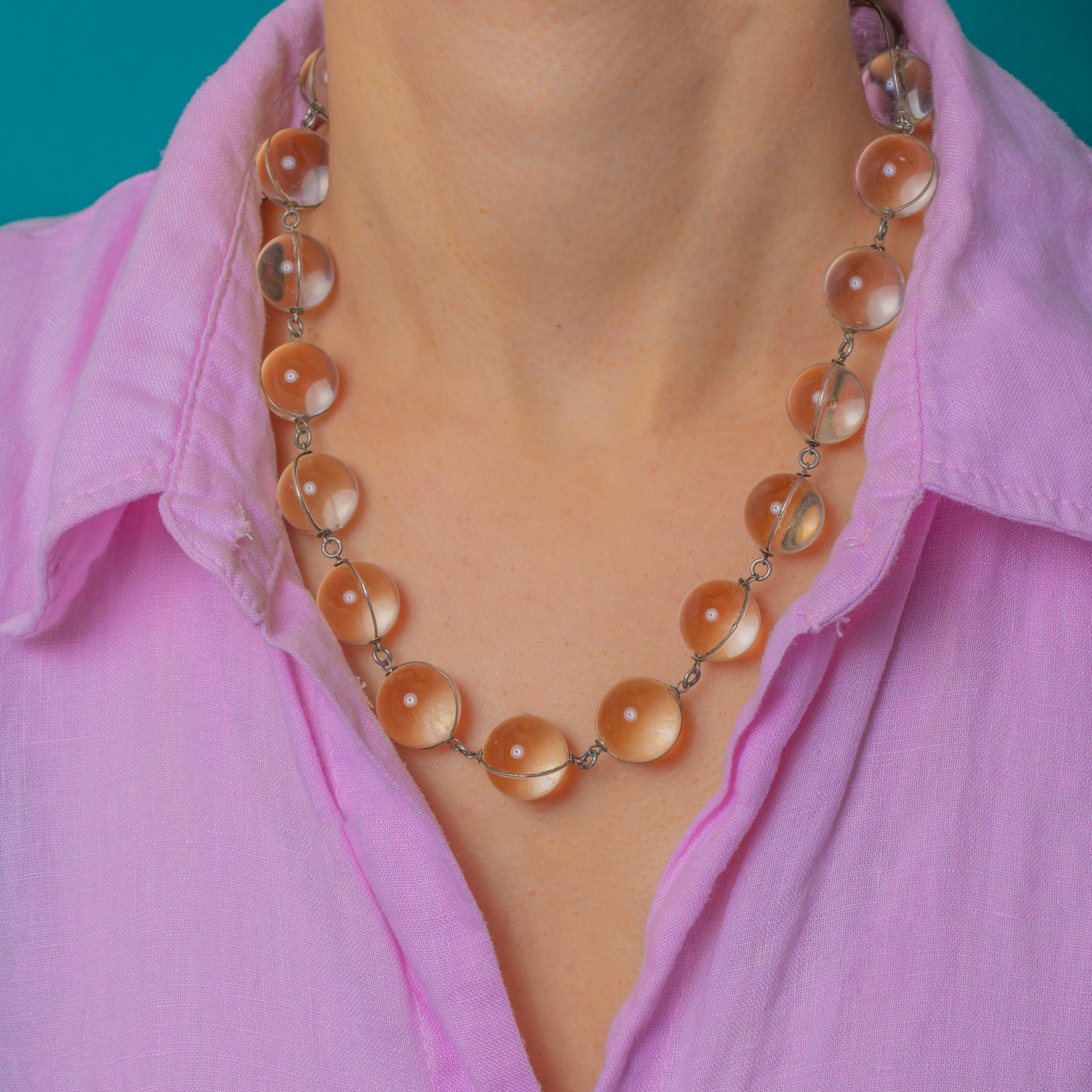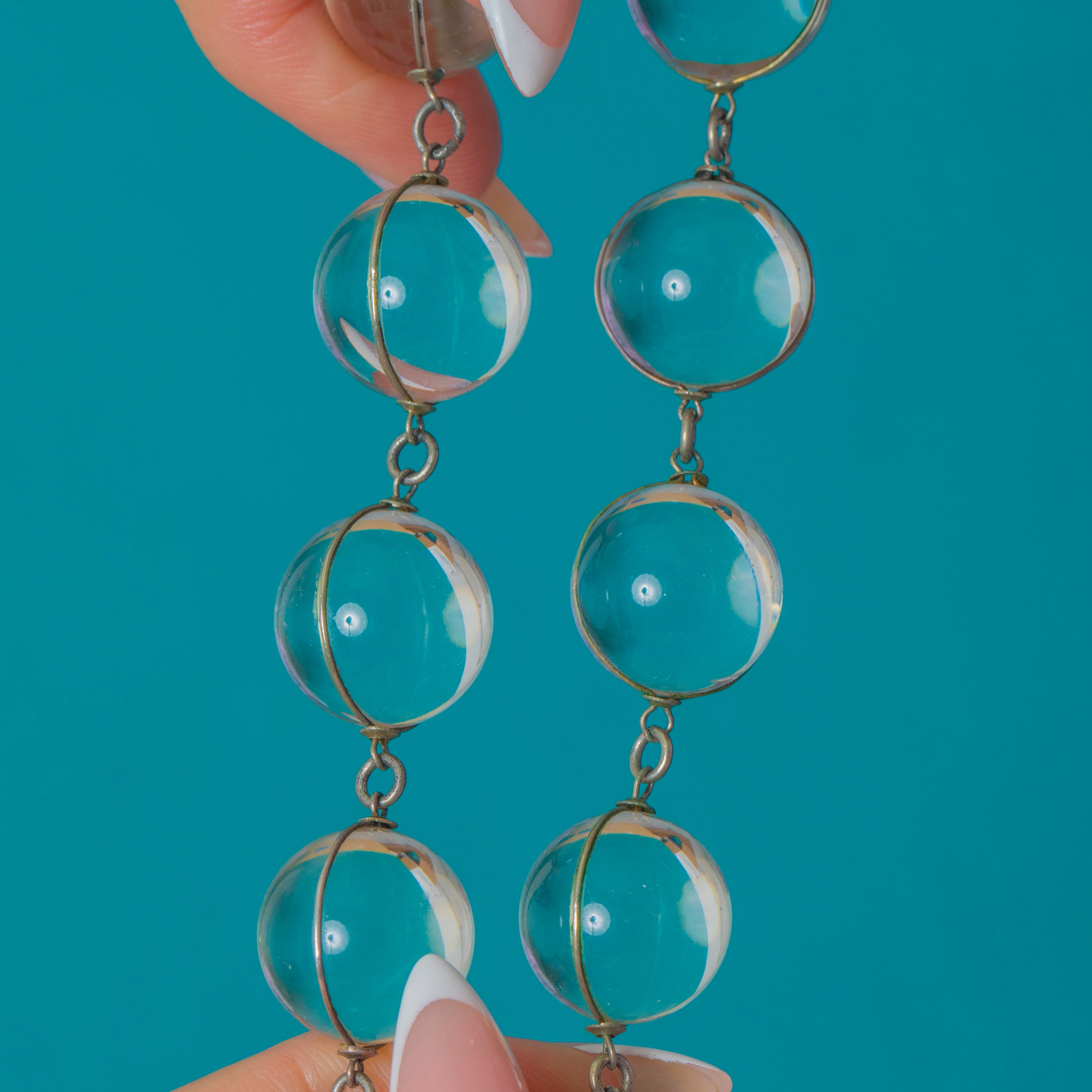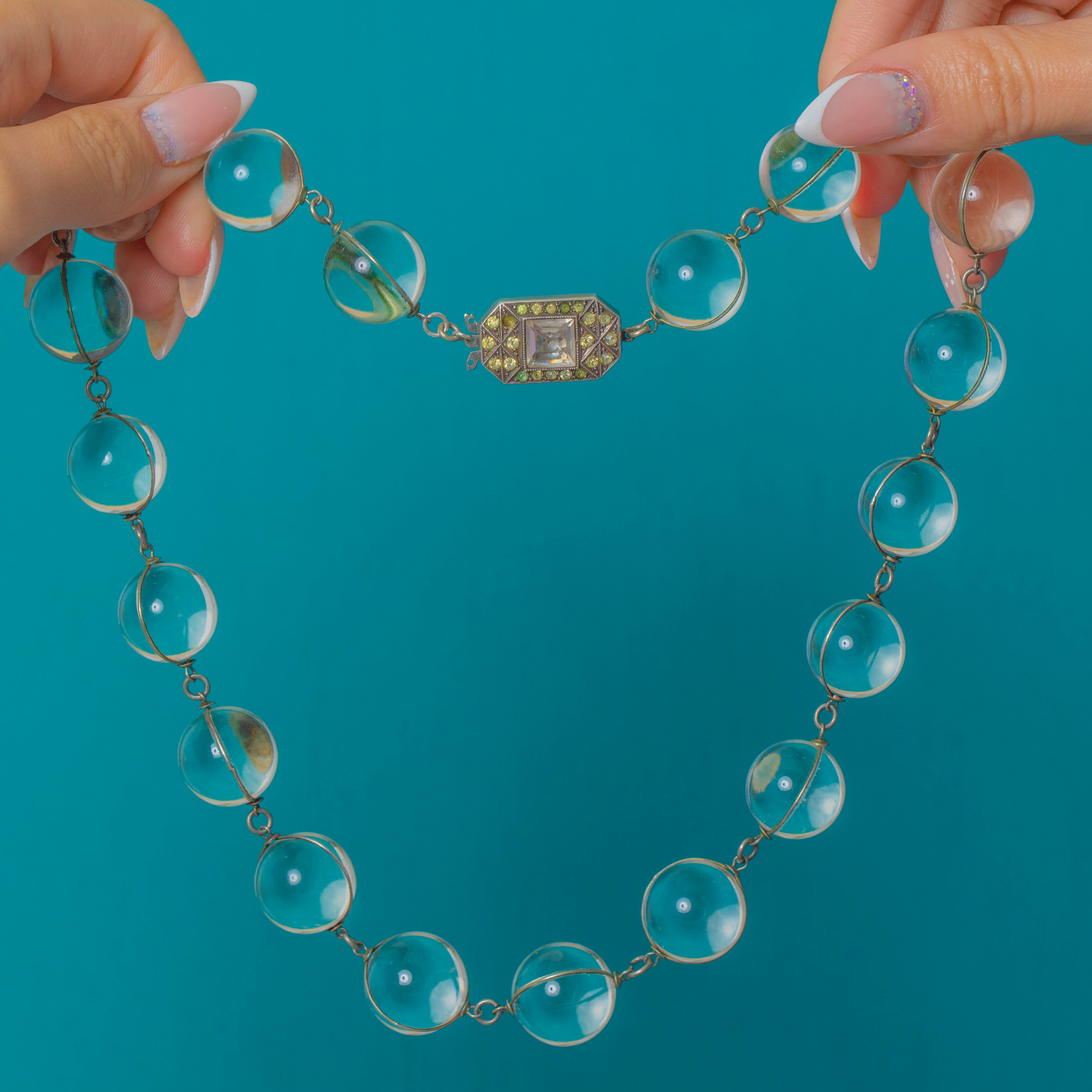 Diese Victorian Pools of Light-Kette ist ein atemberaubendes Schmuckstück, das große 15,5mm Rock Crystal-Kugeln präsentiert, die mit ätherischem, innerem Licht erstrahlen. Diese vollkommen klaren Sphären vergrößern alles, was sie berühren, und verleihen so ein magisch illuminiertes Erscheinungsbild, das nur echter Pools of Light-Schmuck bietet.