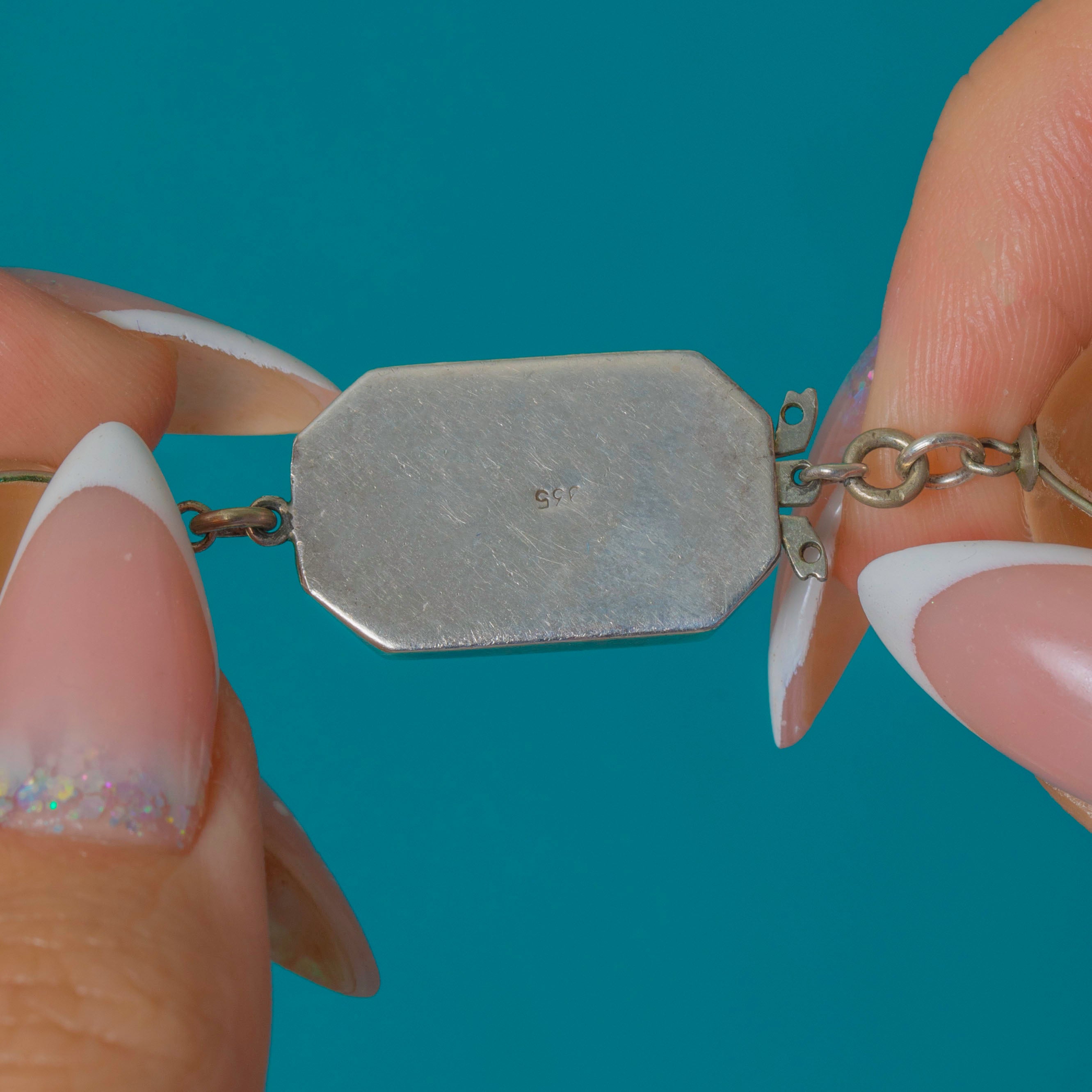 Die 18"-Kette wird mit einem kunstvoll verzierten Sterlingsilberverschluss vollendet, besetzt mit gelber Paste und einem dekorativen quadratischen Paste-Akzent – ein edler Hauch Victorian Glanz. Eine seltene, hochsammlerwürdige Kette mit außergewöhnlicher Ausstrahlung.