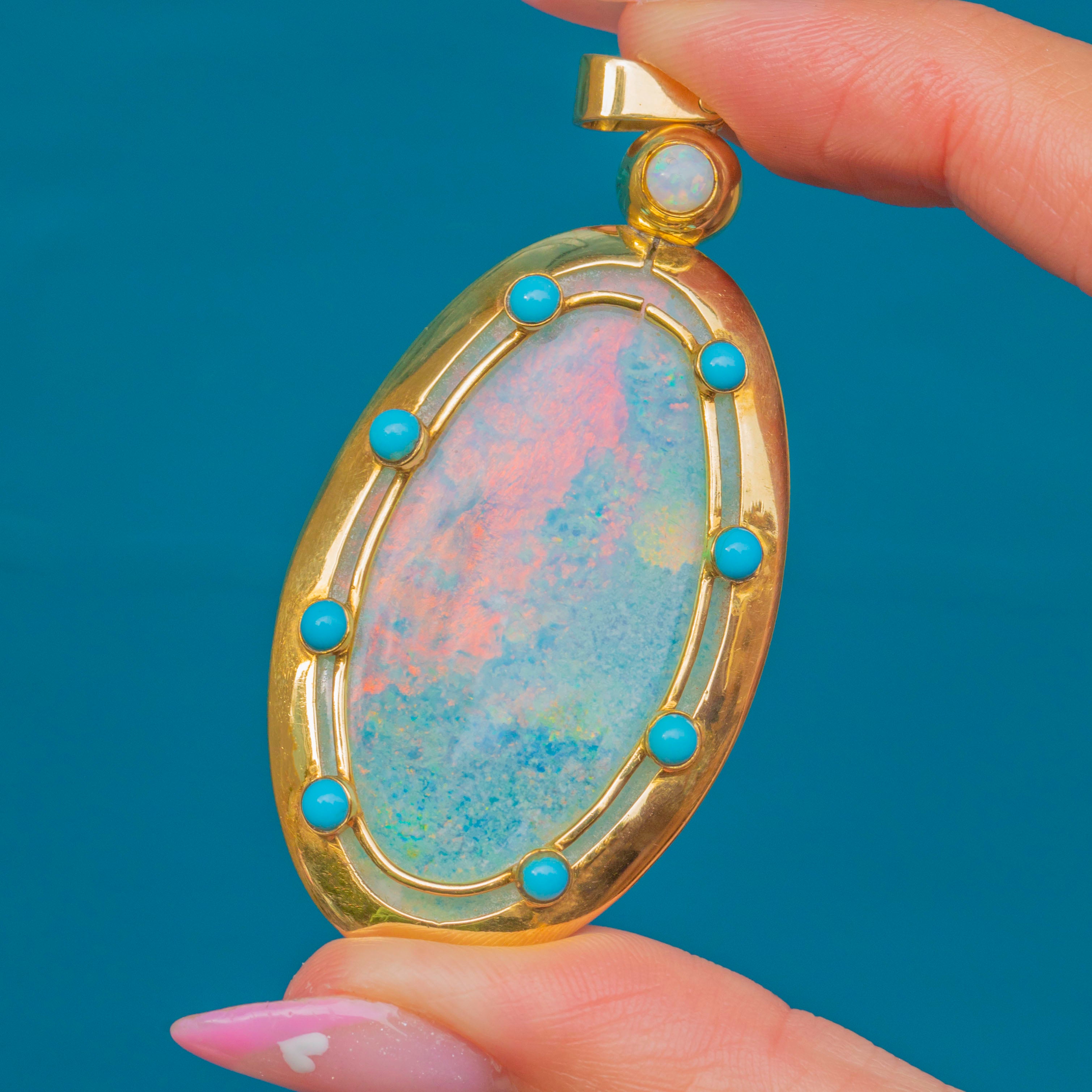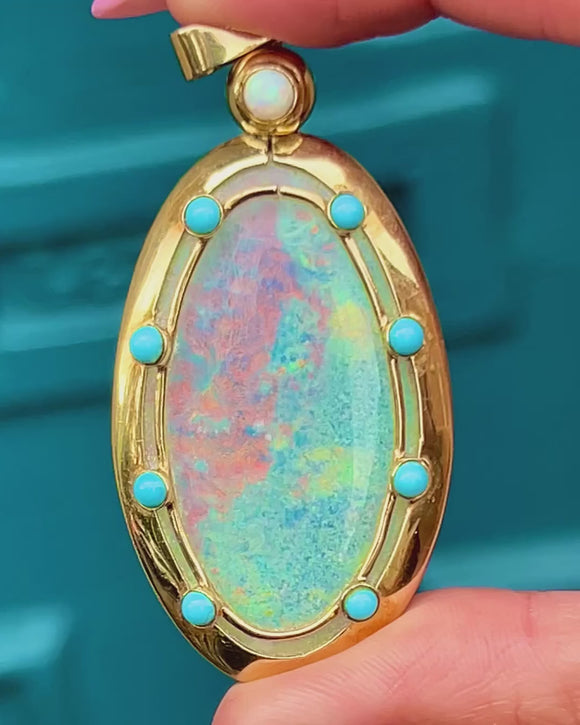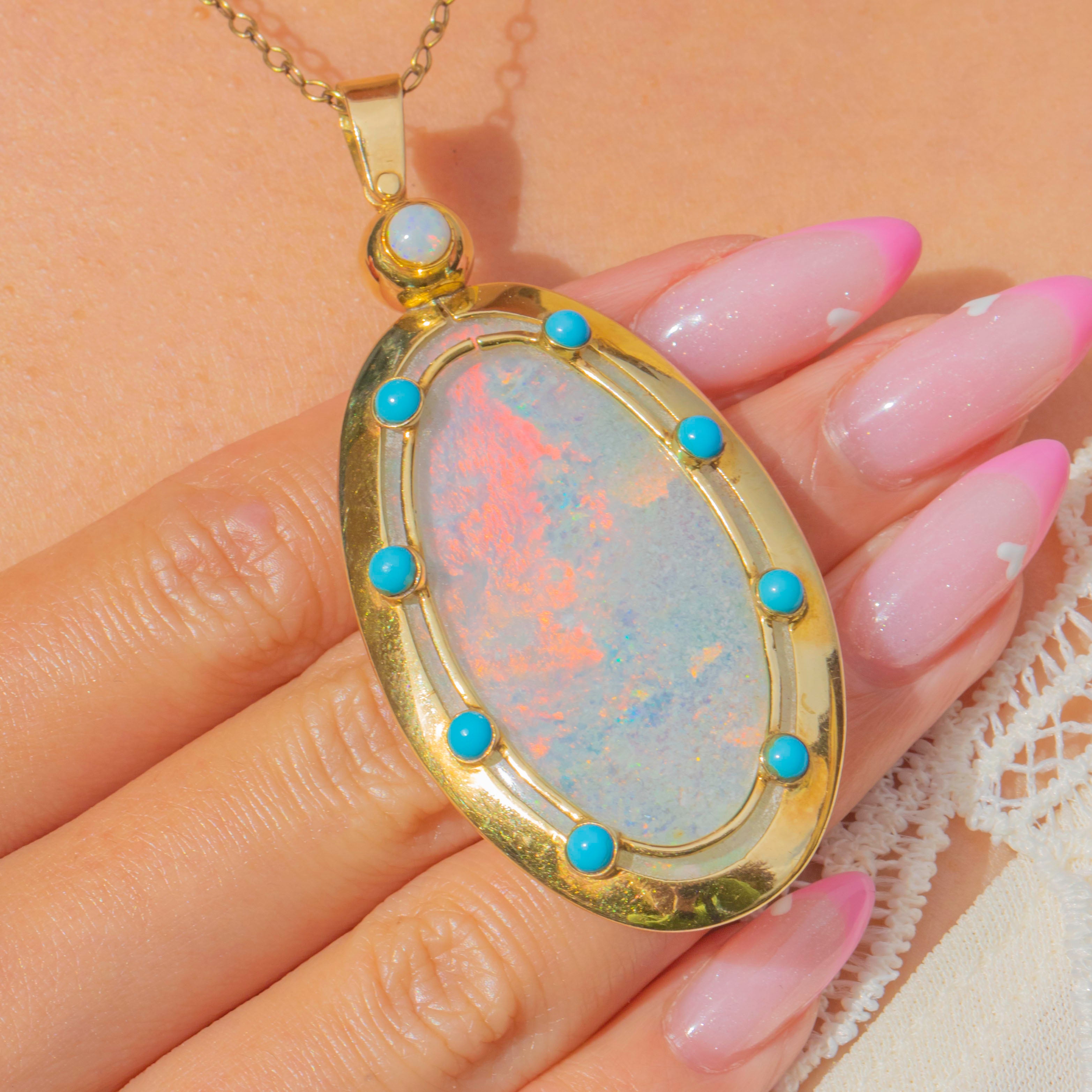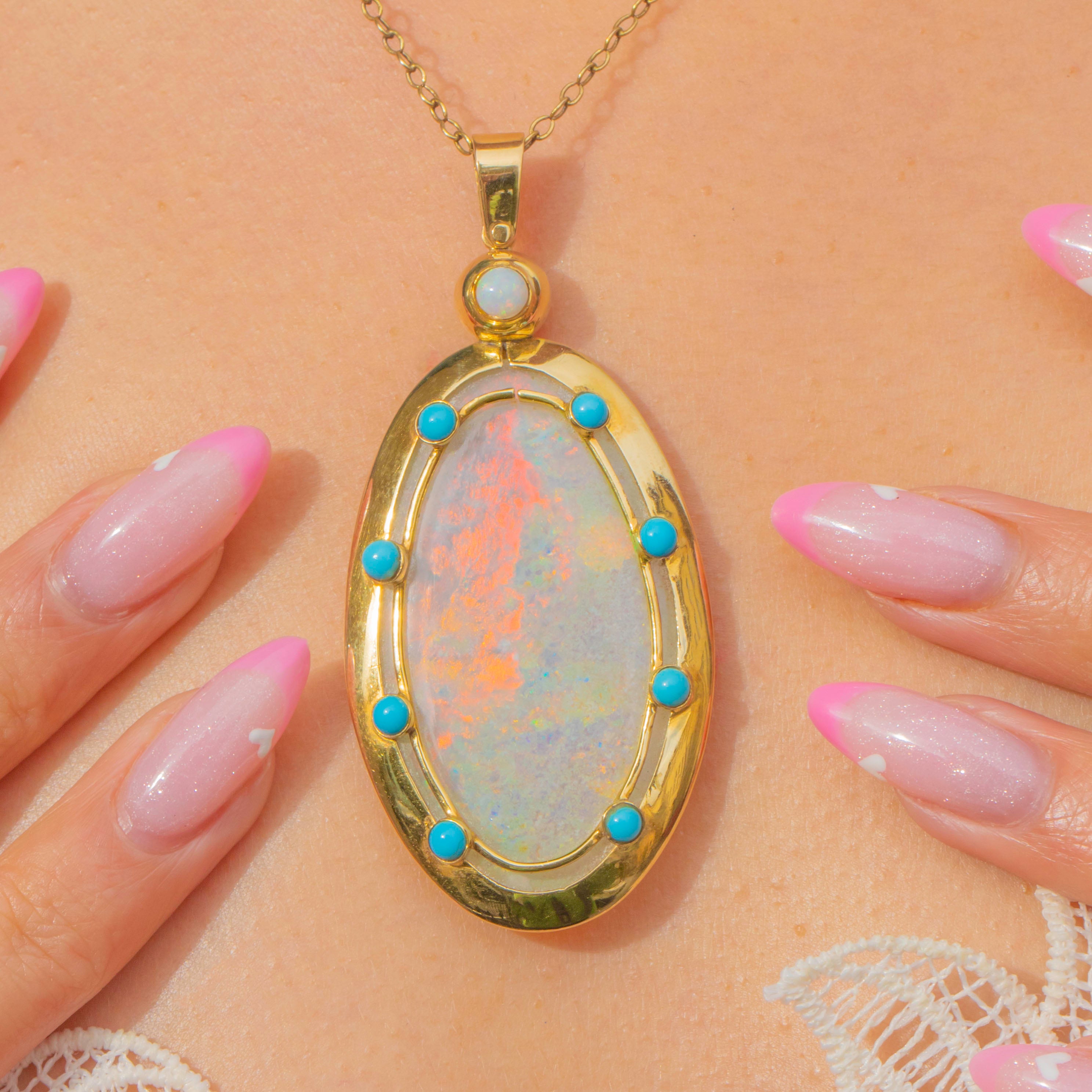 An extraordinary Mid-Century pendant showcasing a large 55.00ct Andamooka Opal set in luxurious 18ct Gold, framed by bright Turquoise cabochons. The natural Opal exhibits spectacular play-of-colour, flashes of green, gold and blue that shift beautifully with movement. Treated to enhance its colourplay, this Australian gem is full of depth and life, a statement piece that captures the bold glamour of the 1950s–60s era.