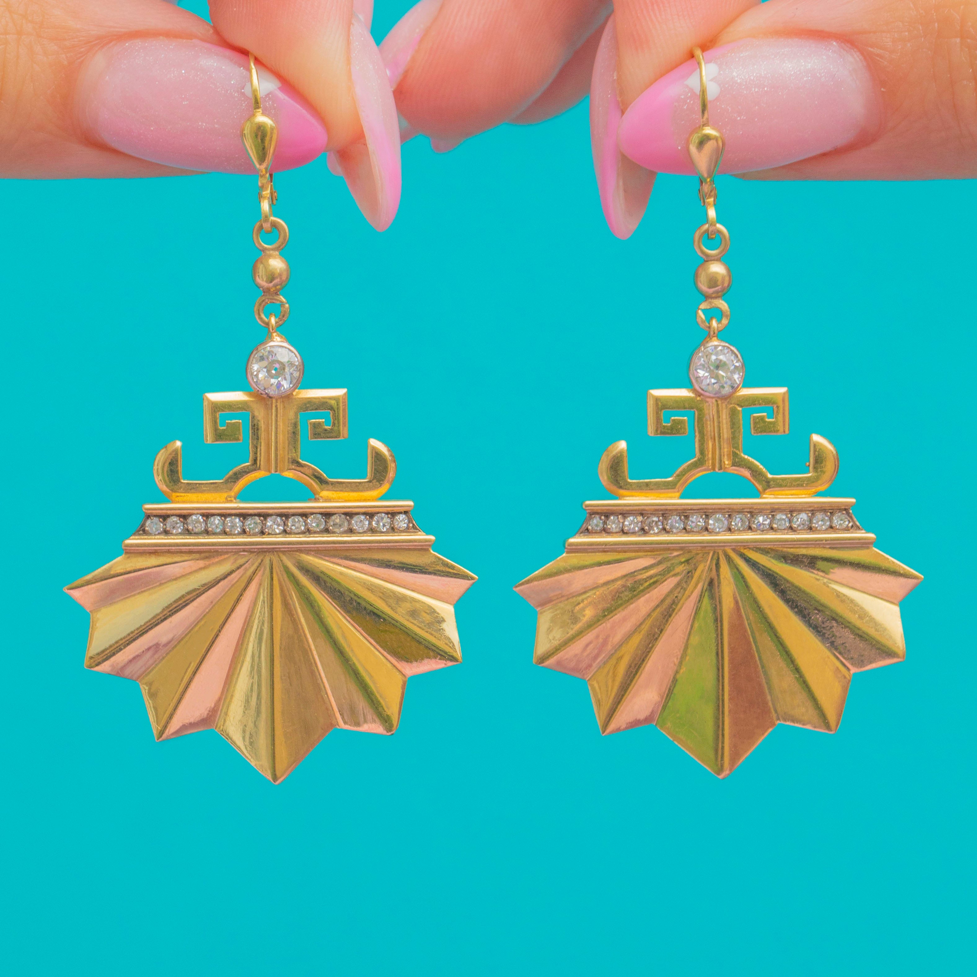 18ct Gold Art Deco Diamond Fan Earrings 0.73ct
