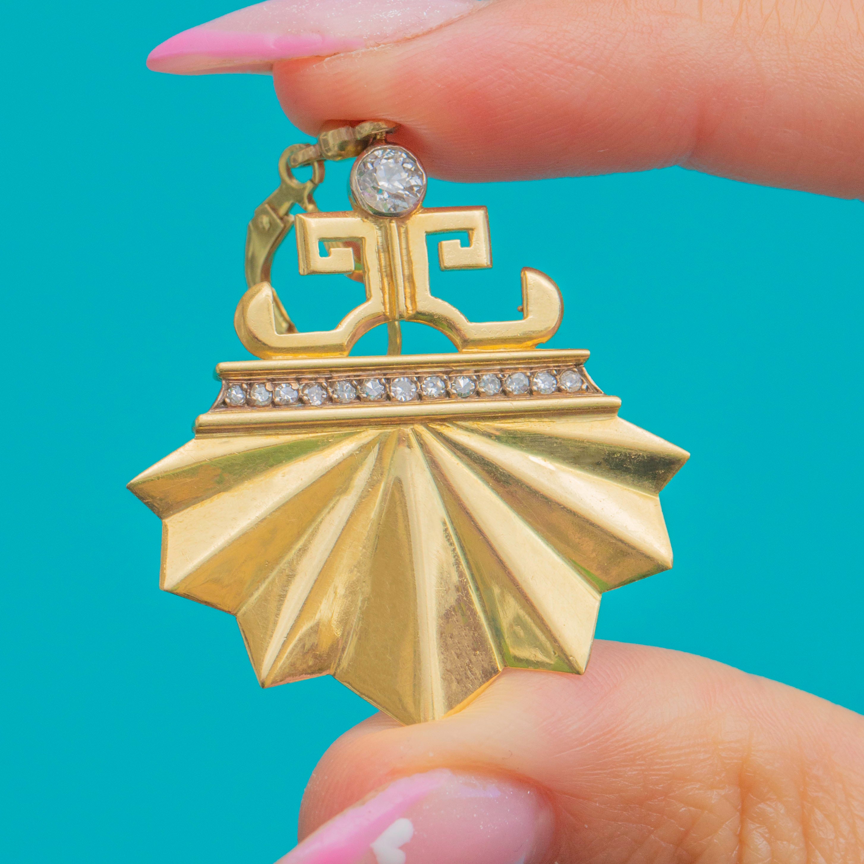 Exquisite and architectural, these Art Deco earrings are crafted in rich 18ct Gold and set with glinting Diamonds in a dramatic fan-shaped design. The bold geometric form captures the glamour and precision of the Deco era, while the later-added Gold ear hooks ensure comfortable and secure wear.