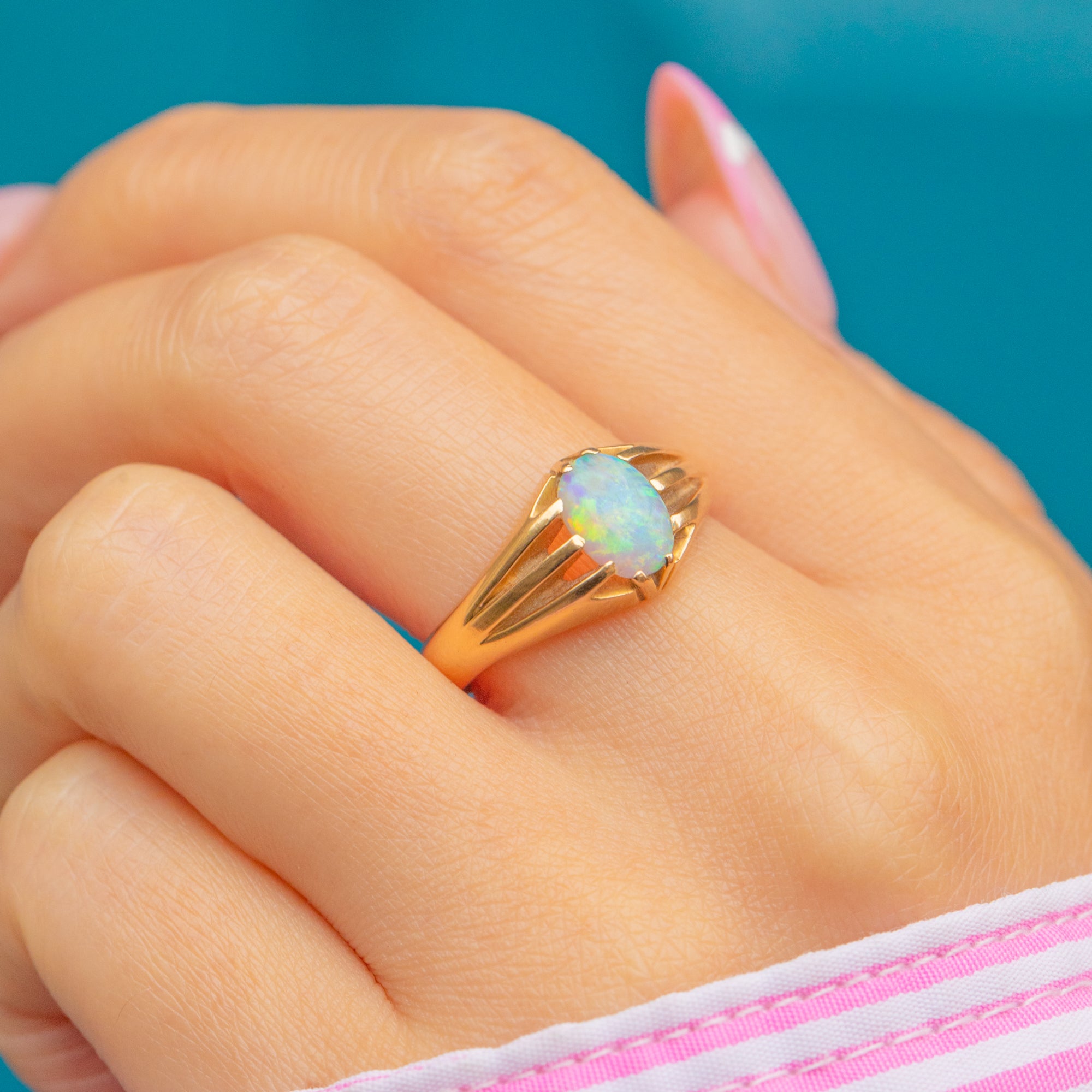 EXCELLENT: Beautiful antique condition with a vivid, well-preserved Opal showing strong play of colour. Hallmarks are slightly worn but still legible, and the Gold remains bright and smooth throughout. There is a visible resize mark at the back.