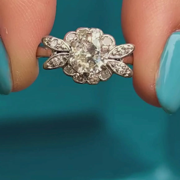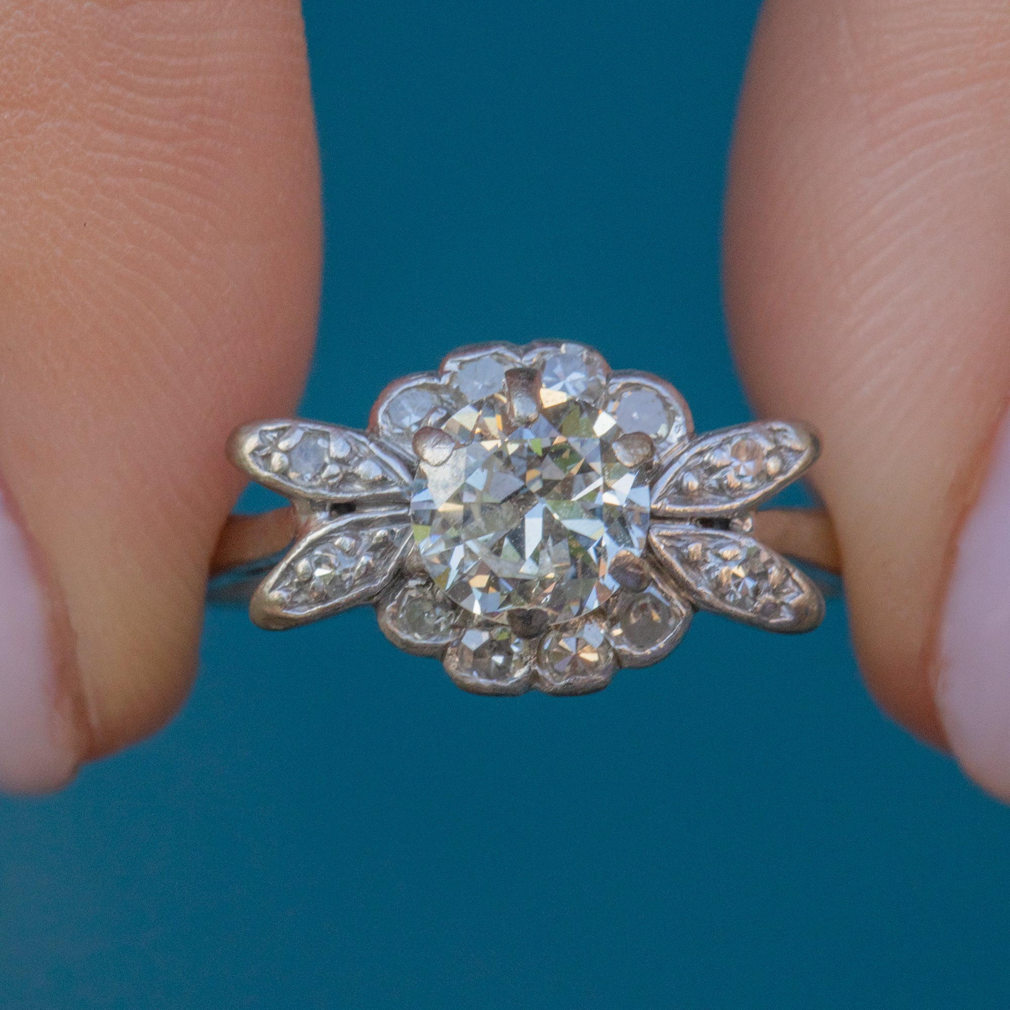 This beautifully curated 18ct Gold Edwardian Diamond bow ring sits proudly upon the finger, with a large 0.75ct Old-European Diamond situated in the centre with J colour and Vs-Si clarity!