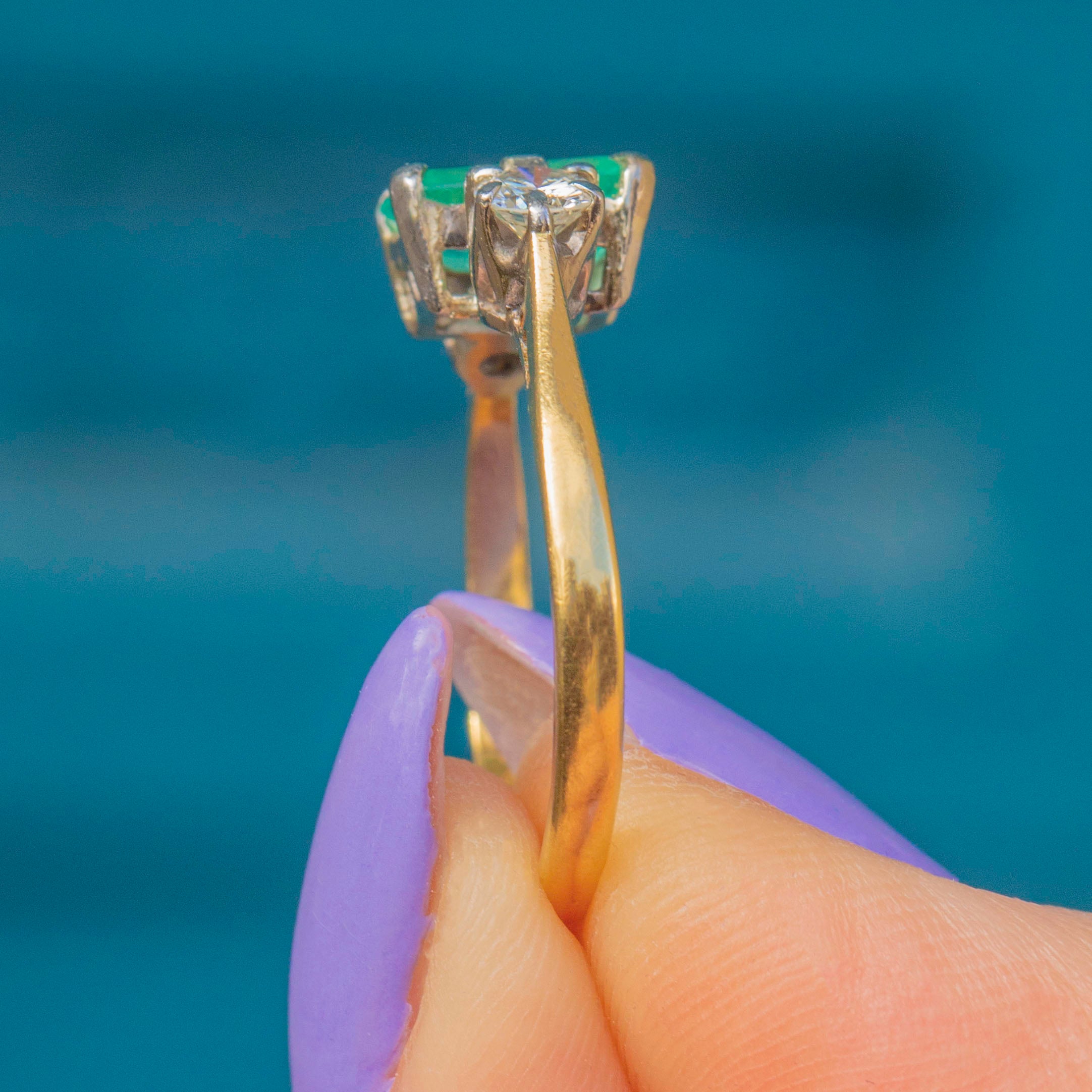 A divine 18ct Gold Emerald and Diamond trilogy ring to adorn your hand! Crafted from an 18ct Gold with Platinum settings, this is a robust piece that you can pop onto your finger for a vibrant pop of colour.