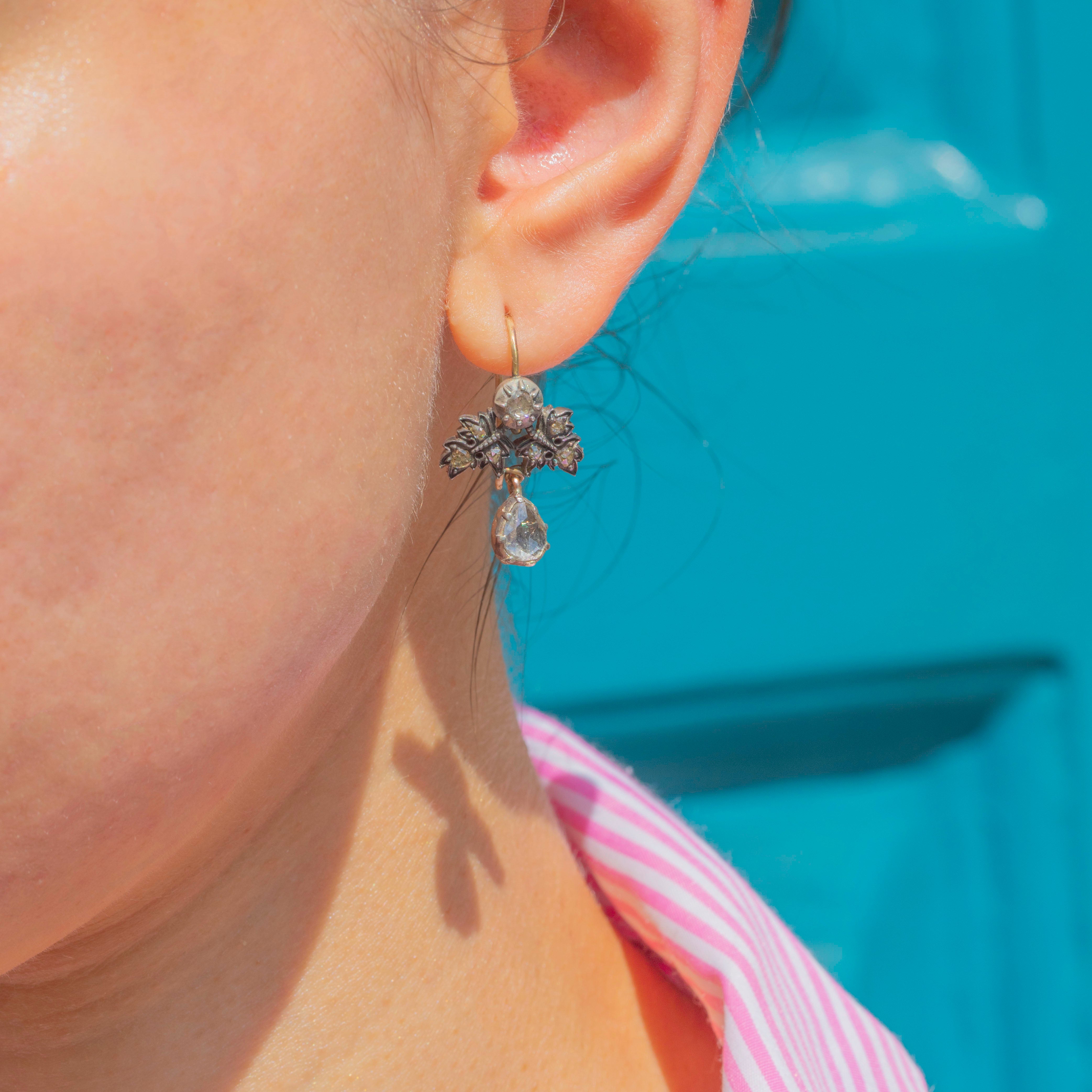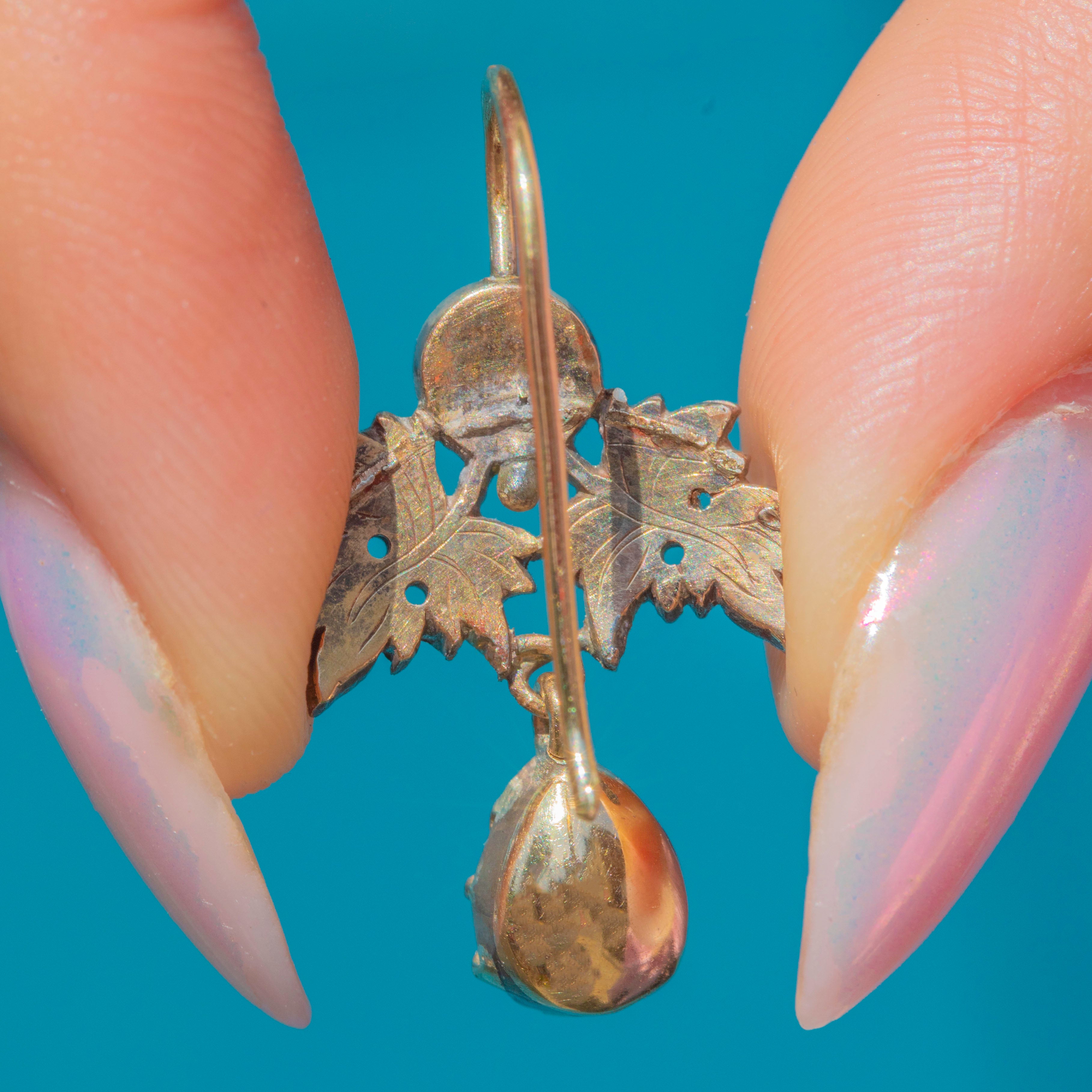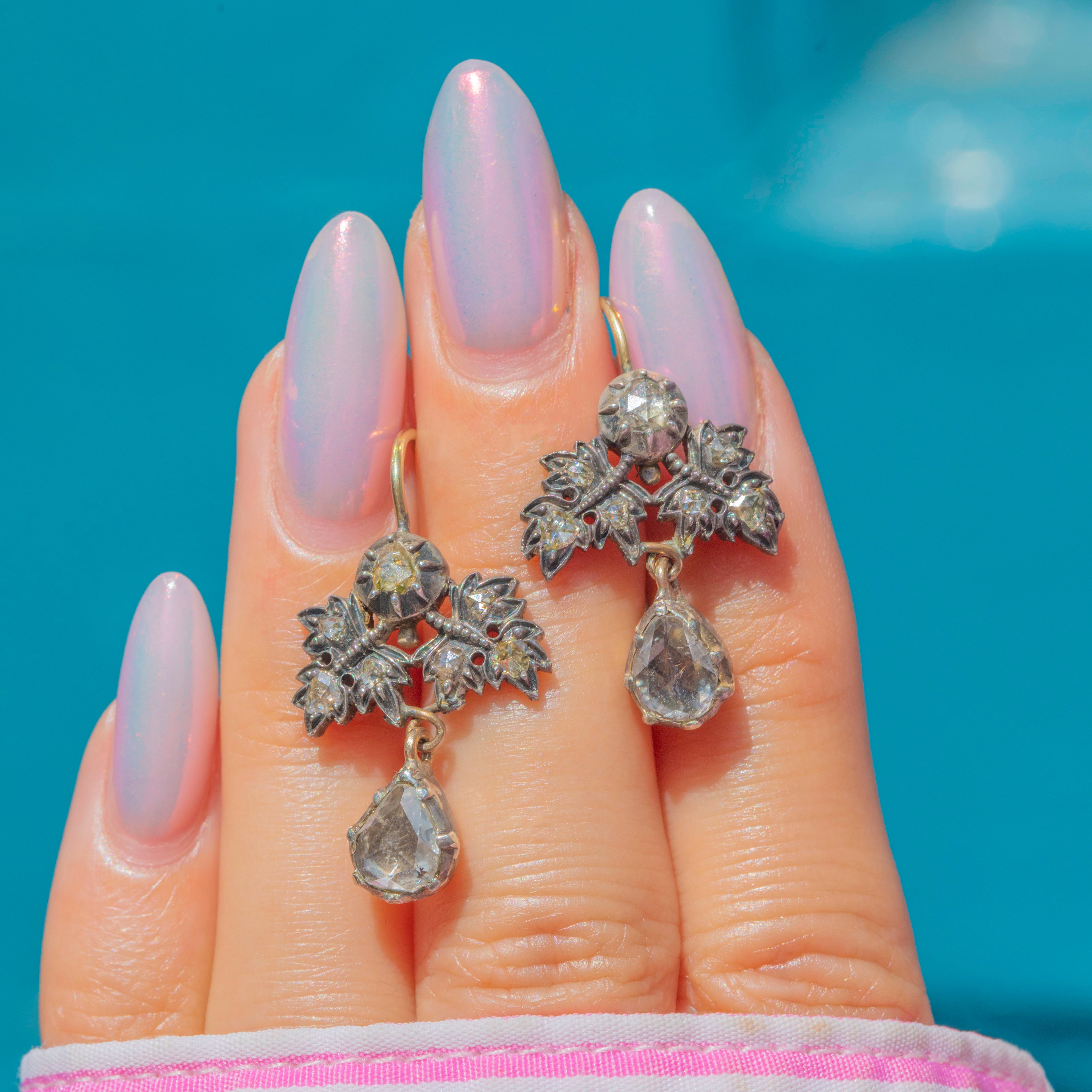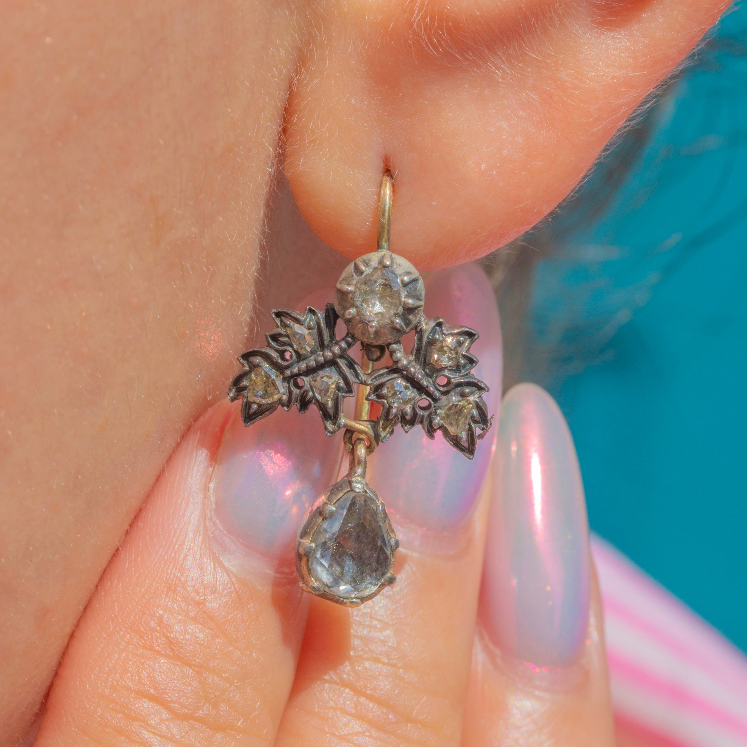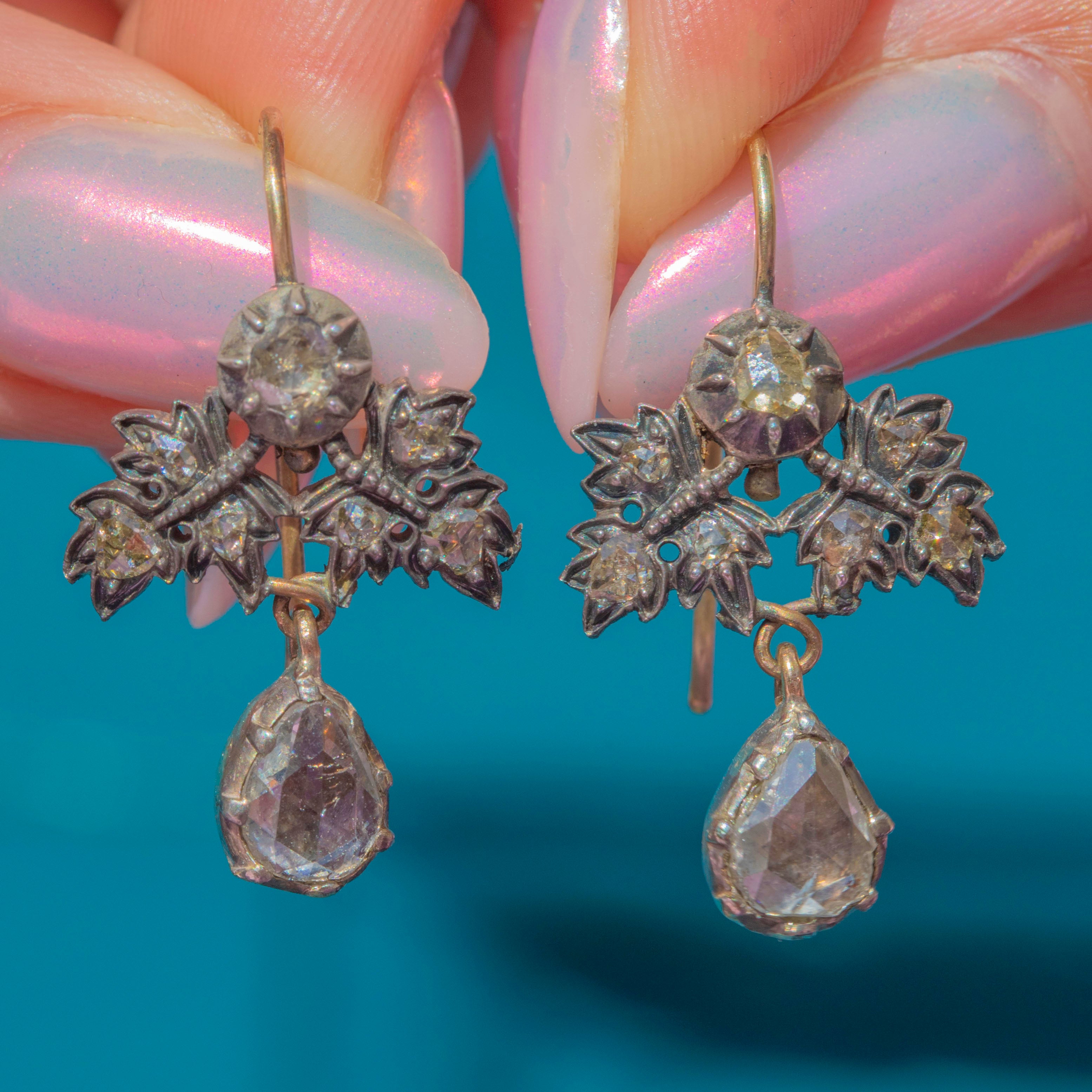 Complete with Silver settings, 18ct Gold hooks and rare Georgian rose-cut Diamonds, these antique earrings are certainly show stoppers!