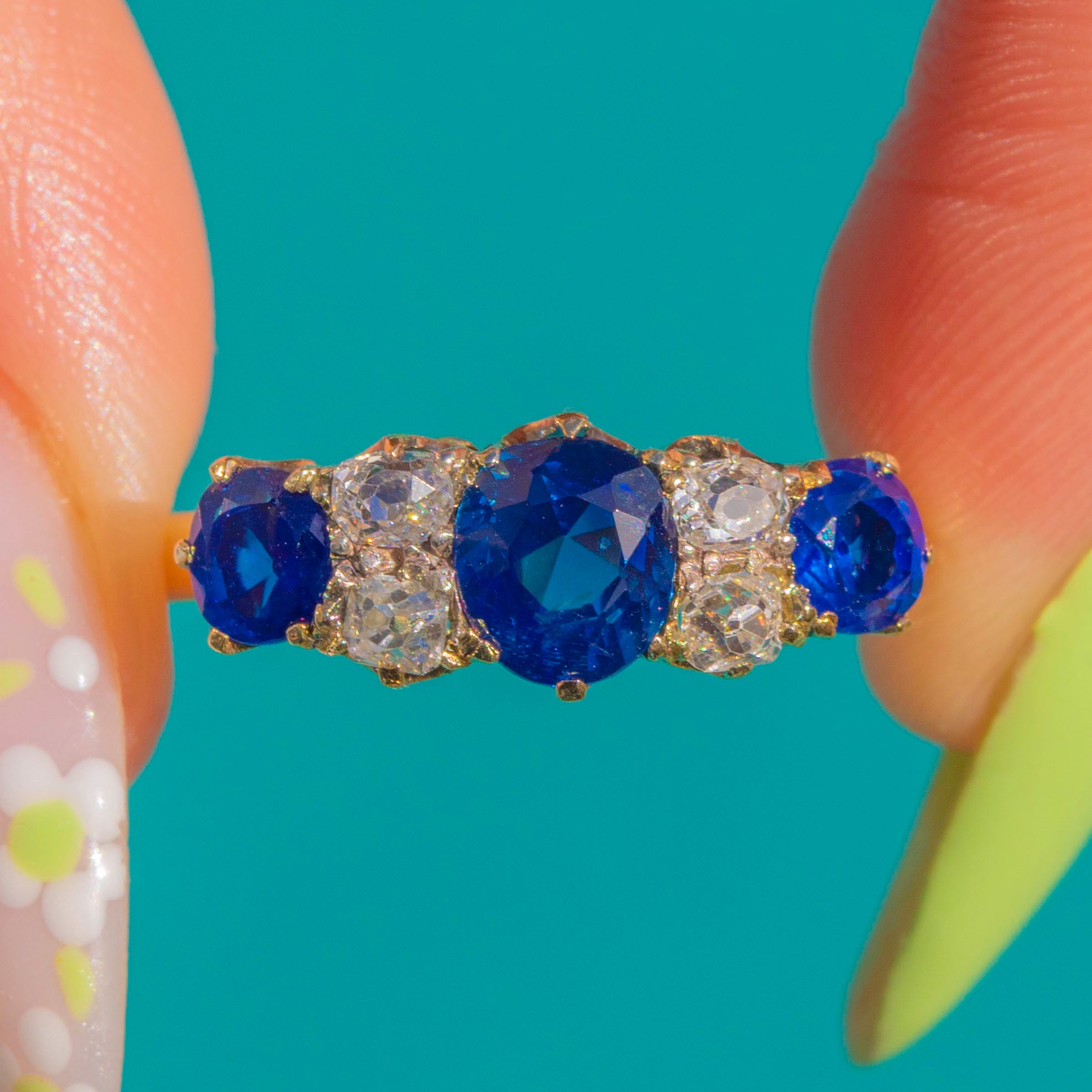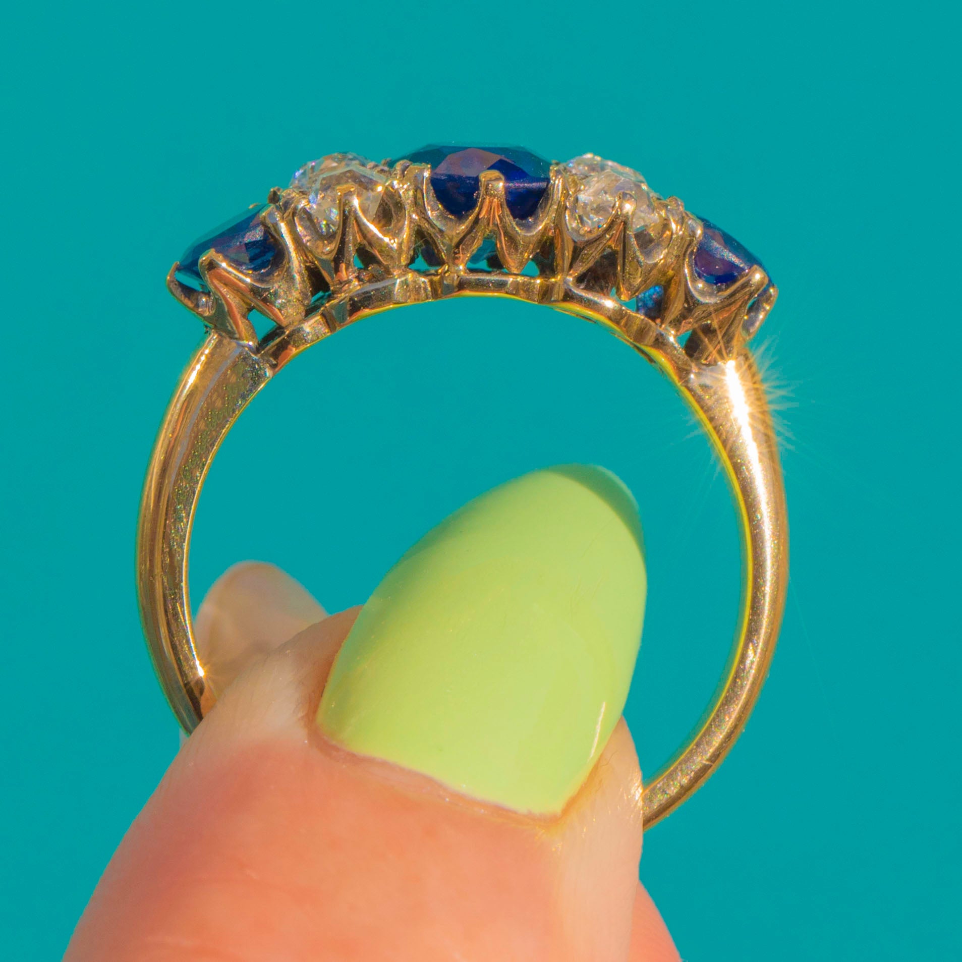 Herrlich Victorian und exquisit gearbeitet, präsentiert sich dieser fünfsteinige Ring in sattem 18ct Gold mit einer anmutigen, erhöhten Krone und durchbrochener Galerie. Ein prachtvoller, königsblauer Saphir steht im Mittelpunkt, flankiert von vier strahlenden Diamanten und zwei weiteren blauen Saphiren, jeweils in individuell geschwungenen Krappenfassungen, die eine zarte, historische Silhouette schaffen.