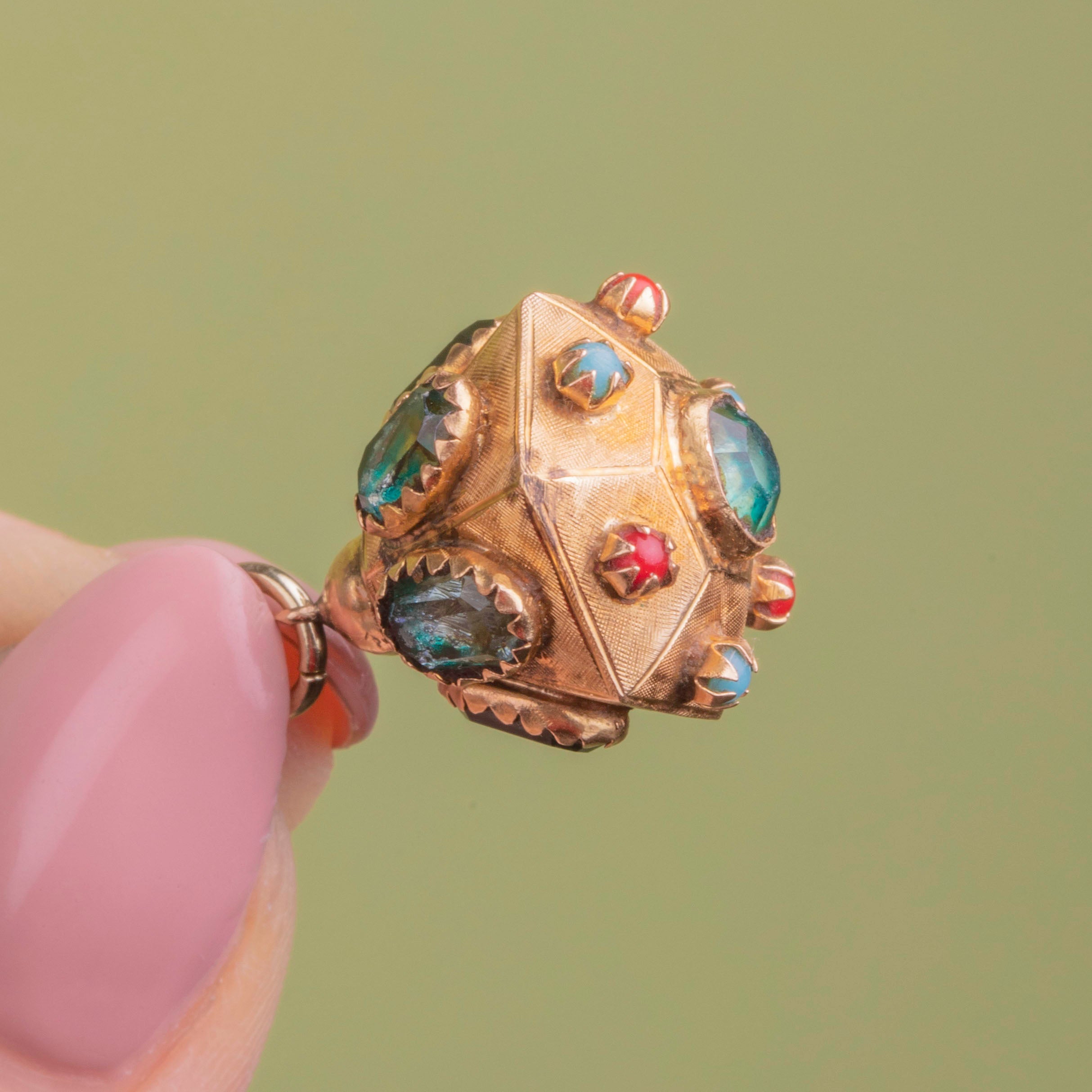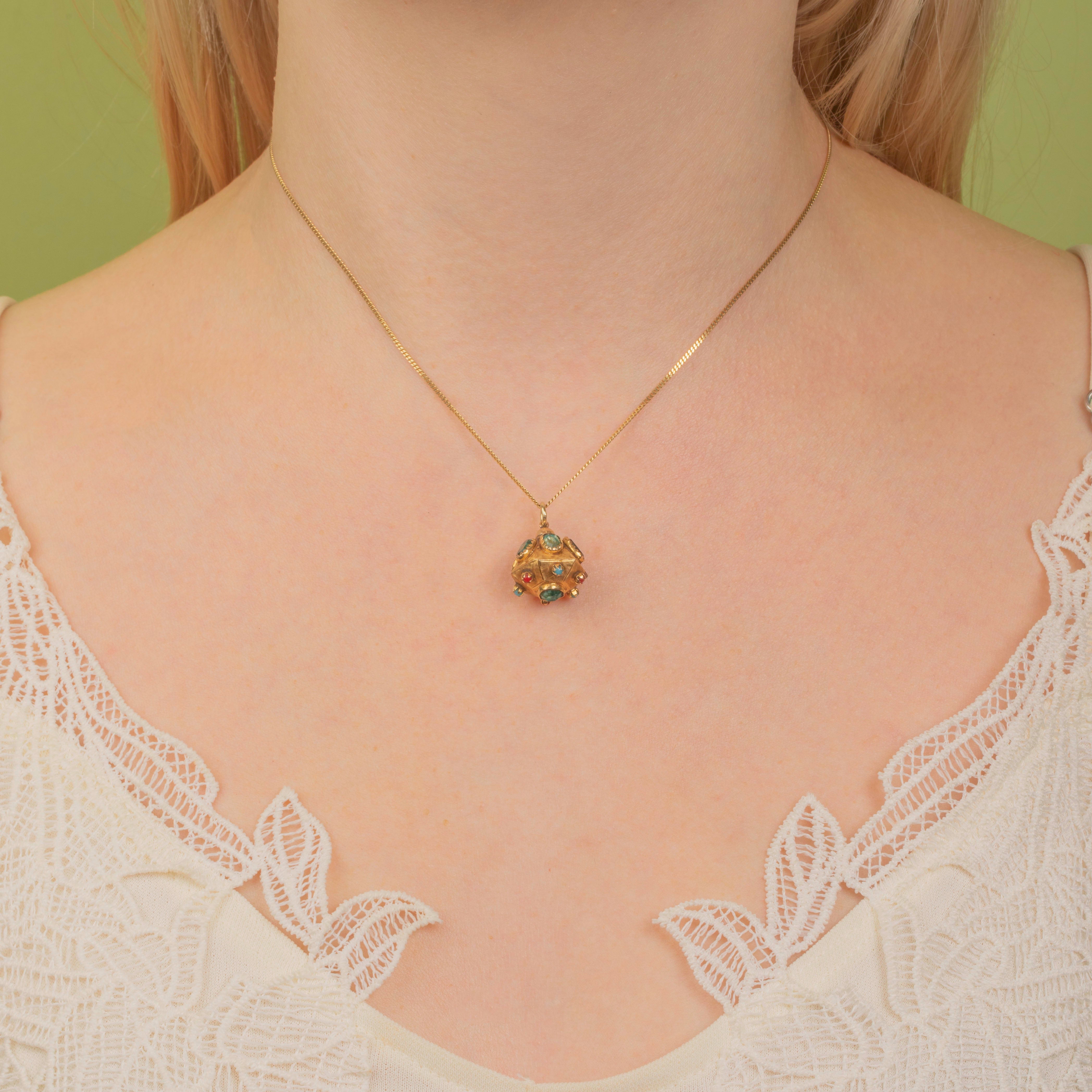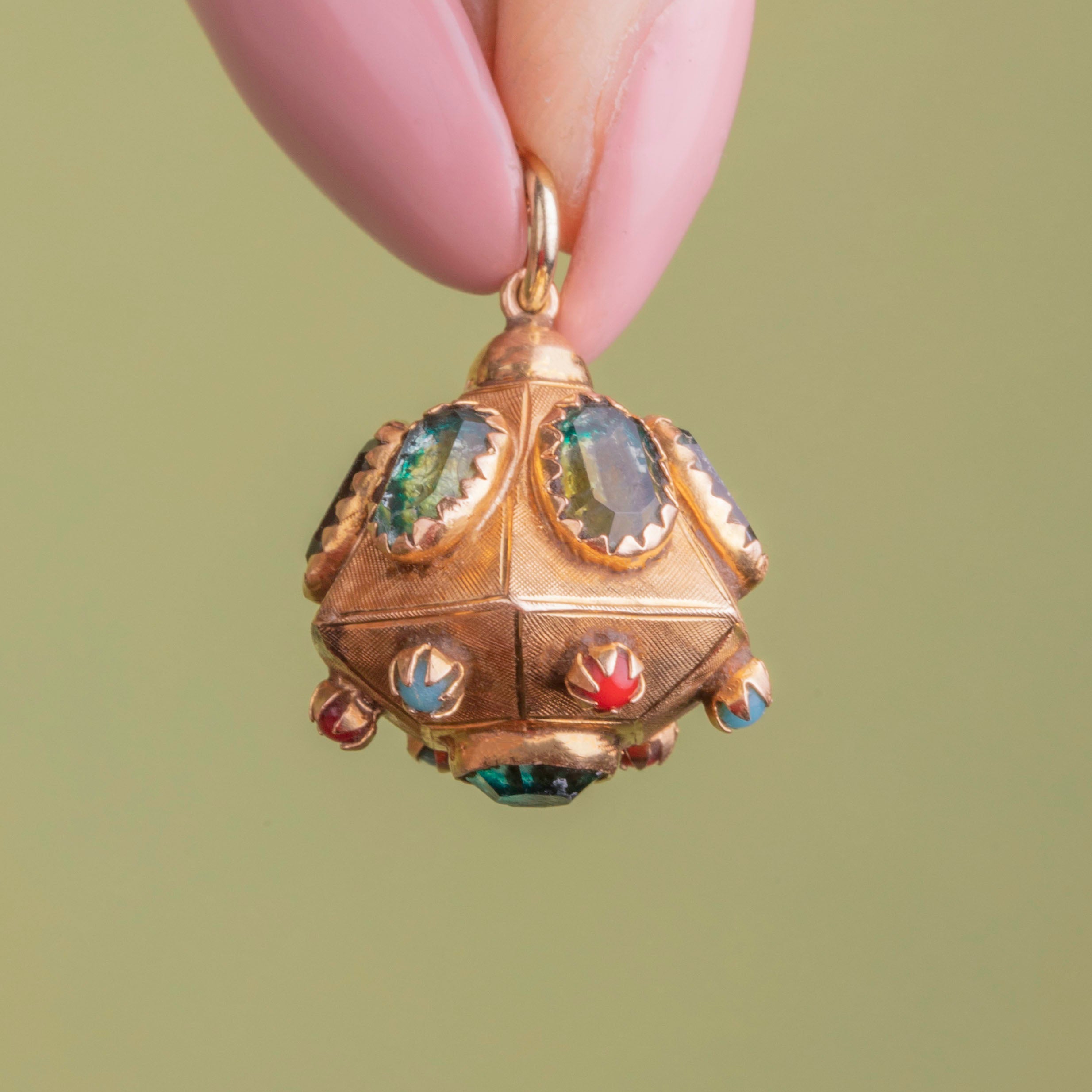 VERY GOOD. This 18ct Gold moon lander UFO pendant is in very good condition. Her Paste stones radiate a gorgeous deep green hue, contrasted beautifully by the subtle red and blue Glass detailing. There are some signs of wear to the 18ct Gold commensurate with age, however, this does not detract from her beauty and simply adds to her uniqueness! This Vintage pendant would make a fabulous addition to your collection.