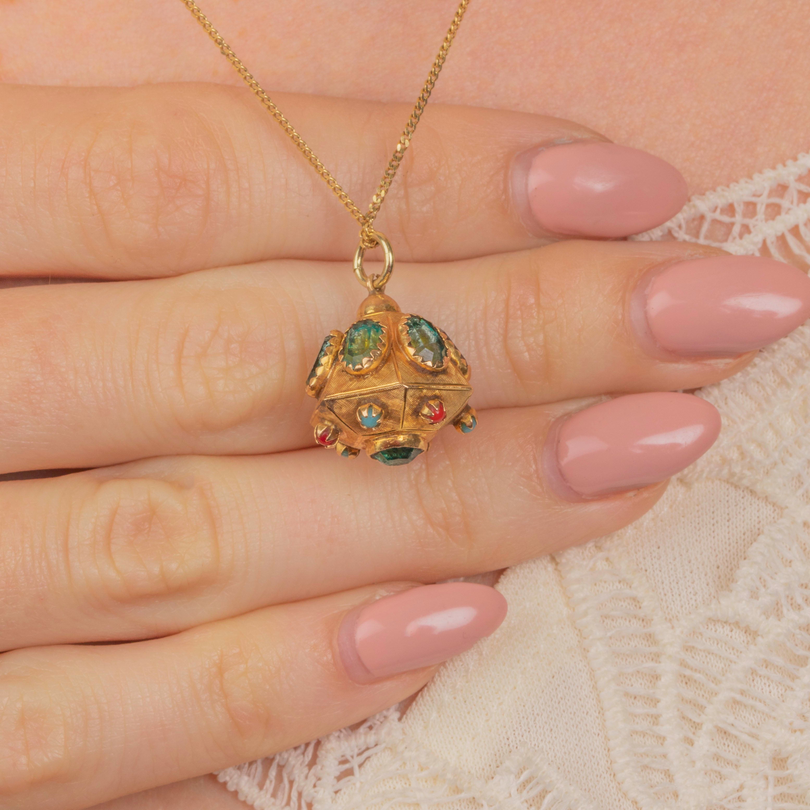 Add a touch of intrigue to your collection with this unique 18ct Gold moon lander UFO pendant! Crafted from rich 18ct yellow Gold, this pendant showcases an intricate UFO spaceship design using richly saturated verdant green Paste and contrasting blue and red Glass.