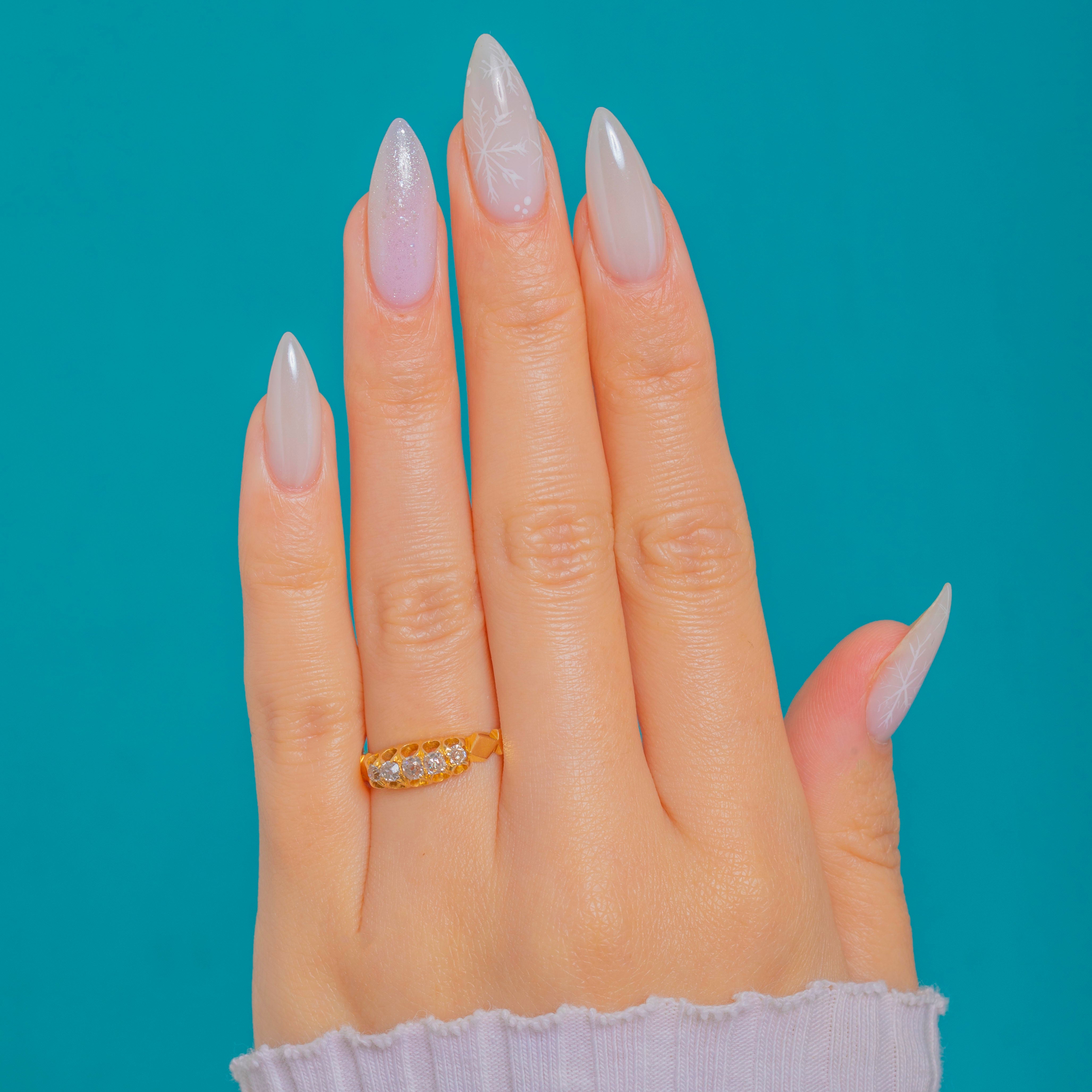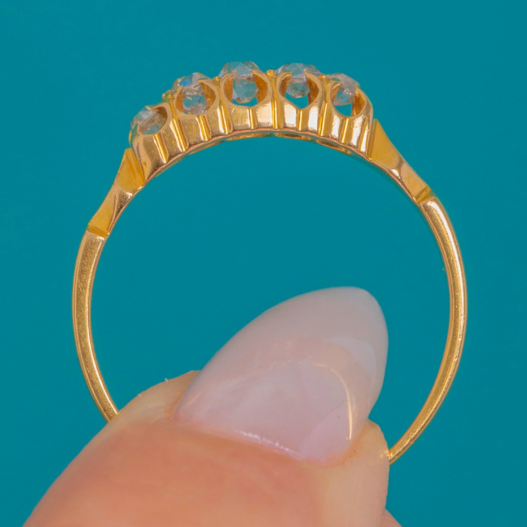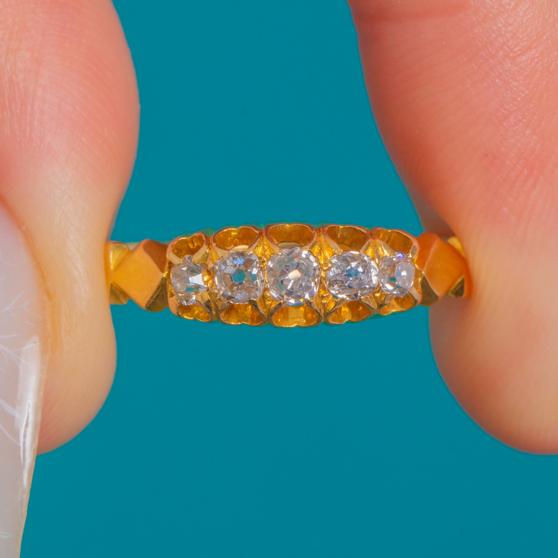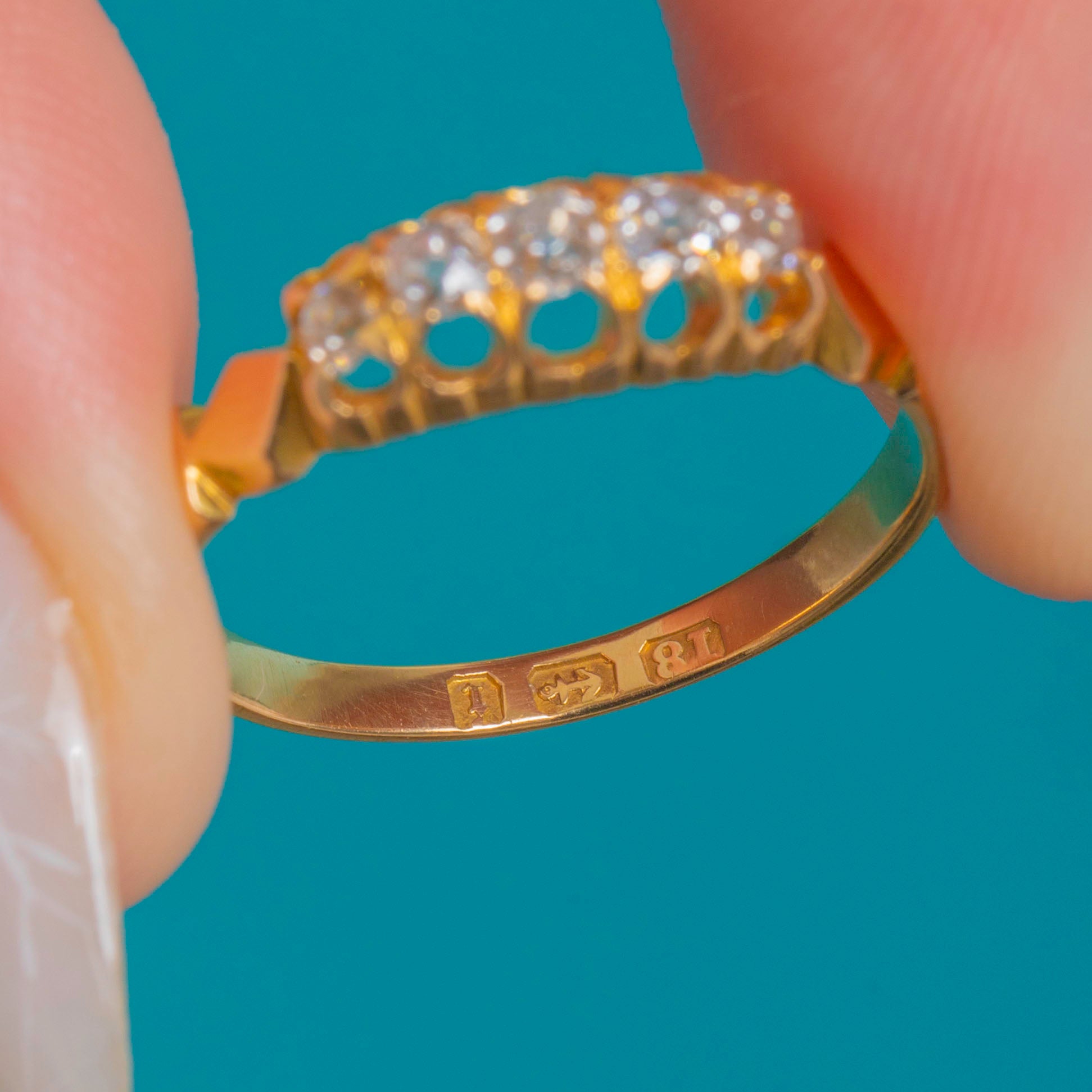 A timeless five-stone ring set with a beautifully graduated line of Old Mine Cut Diamonds in rich 18ct Gold. The low, finger-hugging “boat” head is crafted with scalloped claws and open backs, allowing the old cuts to glow with their distinctive broad flashes and charming open culets.
