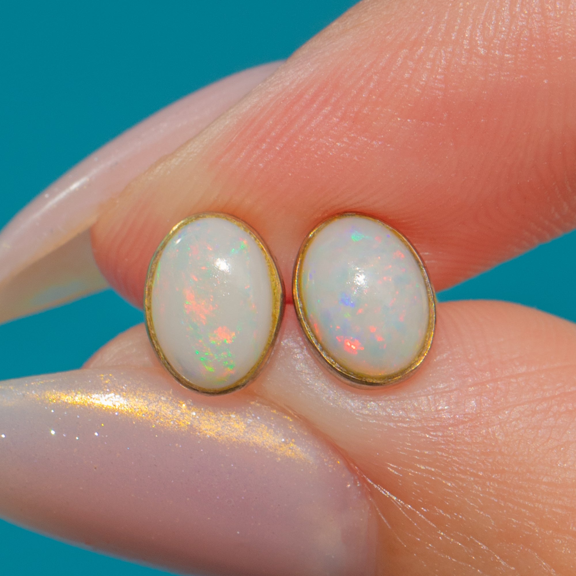 A refined pair of Mid-Century Vintage stud earrings, each set with a vibrant Opal displaying flashes of green, orange, and red. The Opals are oval in shape, measuring 7.5mm x 6mm, with a combined weight of approximately 1.30ct. Their lively play of colour is beautifully complemented by the warmth of 18ct Gold.