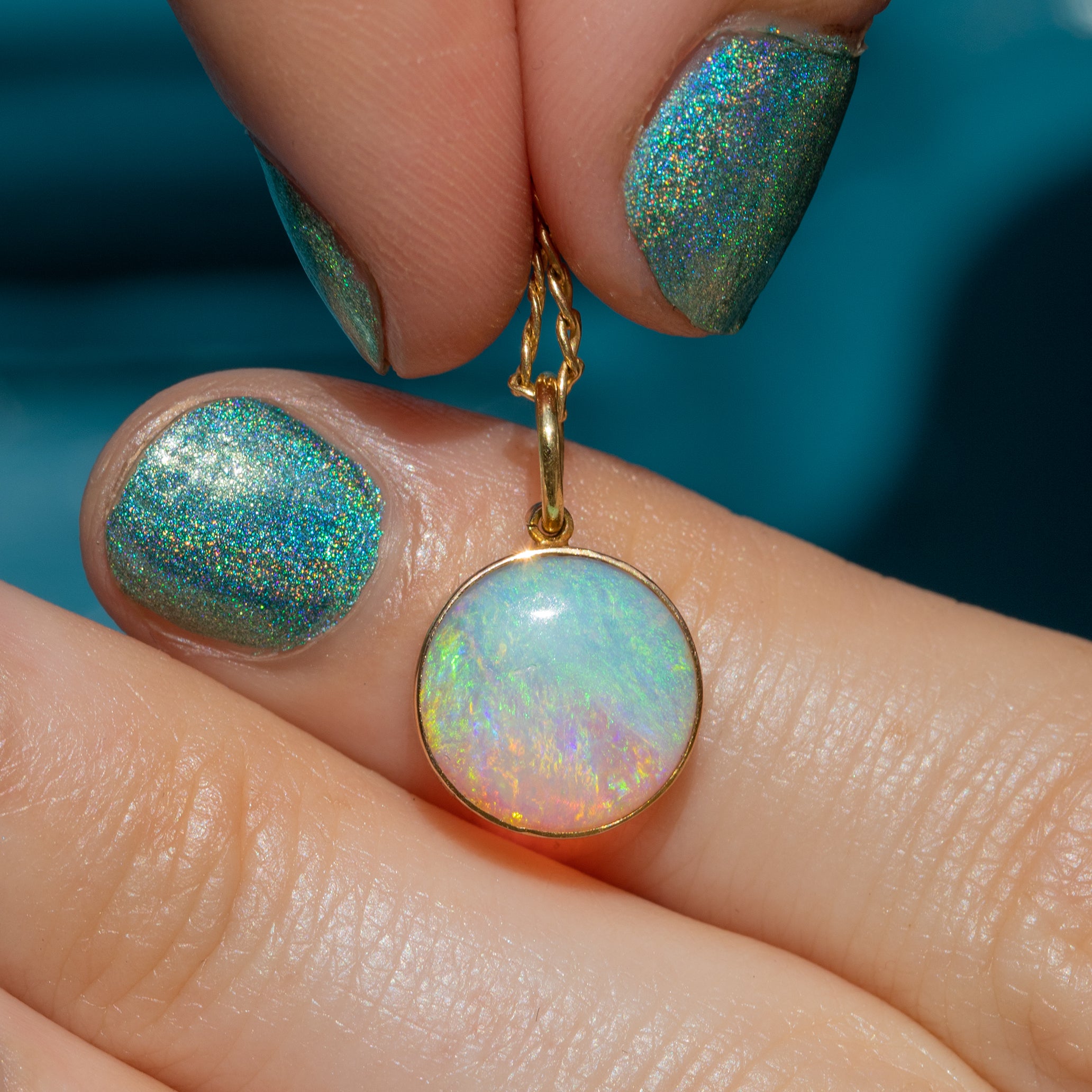 A divine antique 15ct Gold Opal charm! This dainty charm is bursting with colours, iridescent blues and violets are nestled snugly in her 15ct Gold bezel settings.