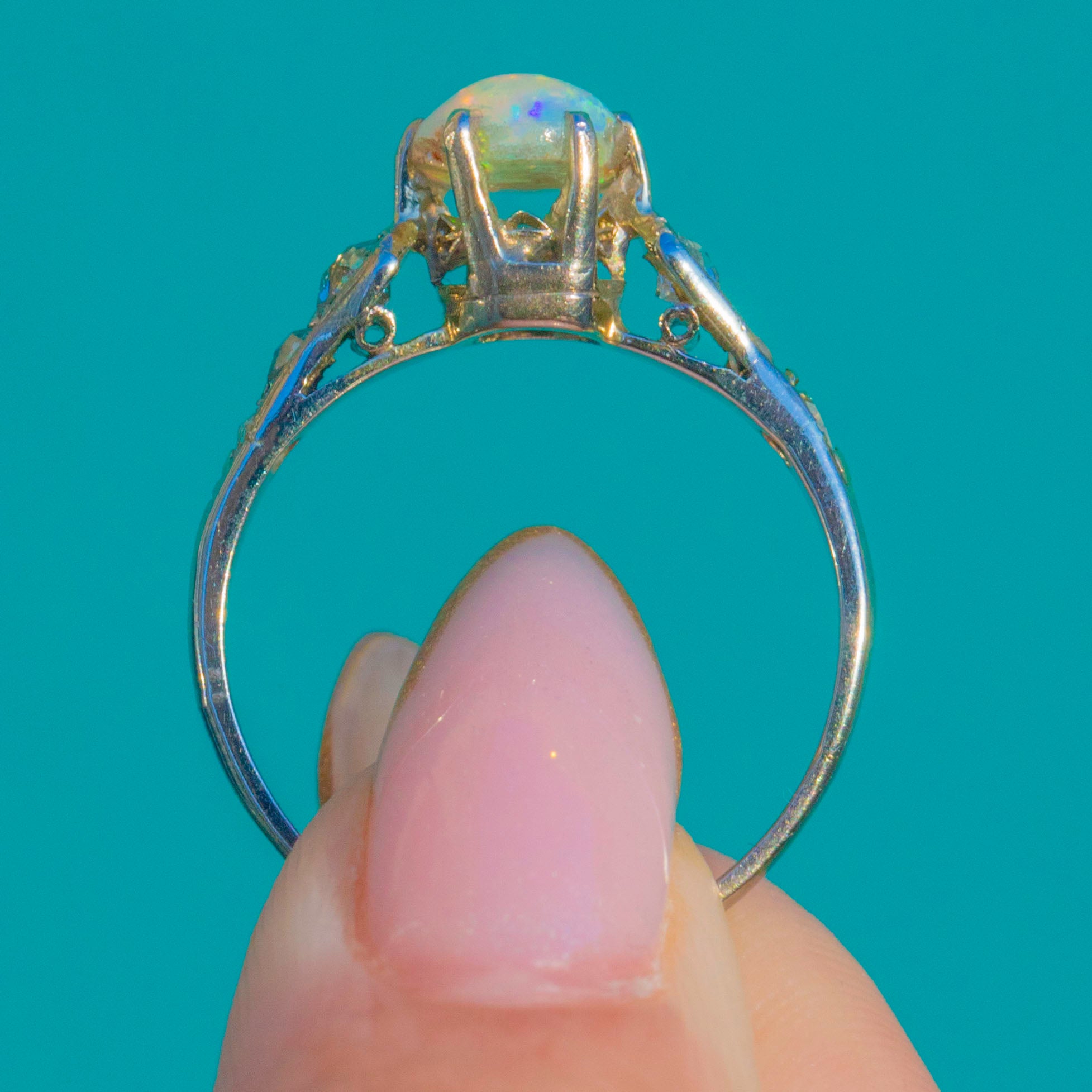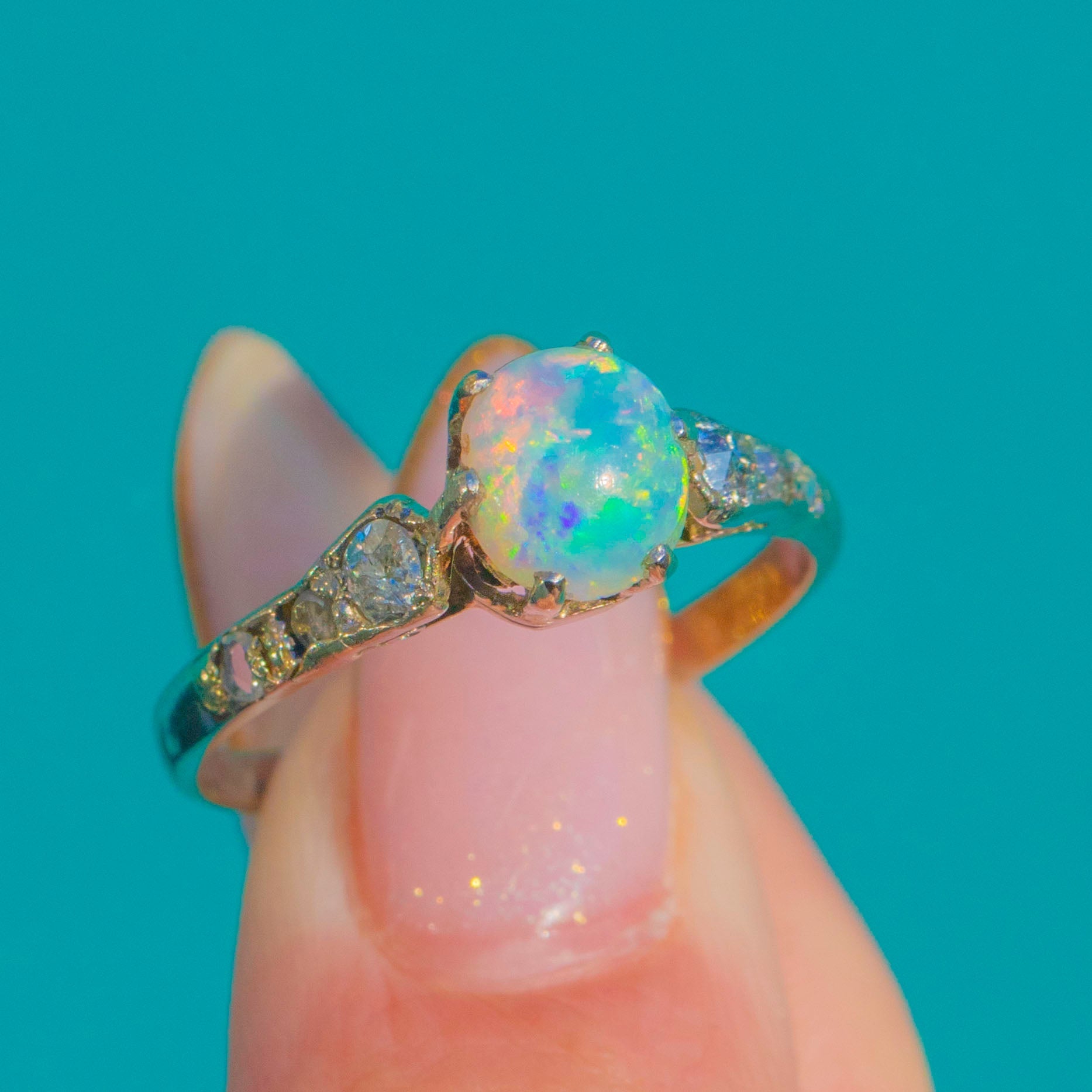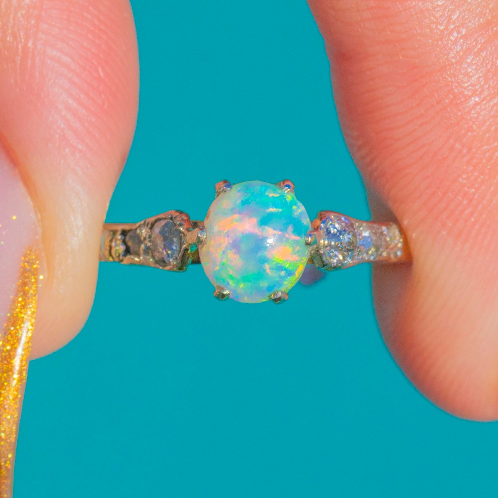 This beautiful antique 18ct White Gold ring features a vibrant Opal at the centre, full of lively rainbow flashes that dance across the surface. On each shoulder sit bright Diamonds that add crisp sparkle and contrast against the glowing 0.50ct Opal.