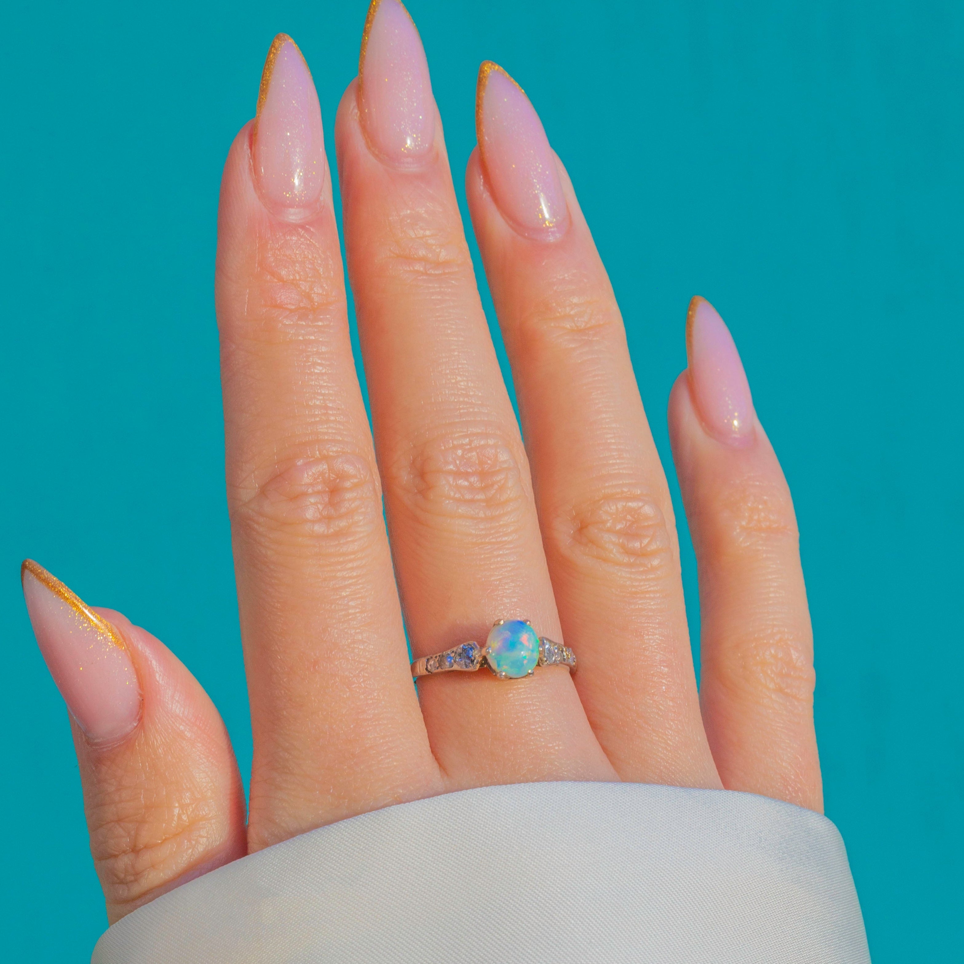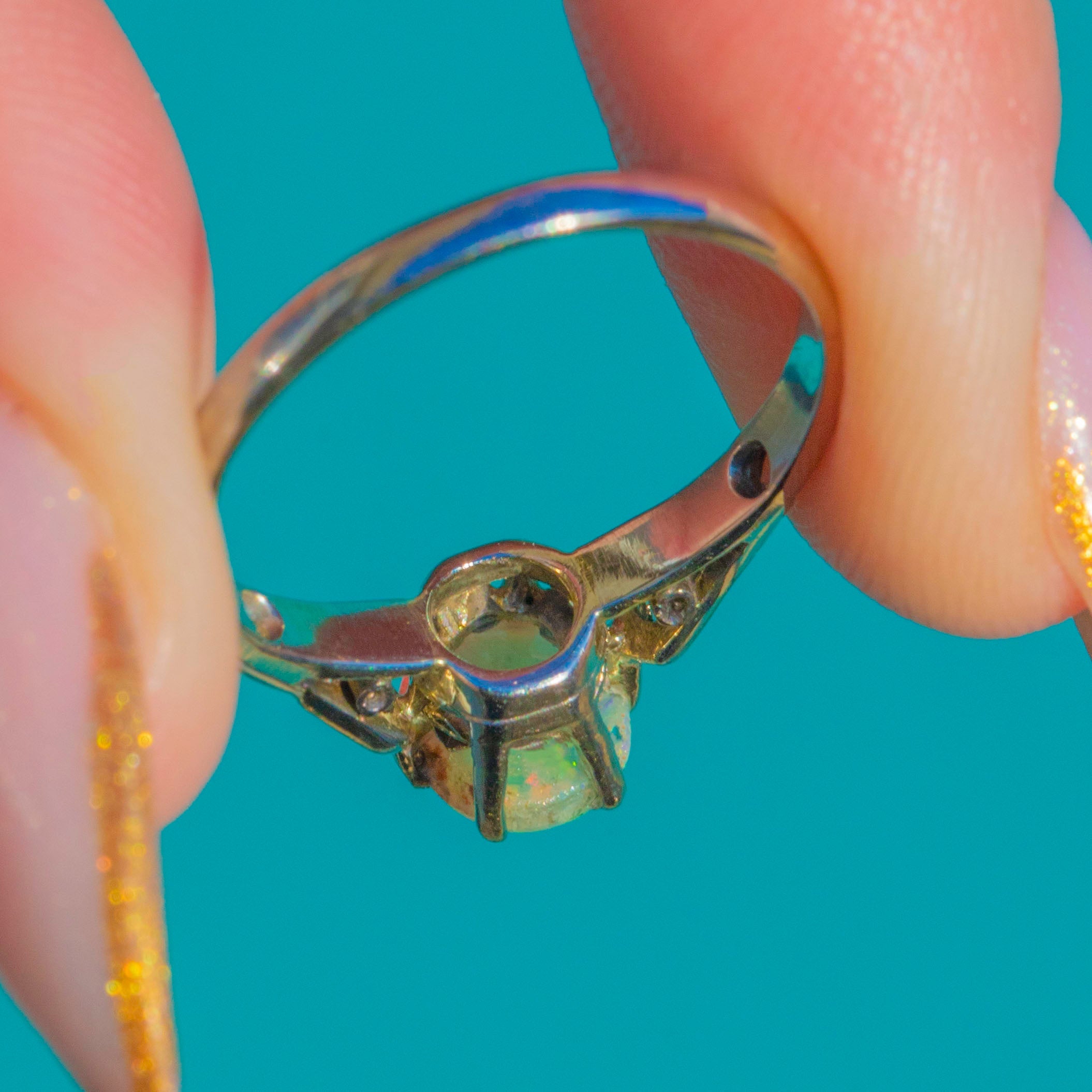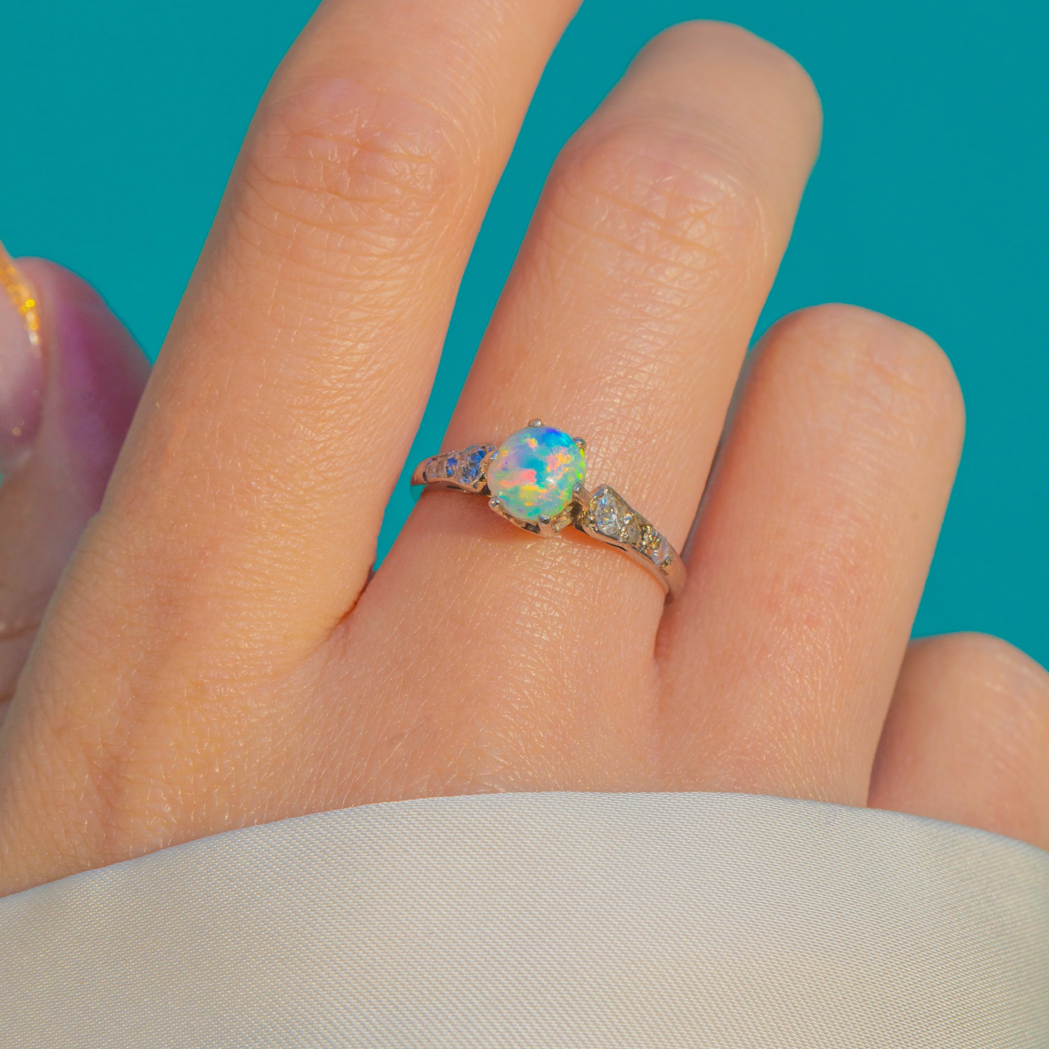 This beautiful antique 18ct White Gold ring features a vibrant Opal at the centre, full of lively rainbow flashes that dance across the surface. On each shoulder sit bright Diamonds that add crisp sparkle and contrast against the glowing 0.50ct Opal.