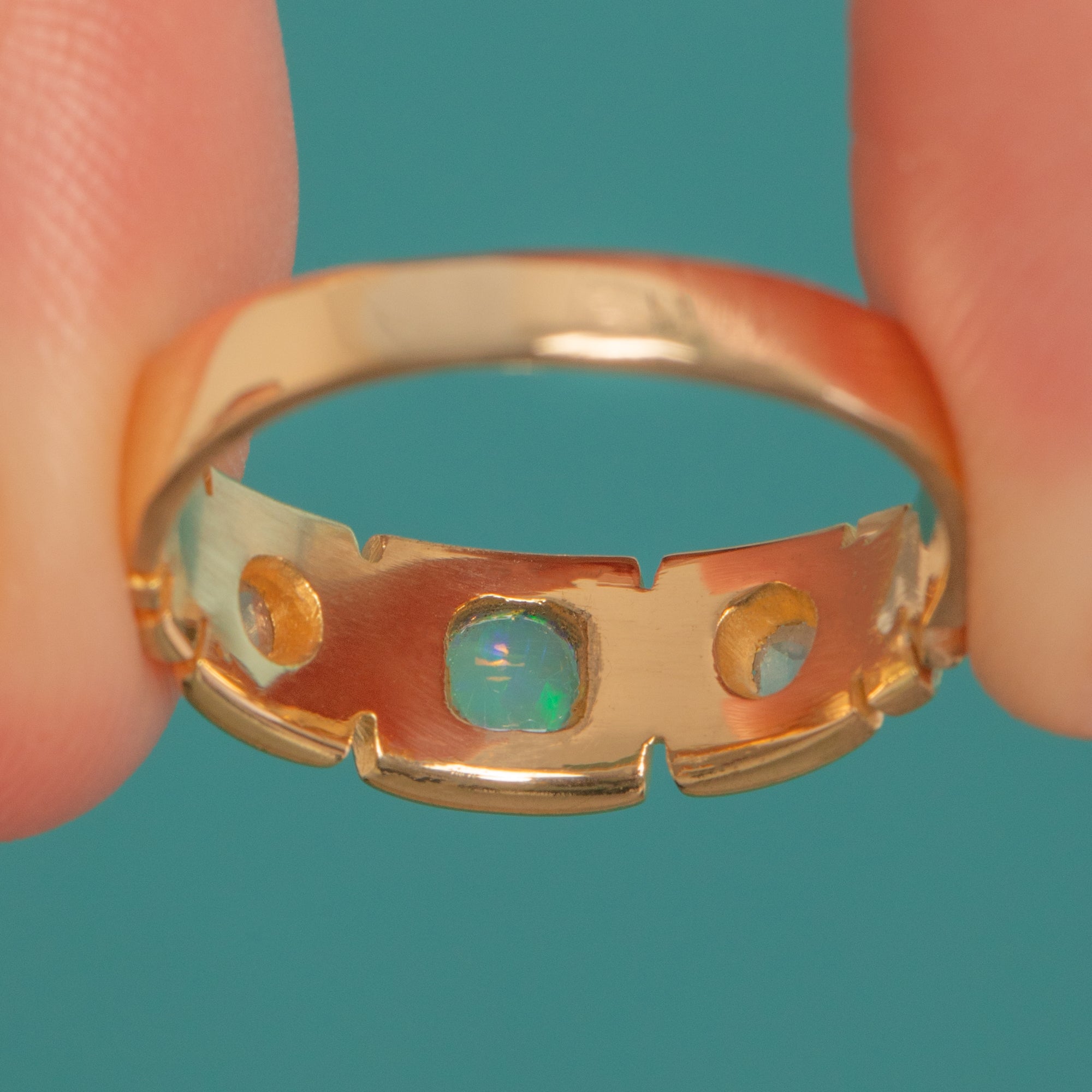 EXCELLENT: The Opal and Diamonds are secure, with crisp star settings that present beautifully. The 18ct Gold band shows light surface wear consistent with age, with strong definition to the engraved details. A well-cared-for antique ring that wears smoothly and shines elegantly.