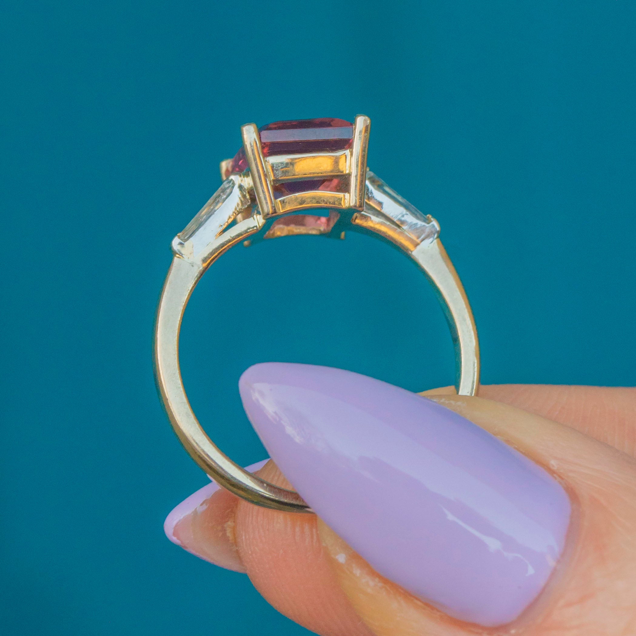 Add a touch of luxury to your collection with this breathtaking 18ct Gold Pink Tourmaline ring! The dusty pink hue of the Tourmaline exudes warmth and sophistication and is flanked by baguette-cut Diamonds, their crisp sparkle providing a dazzling contrast and catching the light in the most gorgeous way.