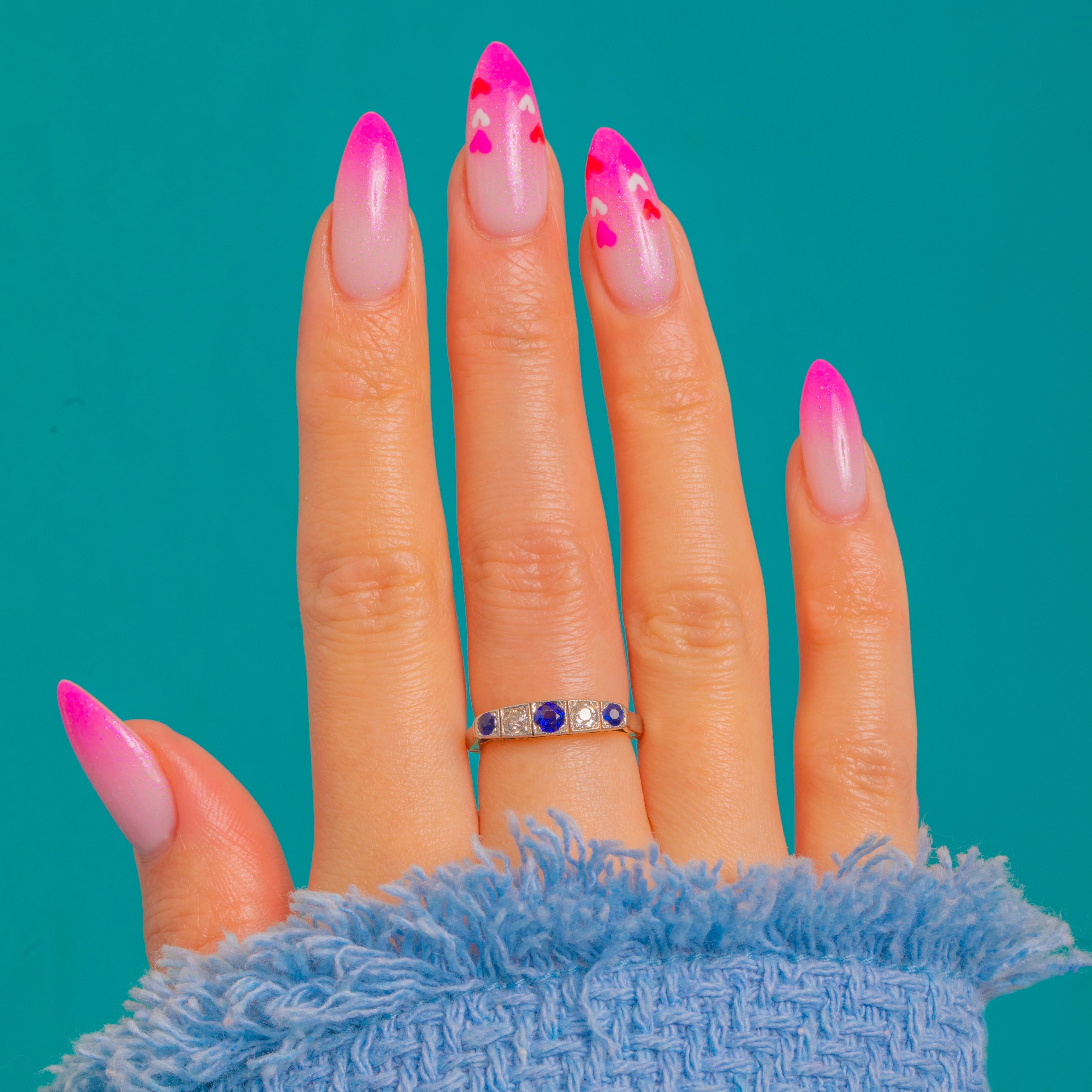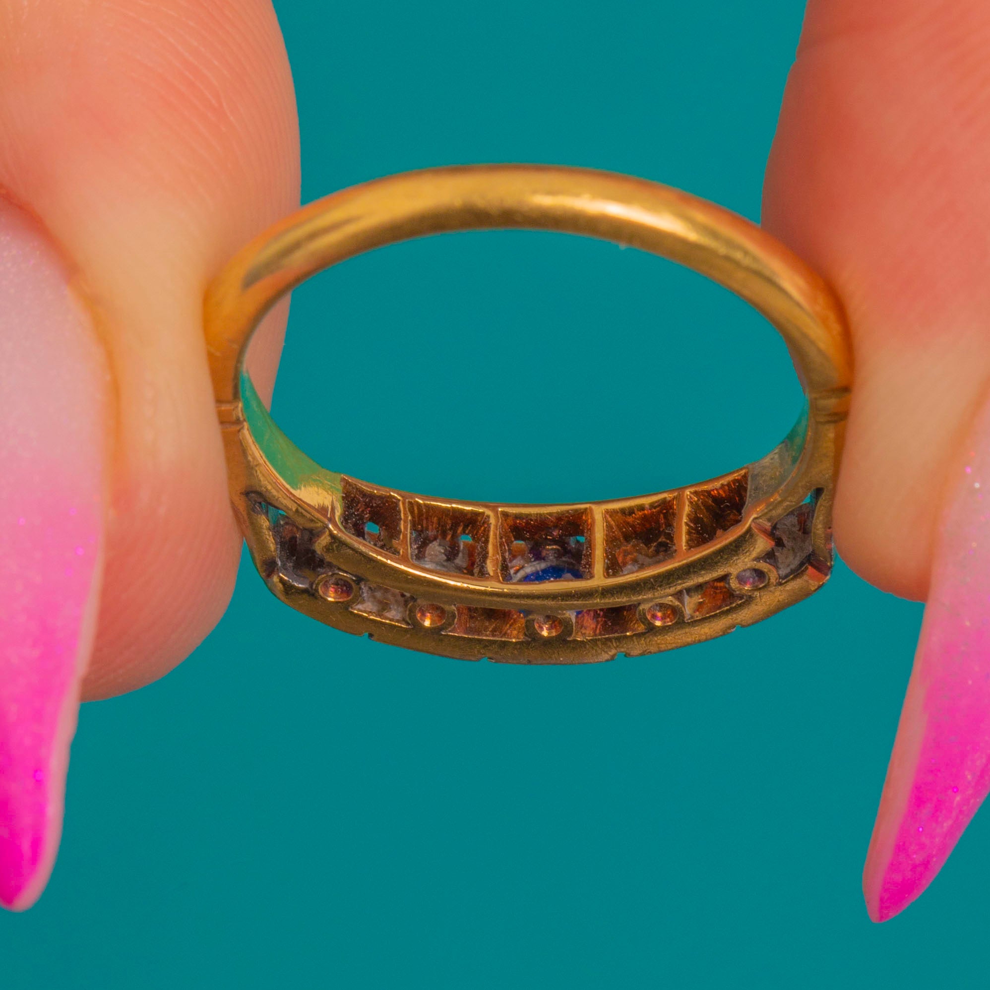 A classic Art Deco five-stone ring that balances elegance with architectural precision. Three vivid deep-blue Sapphires are arranged in a refined bar, accented by two scintillating Old Mine Cut Diamonds. Each gemstone is framed in neat, square milgrained settings with a pierced under-gallery, creating a crisp, linear silhouette that sits low on the finger for effortless wear.