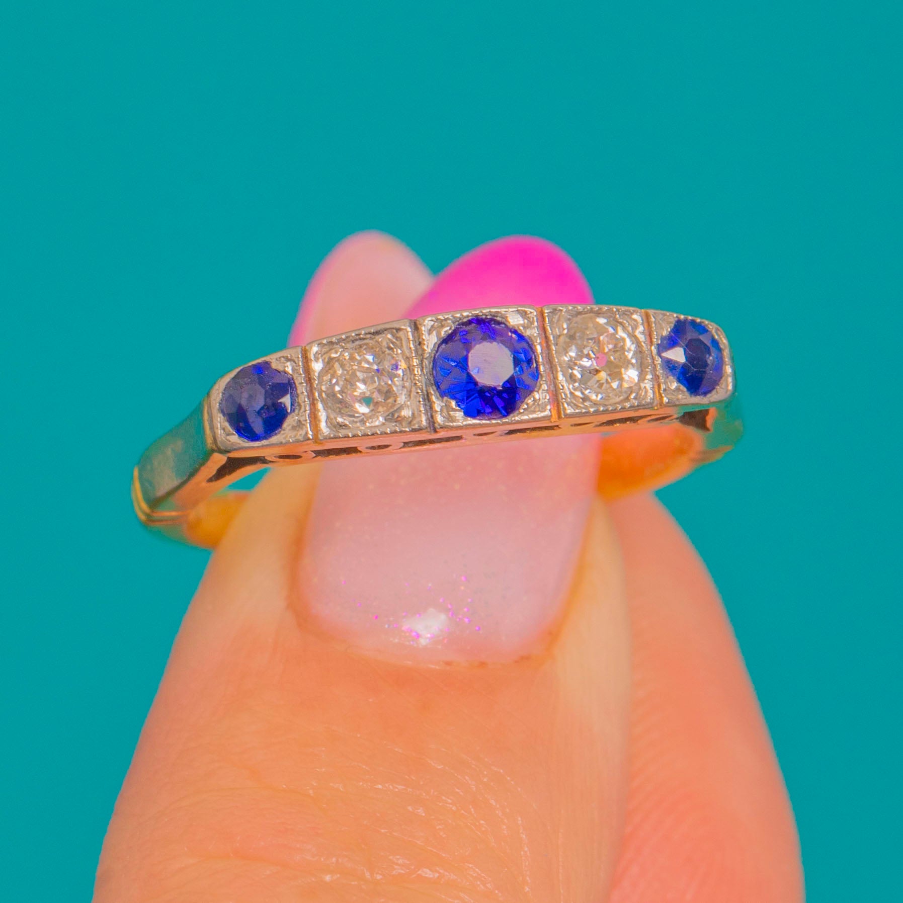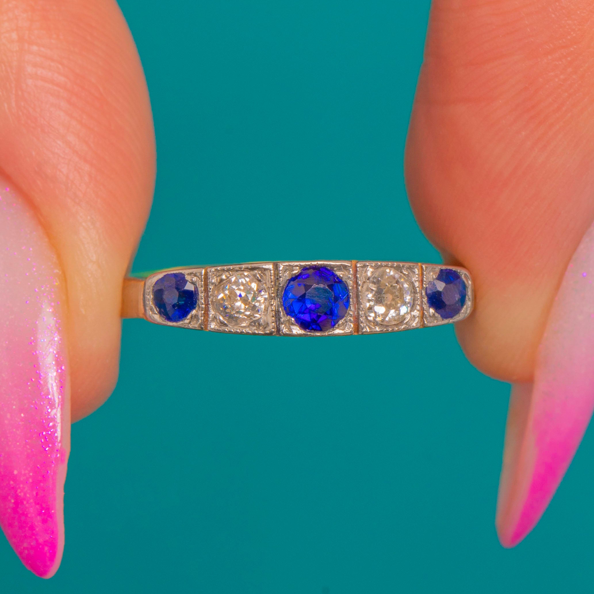 18ct Gold & Platinum Art Deco Sapphire Diamond Five Stone Ring