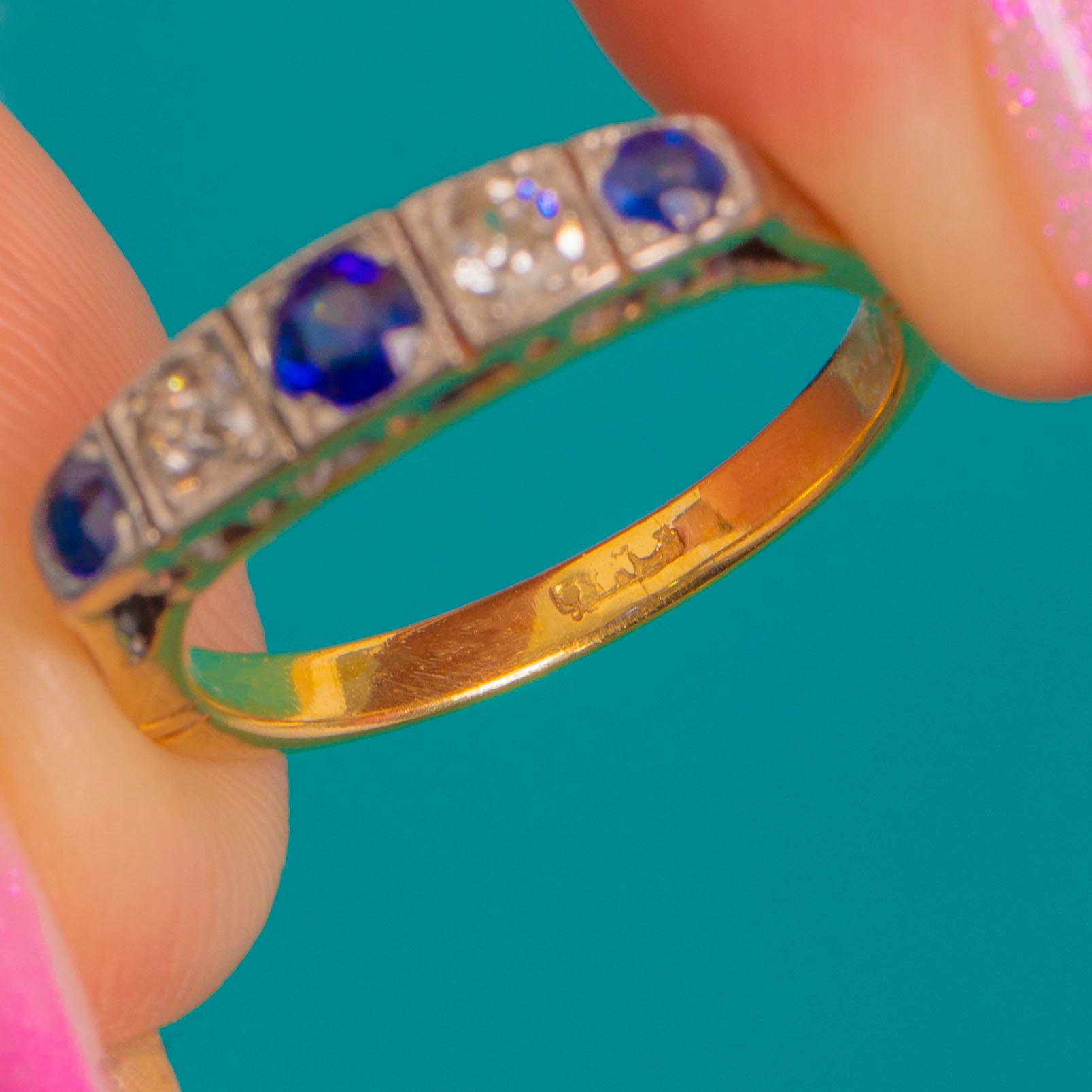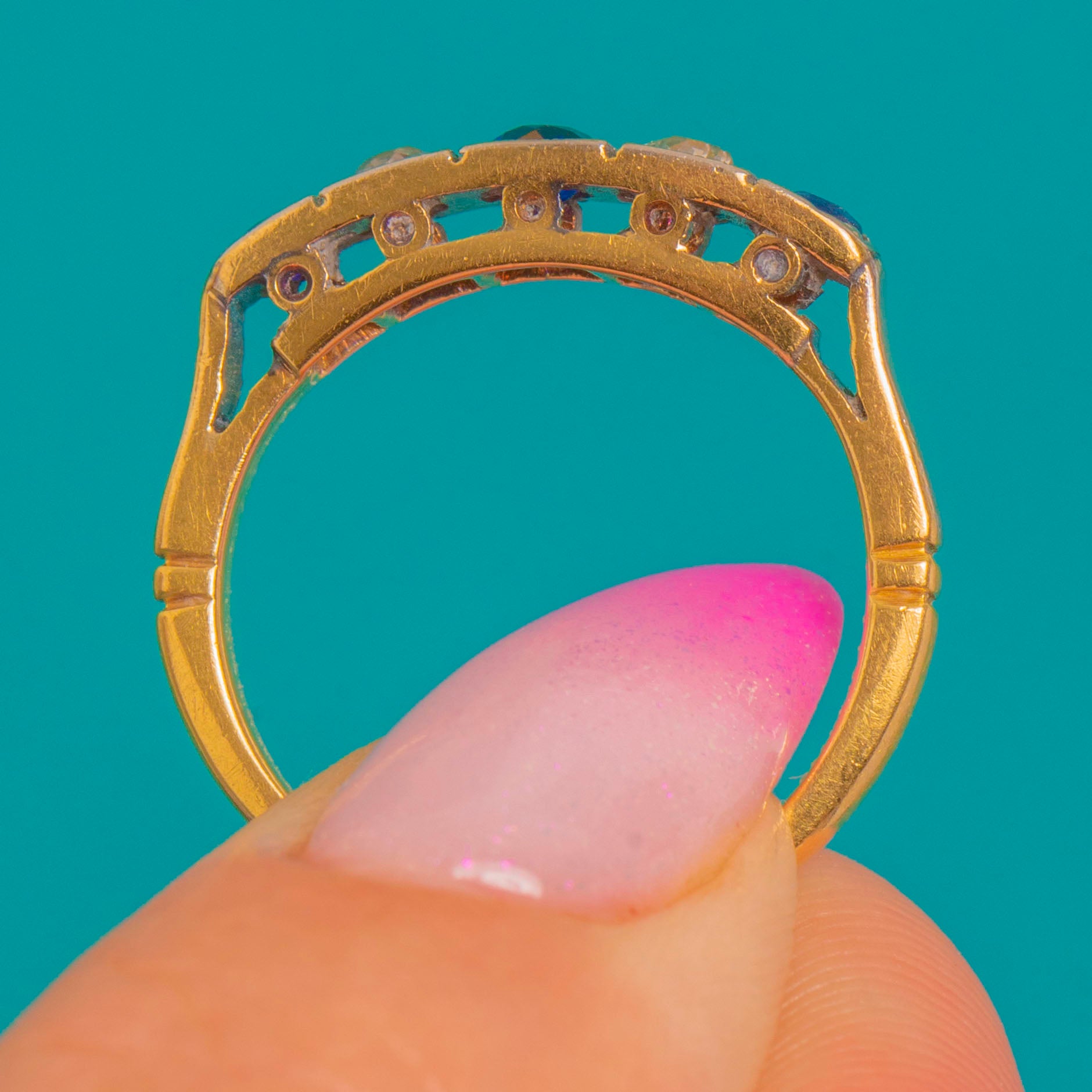 The Platinum-topped setting contrasts beautifully with the warm 18ct Gold shank, highlighting the cool fire of the Diamonds and the inky richness of the Sapphires. Stamped 18ct, this two-tone look and meticulous hand-finishing make it a timeless jewel with unmistakable early 20th-century charm.