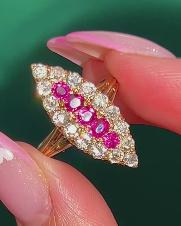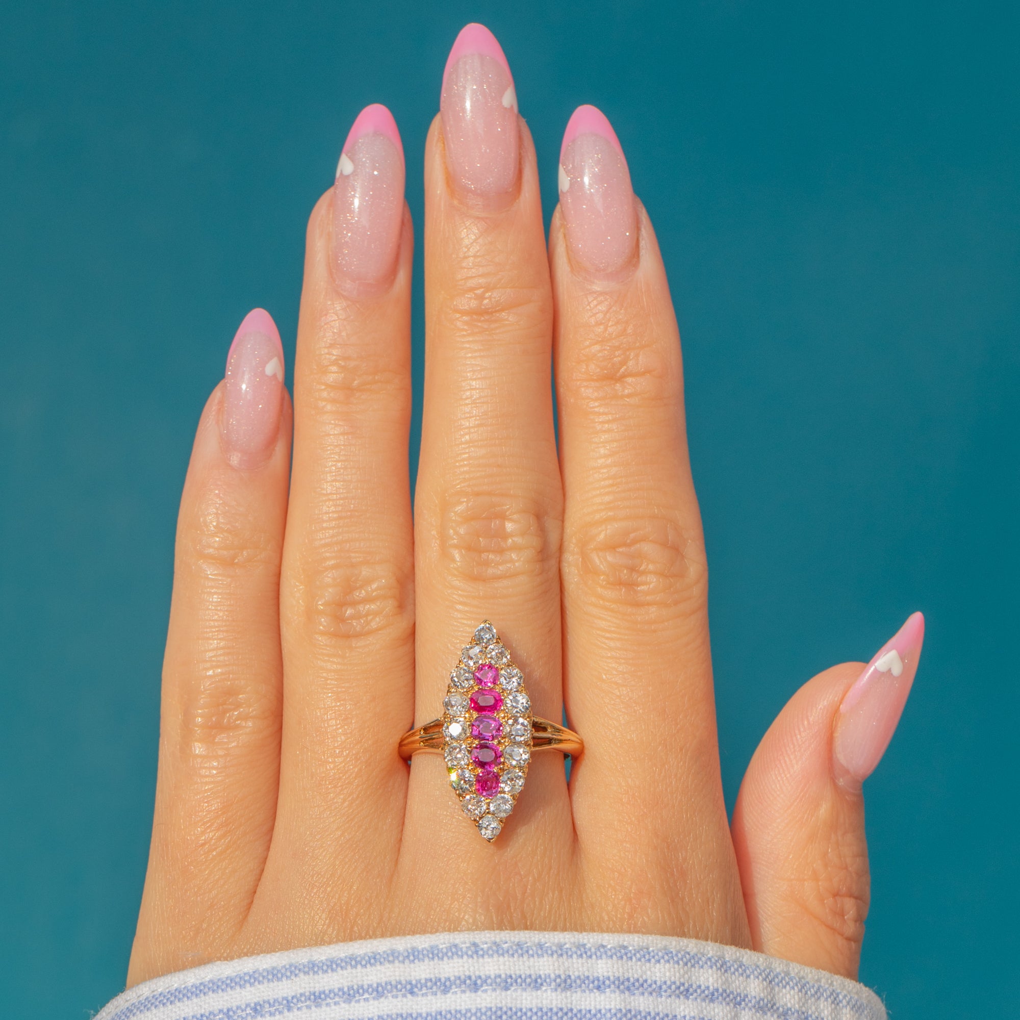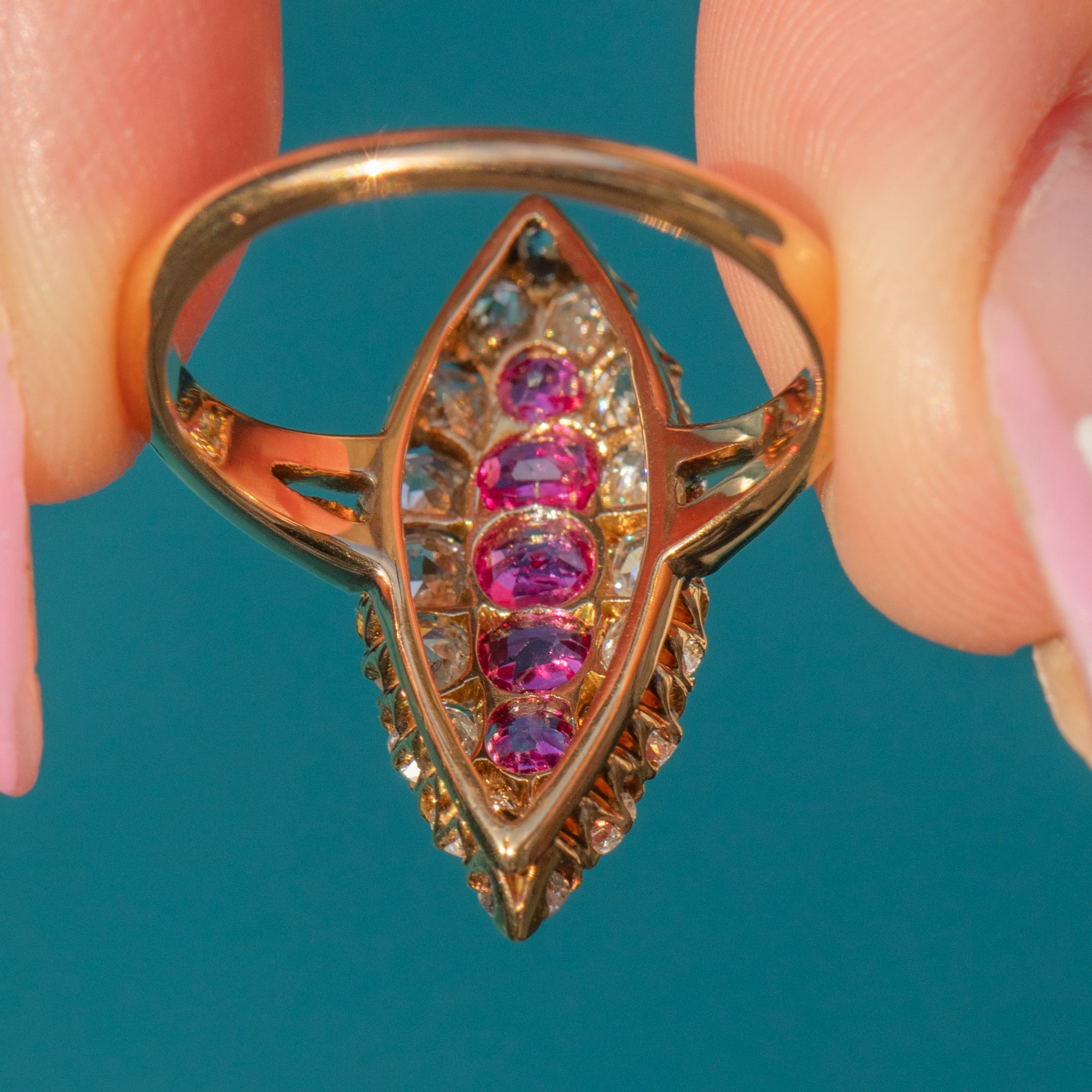 This magnificent Victorian navette ring, hallmarked Chester 1893, is crafted in rich 18ct Gold and set with a striking arrangement of Rubies and Old Mine Cut Diamonds. The vivid pink-red Rubies, totalling approximately 0.50cts, contrast beautifully against the 0.75cts of twinkling antique Diamonds, arranged in a classic elongated cluster formation.