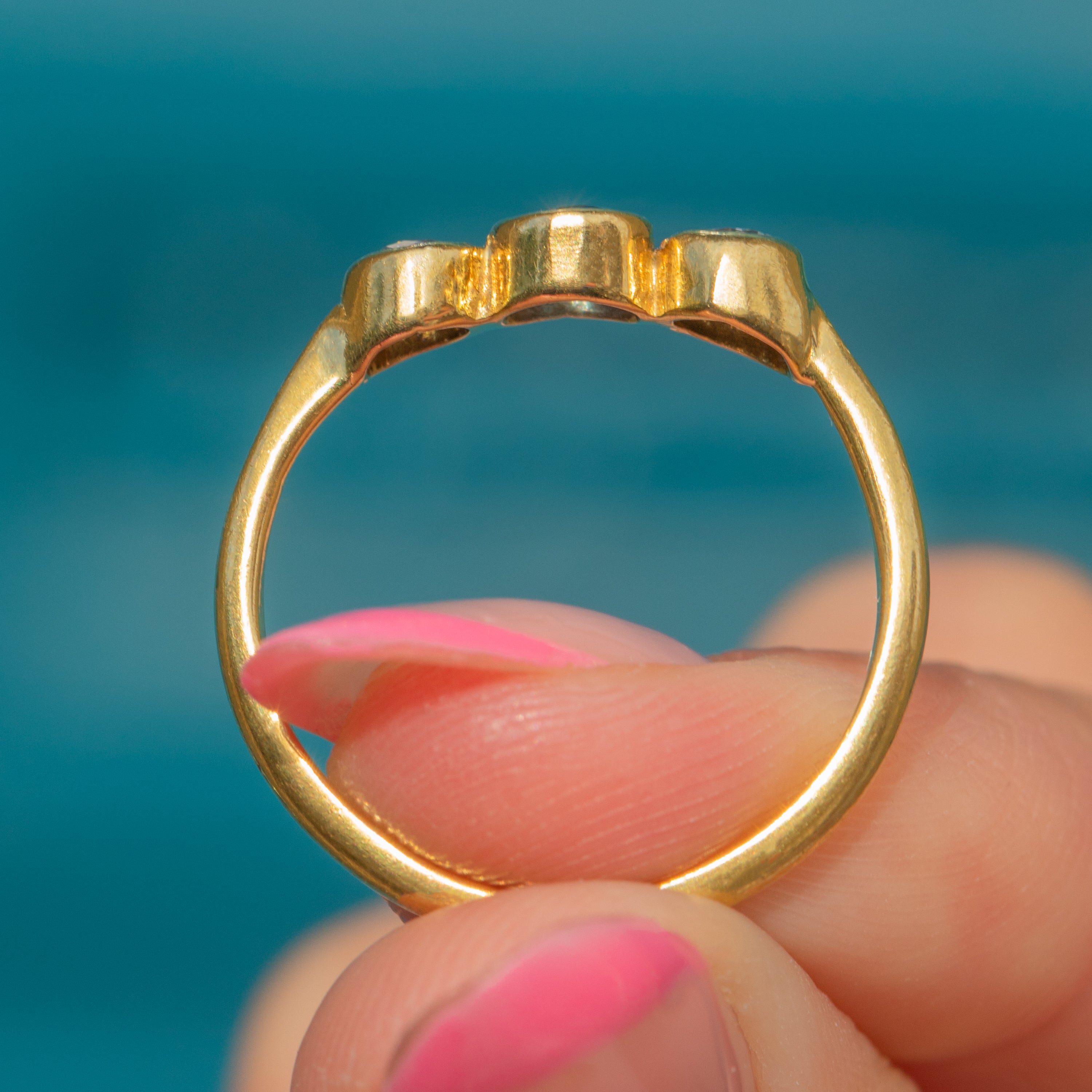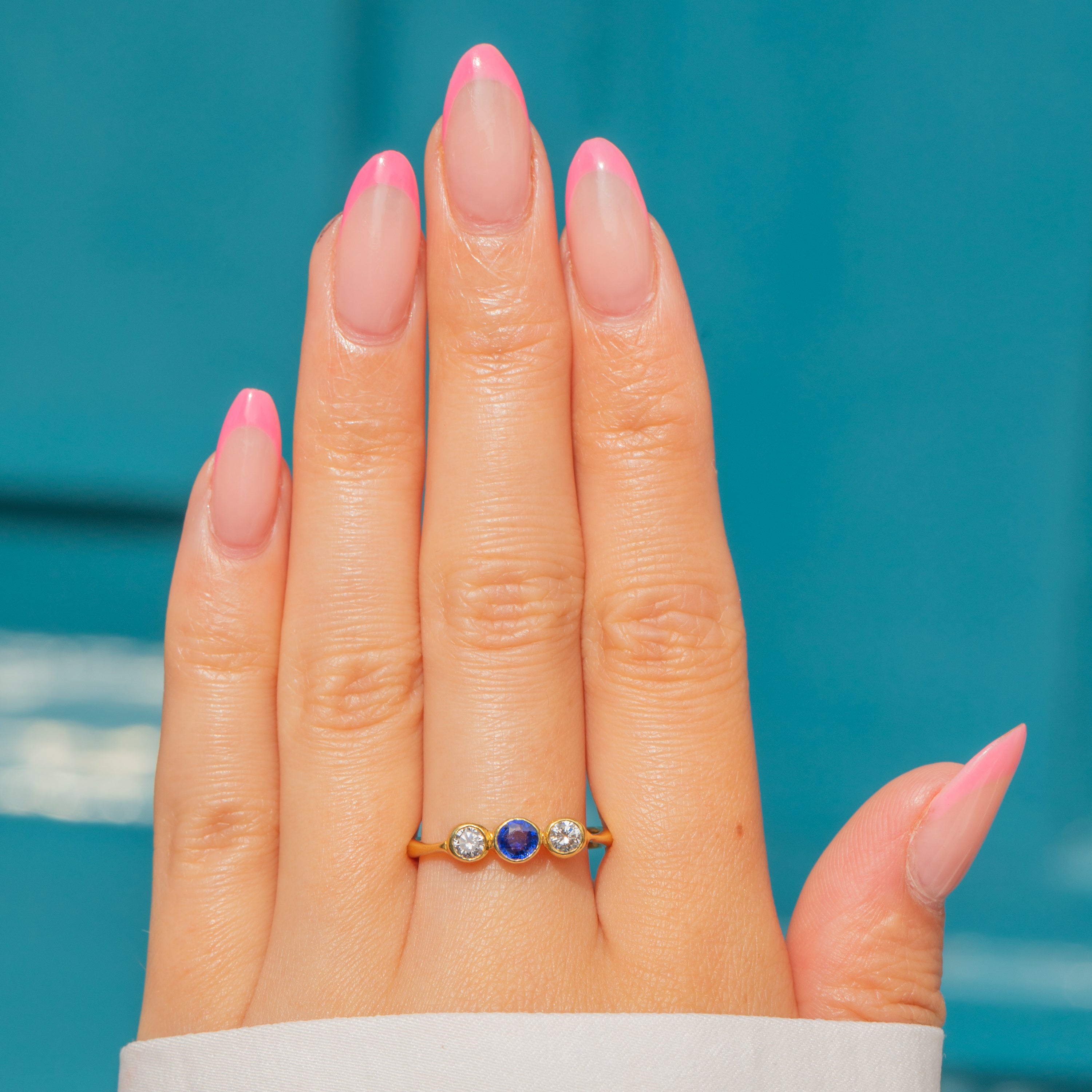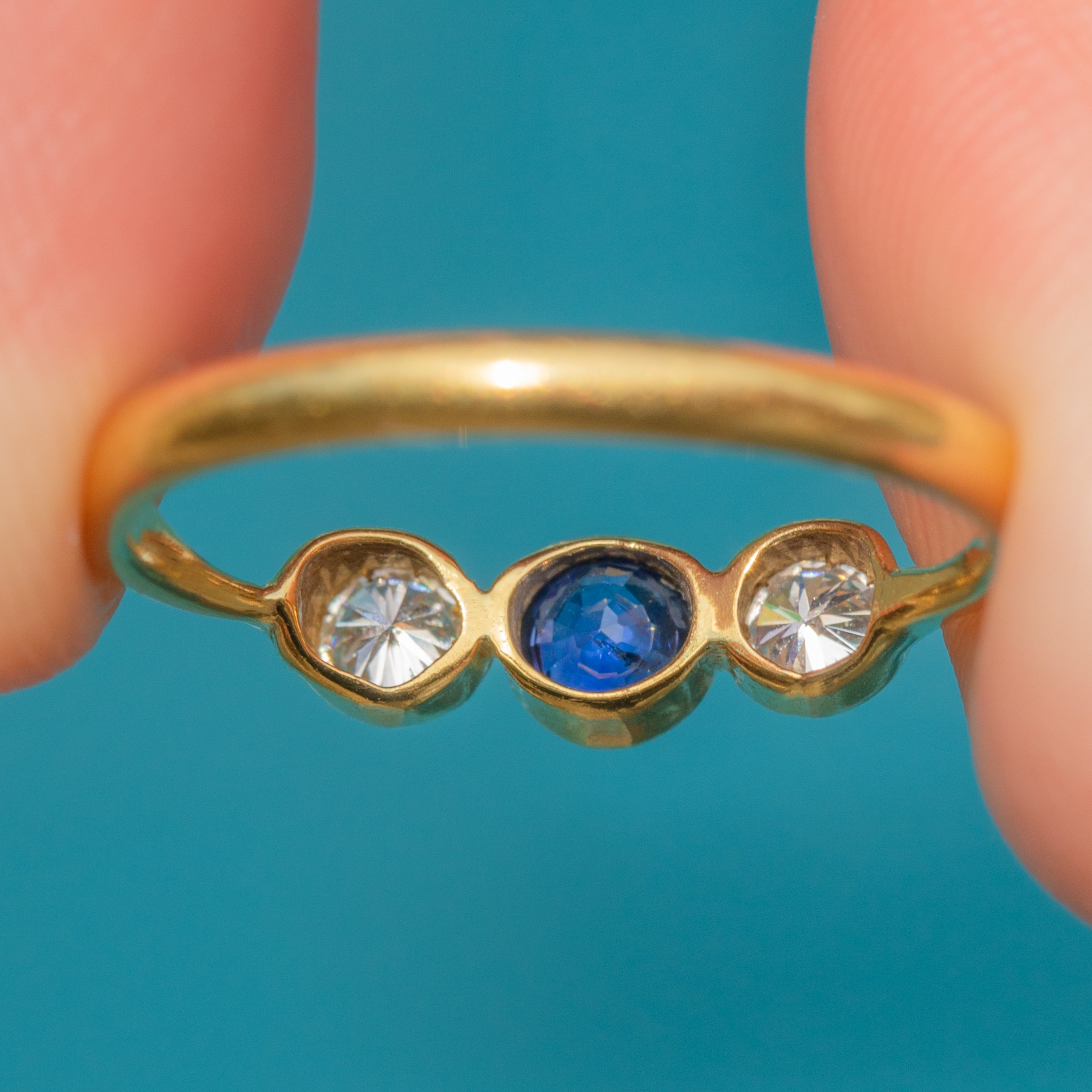 This 18ct Gold Sapphire Diamond trilogy ring is a stunning vintage piece. Boasting a mesmerising central Sapphire with a deep midnight blue hue flanked by two scintillating Diamonds, this vintage ring looks as though she has been plucked from a winter's night sky!
