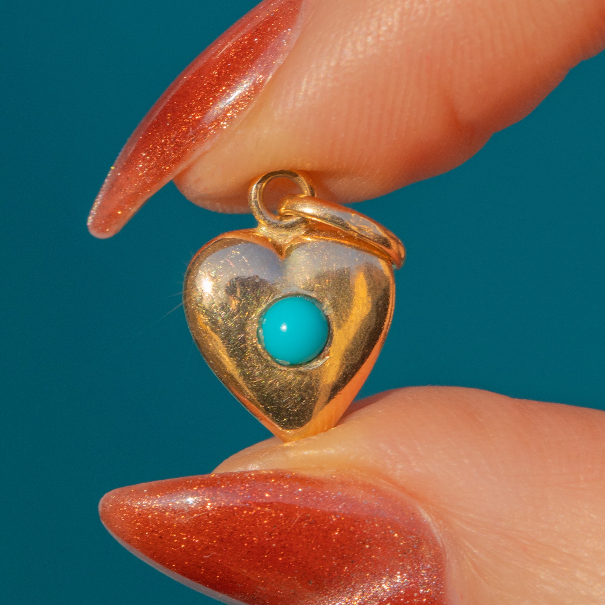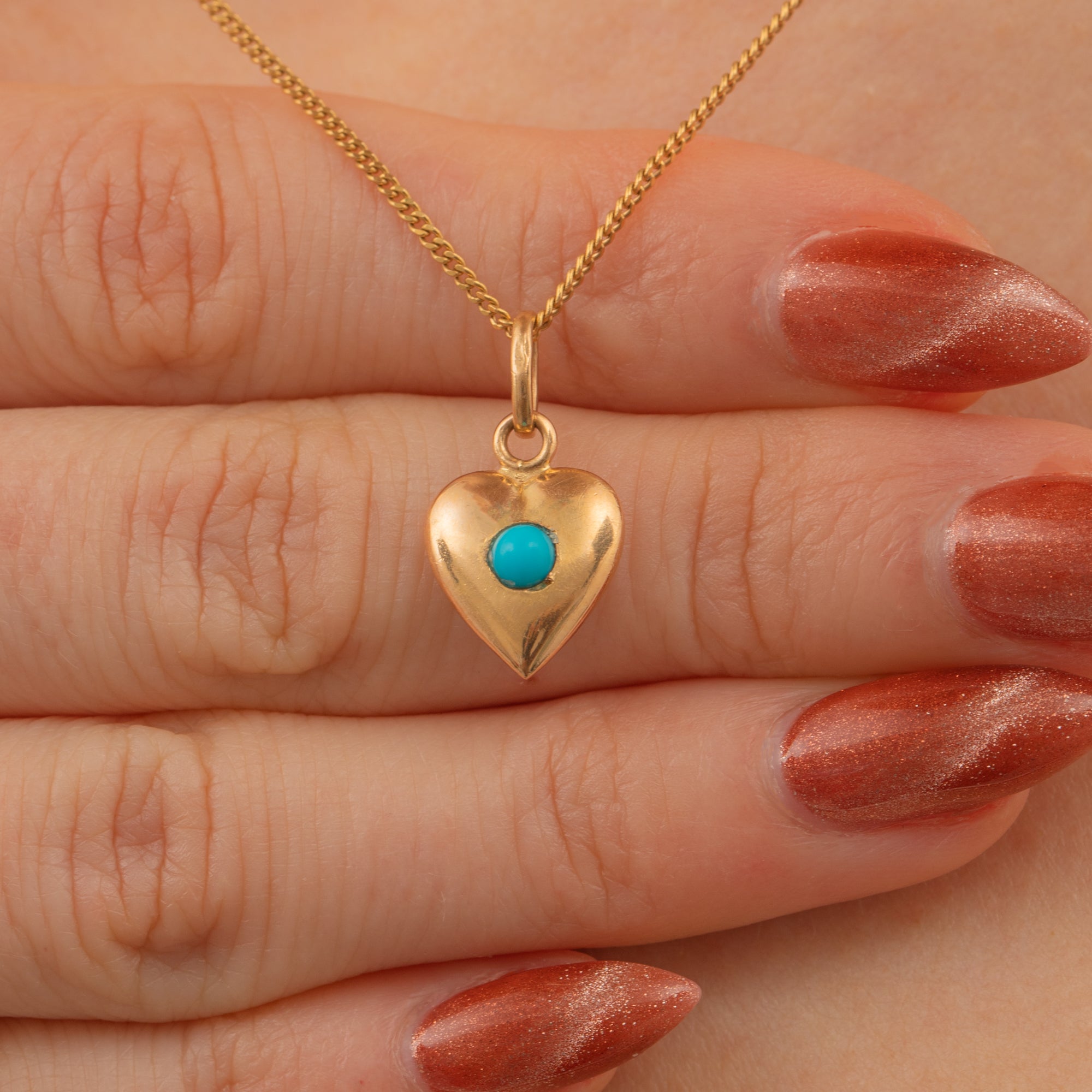 The cute puffy heart shape of this petite heart charm is crafted from luxurious 18ct Gold with a lovely bright sheen. Weighing in at just over a gram, this Victorian Turquoise charm is lightweight and easy to wear, making for the perfect addition to your antique neck stack.