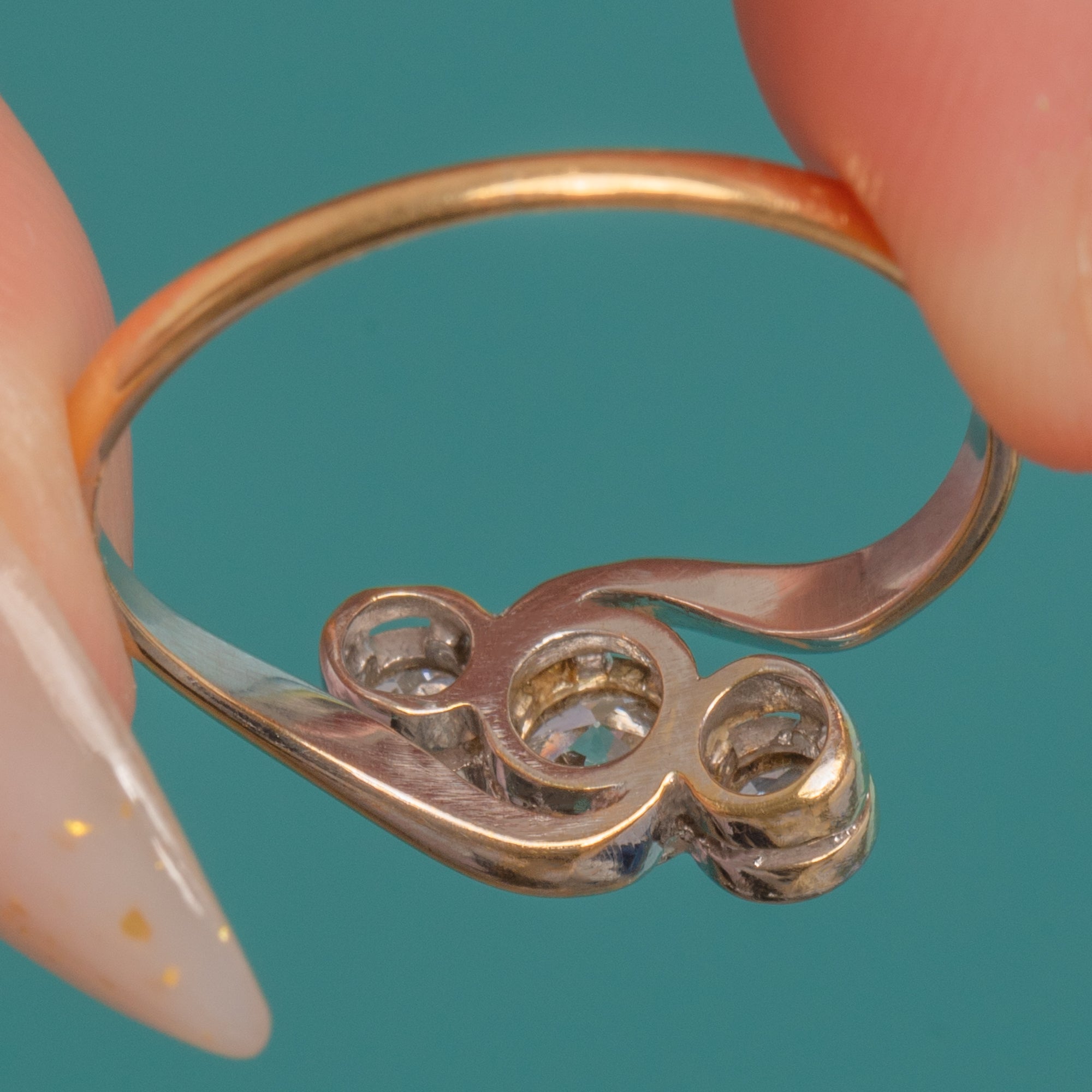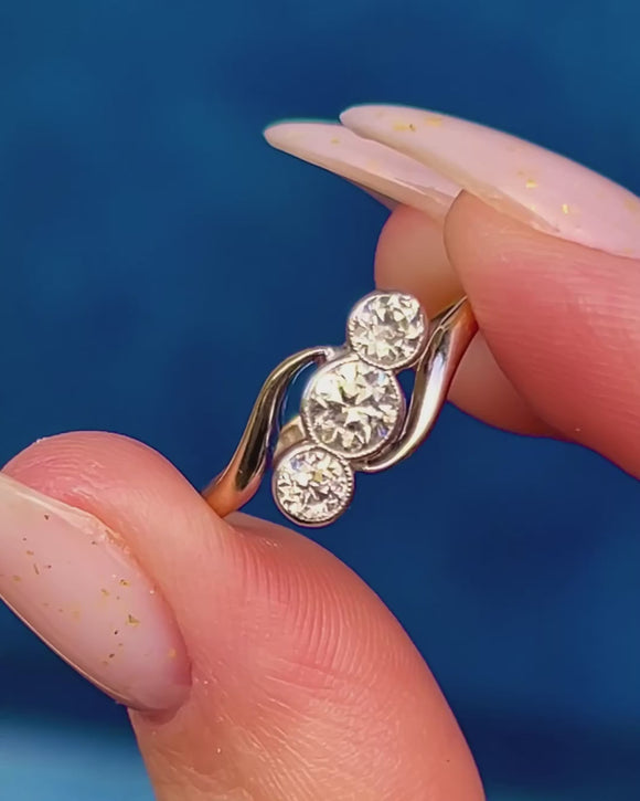 A refined Art Deco Diamond trilogy crossover ring, crafted in two-tone 18ct Gold with Platinum settings. Three bright Diamonds glide in a gentle S-curve across the finger, each secured in fine milgrained rubover collets with open backs and a beautifully pierced under-gallery. With a low, graceful profile and flowing crossover shoulders, it’s an elegant study in balance and light, offering approximately 0.45cts of scintillation.