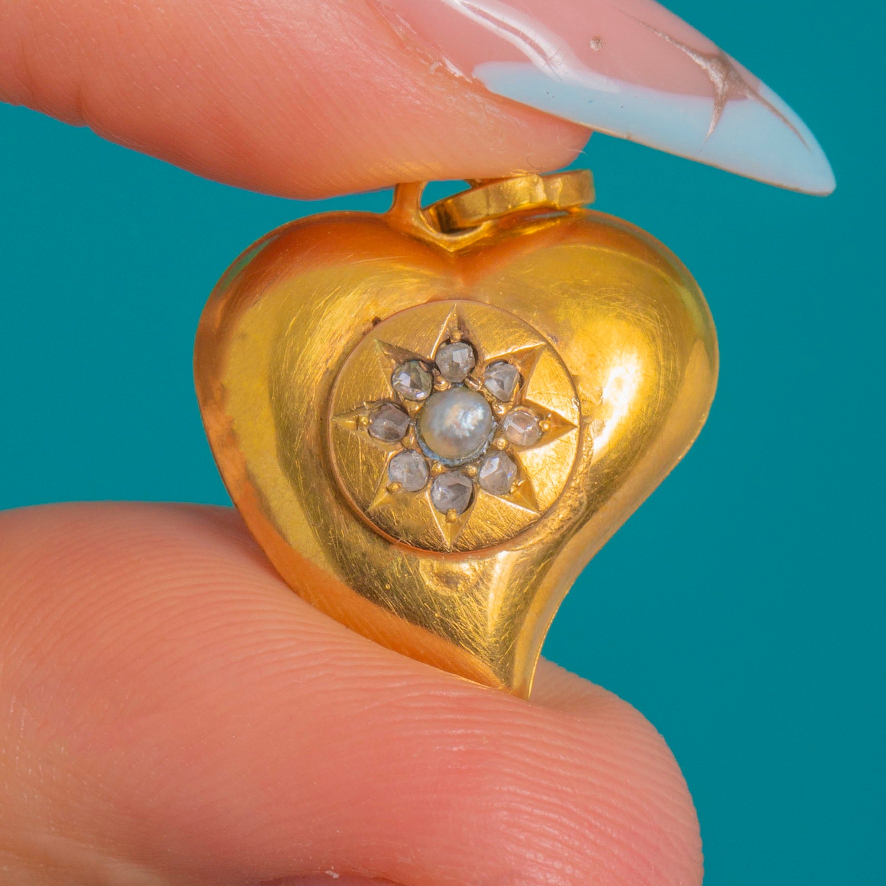 VERY GOOD-EXCELLENT: The Pearl and rose-cut Diamonds are securely set with bright, lively appearance and no obvious chips or losses. The Gold heart shows only light surface wear and tiny shallow dings commensurate with age, with a lovely antique patina; the bale and fittings are secure. No visible repairs or alterations.
