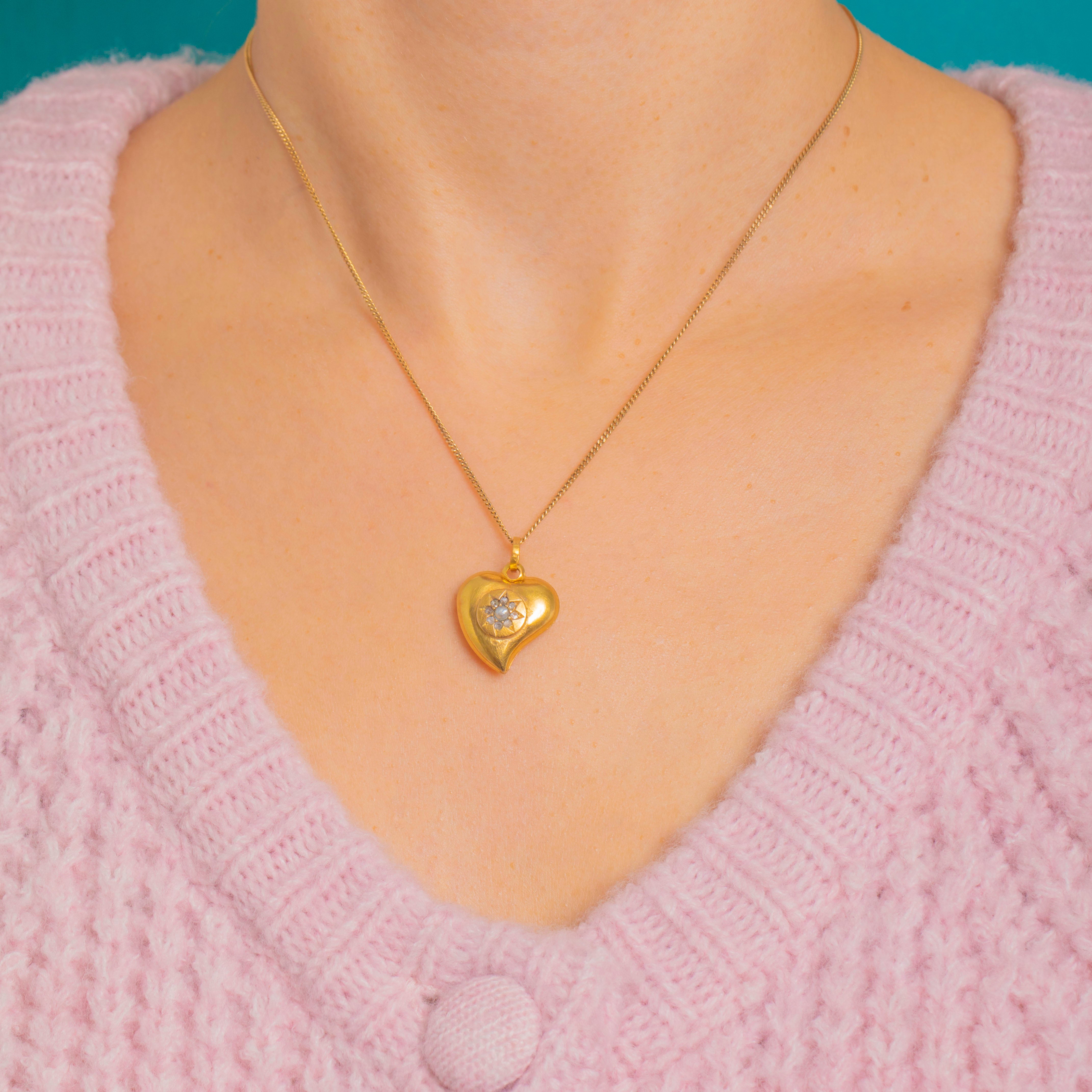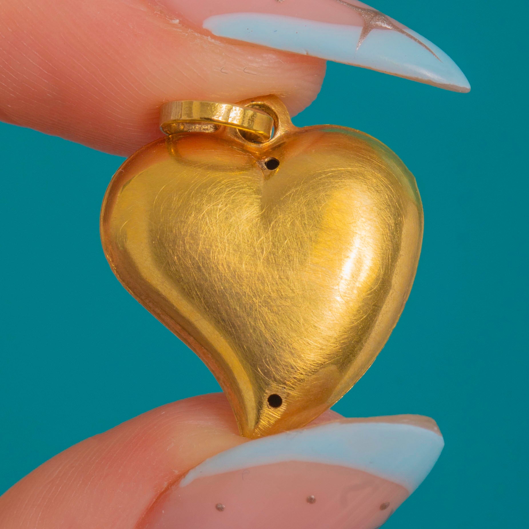 A romantic late Victorian witches heart pendant crafted in glowing 18ct Gold, its softly domed “puffed” profile lending beautiful dimension and charm. Suspended from a ridged bale, this dainty treasure sits delicately on the neck with that coveted antique bloom and gentle patina.