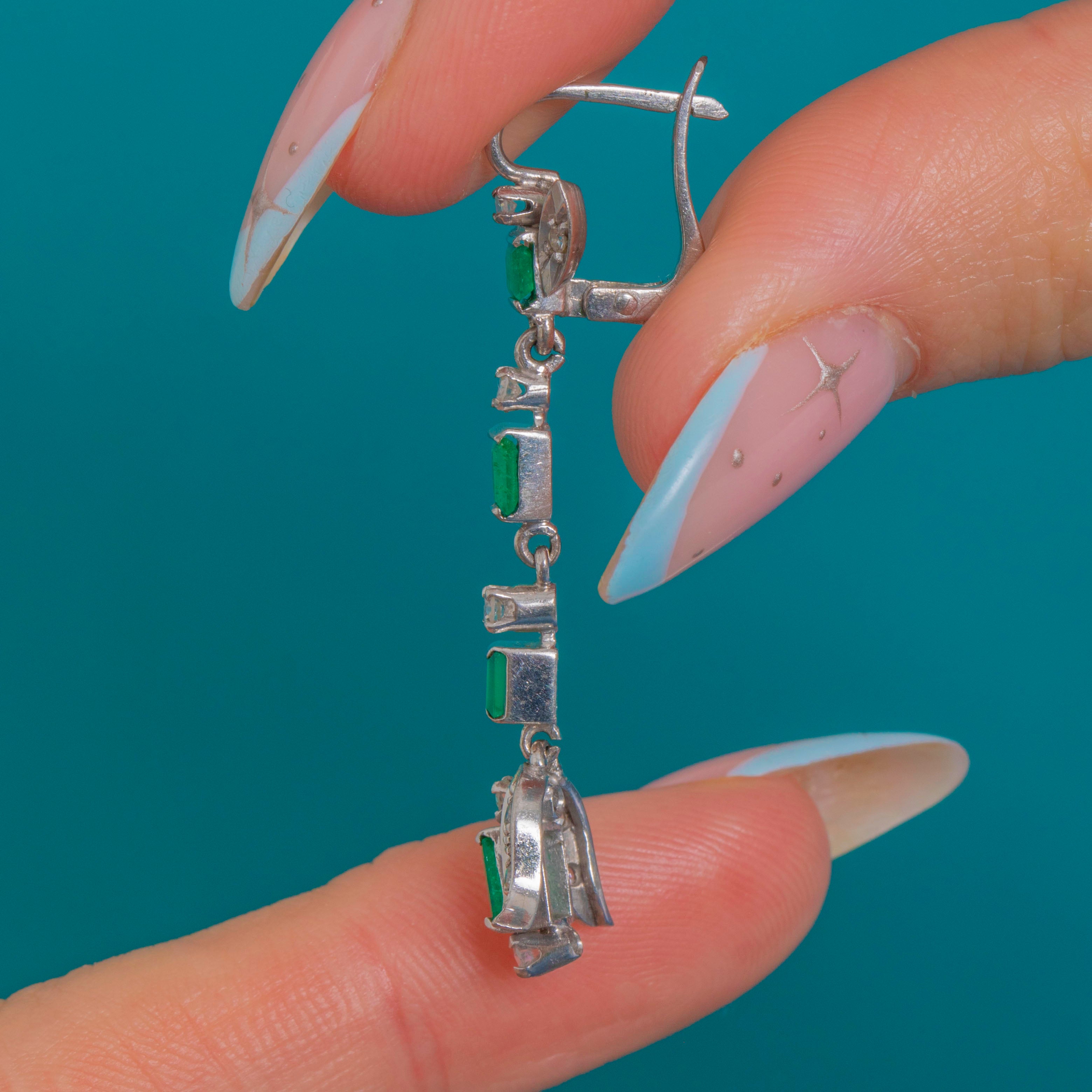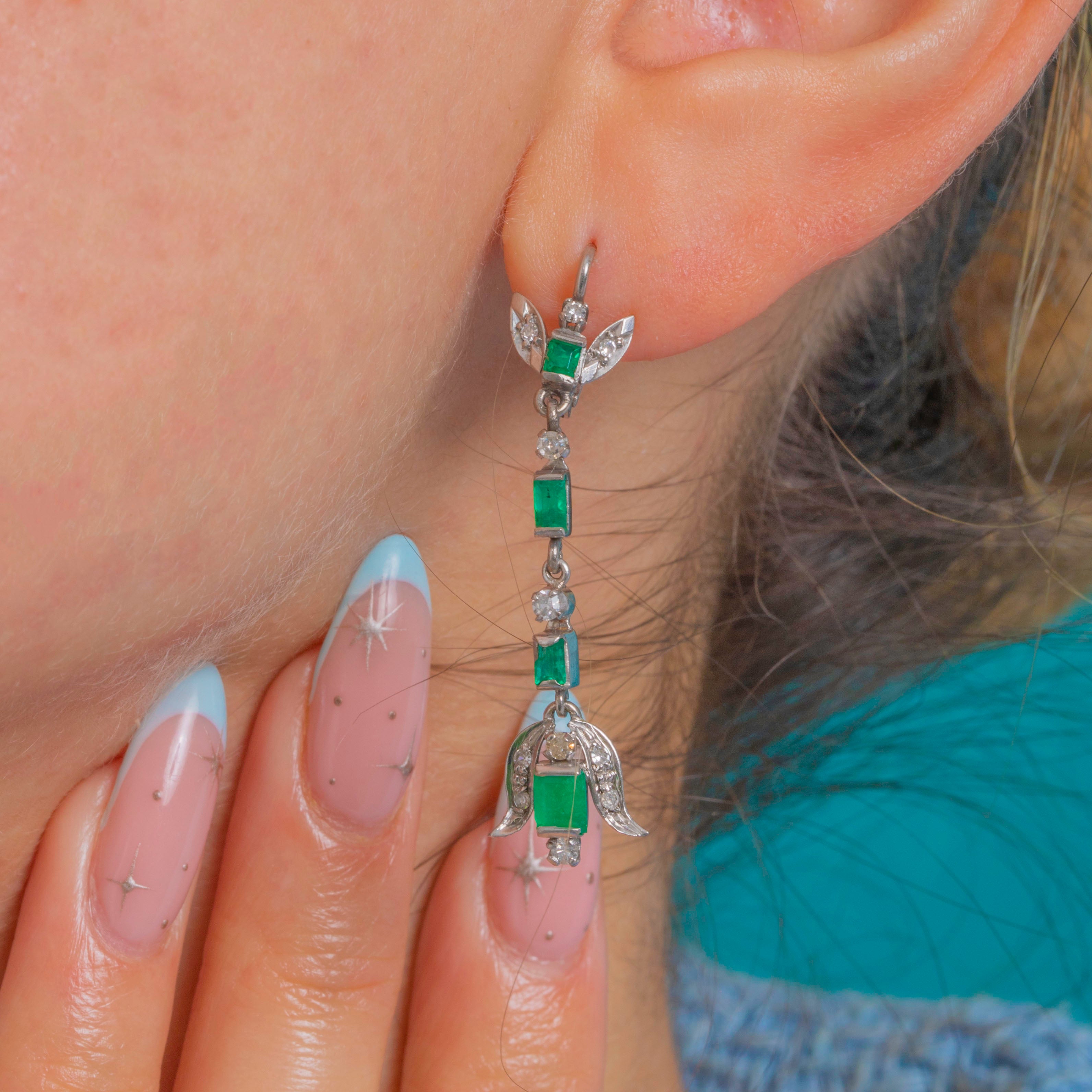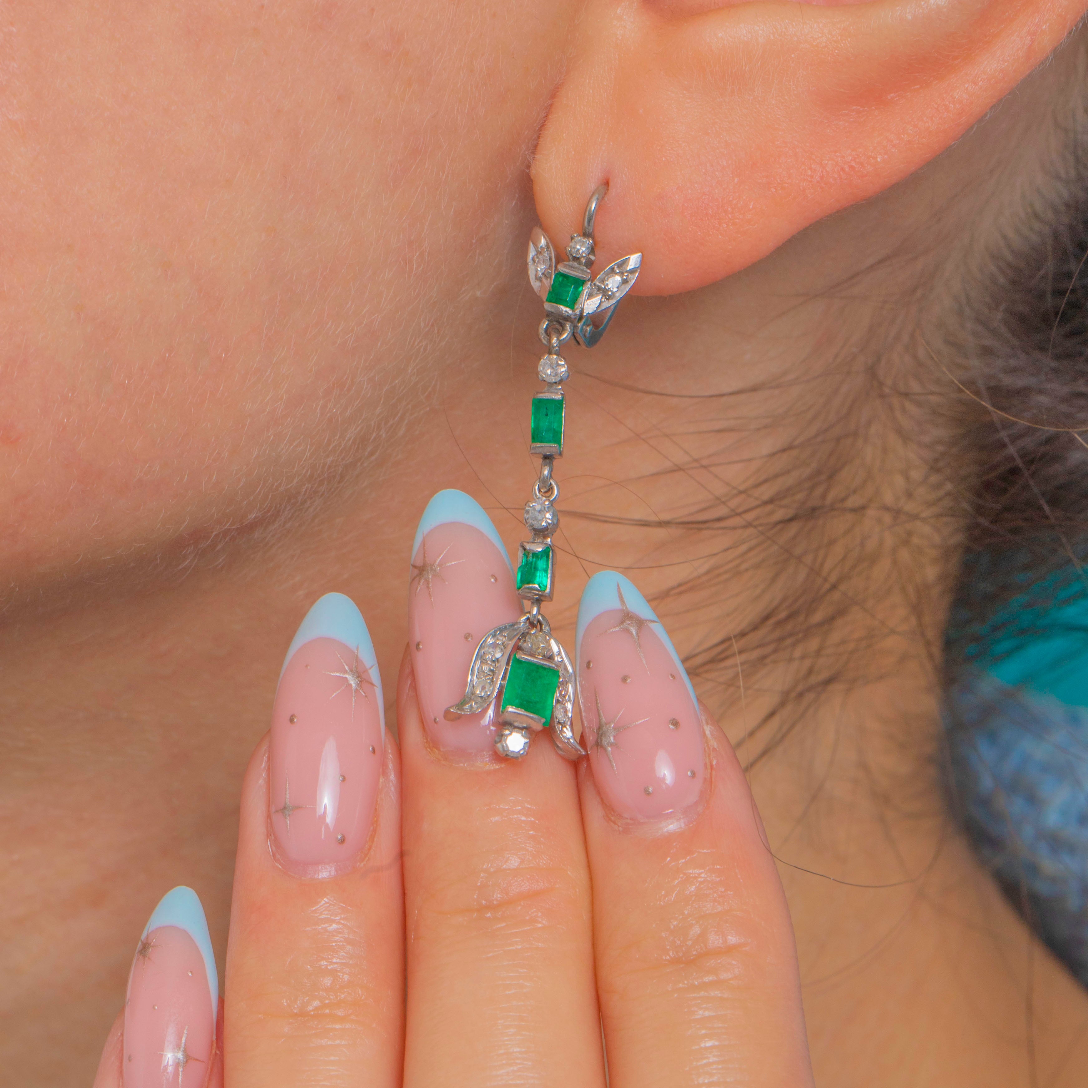Sleek, elongated and irresistibly Deco, these articulated drop earrings marry crisp geometry with delicate foliate flourishes. Crafted in 18ct White Gold with Platinum settings, a vertical line of step-cut Emeralds is punctuated by glittering Diamond spacers, flowing into a stylised bow/leaf motif finely edged with milgrain.