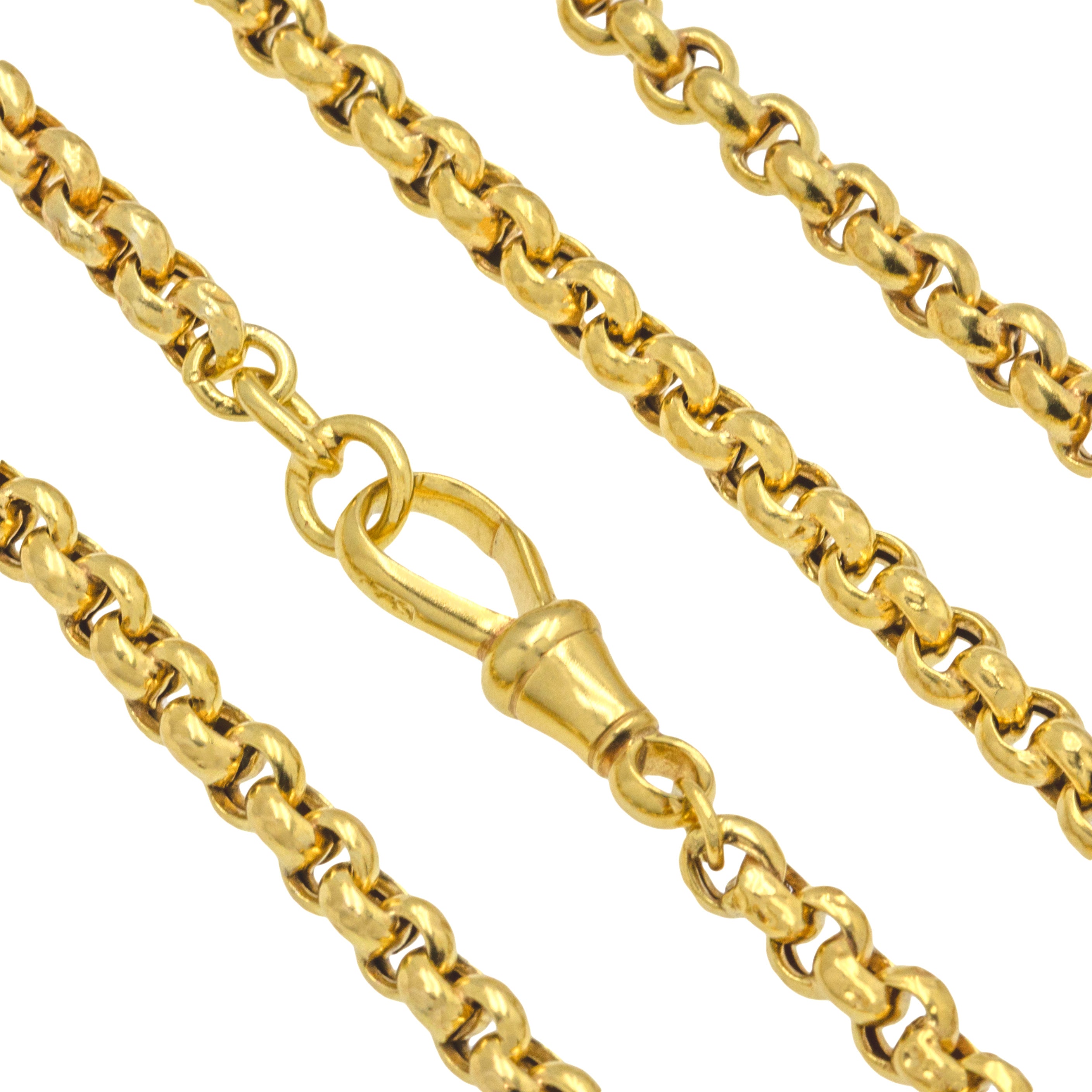 EXCELLENT. This 19" antique 9ct Gold belcher chain is offered in excellent condition. The chain has gorgeous secure links, and a smooth texture running through it, free from any dents. The dog clip is a wonderful colour match and in perfect working condition, and is complete with antique stamps! This Victorian belcher chain will make a gorgeous addition to your antique jewellery collection!