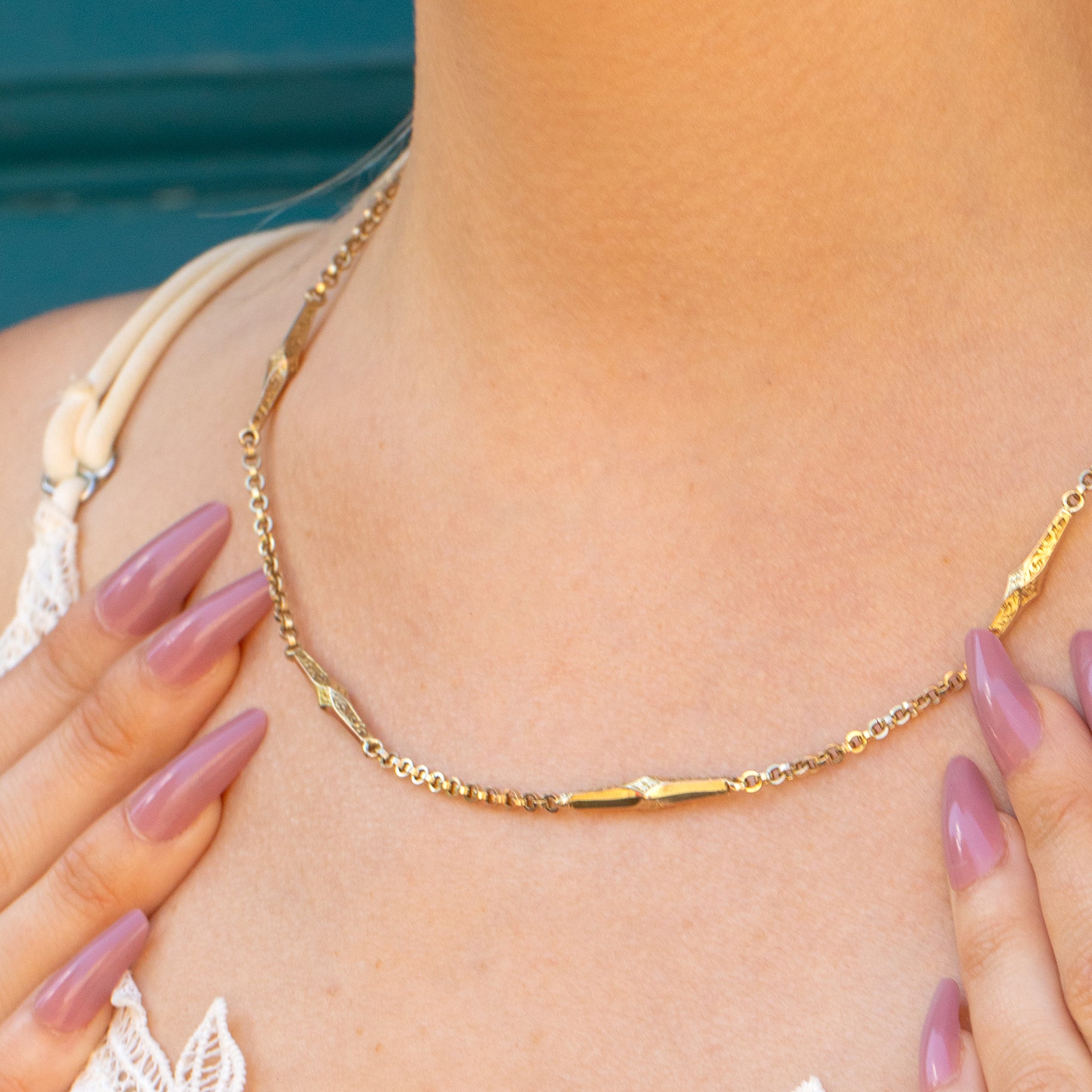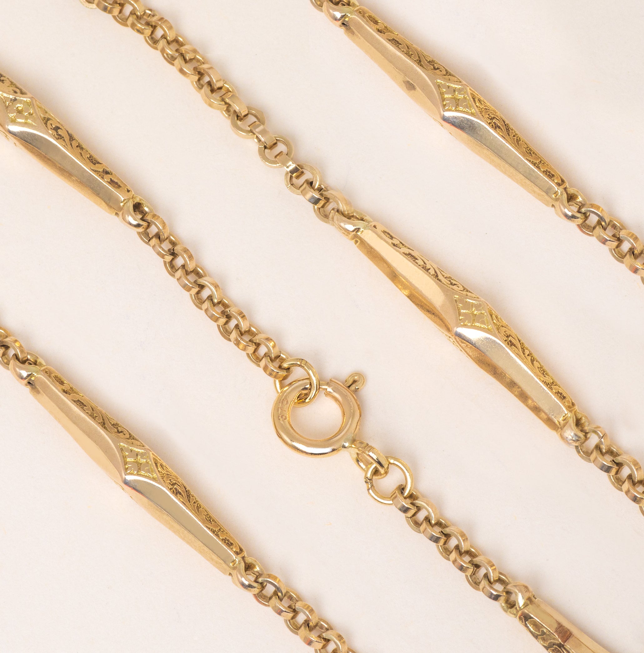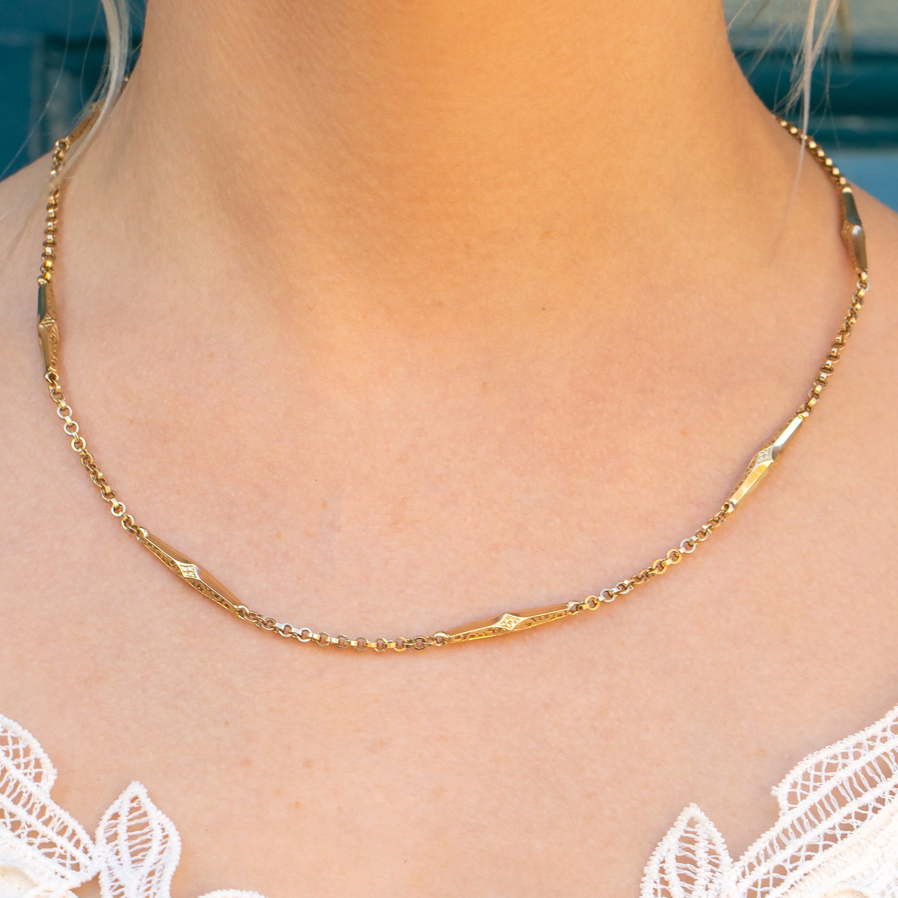 EXCELLENT. This antique 9ct Gold fancy engraved link chain is in excellent condition. The links are robust and securely connected, under close inspection some of the lozenge links have some small dings present and one of the links has been filed for previous testing, but this isn't obvious to the naked eye. With a fully functioning later-added bolt ring, you can wear this phenomenal Victorian Gold chain confidently for years to come!